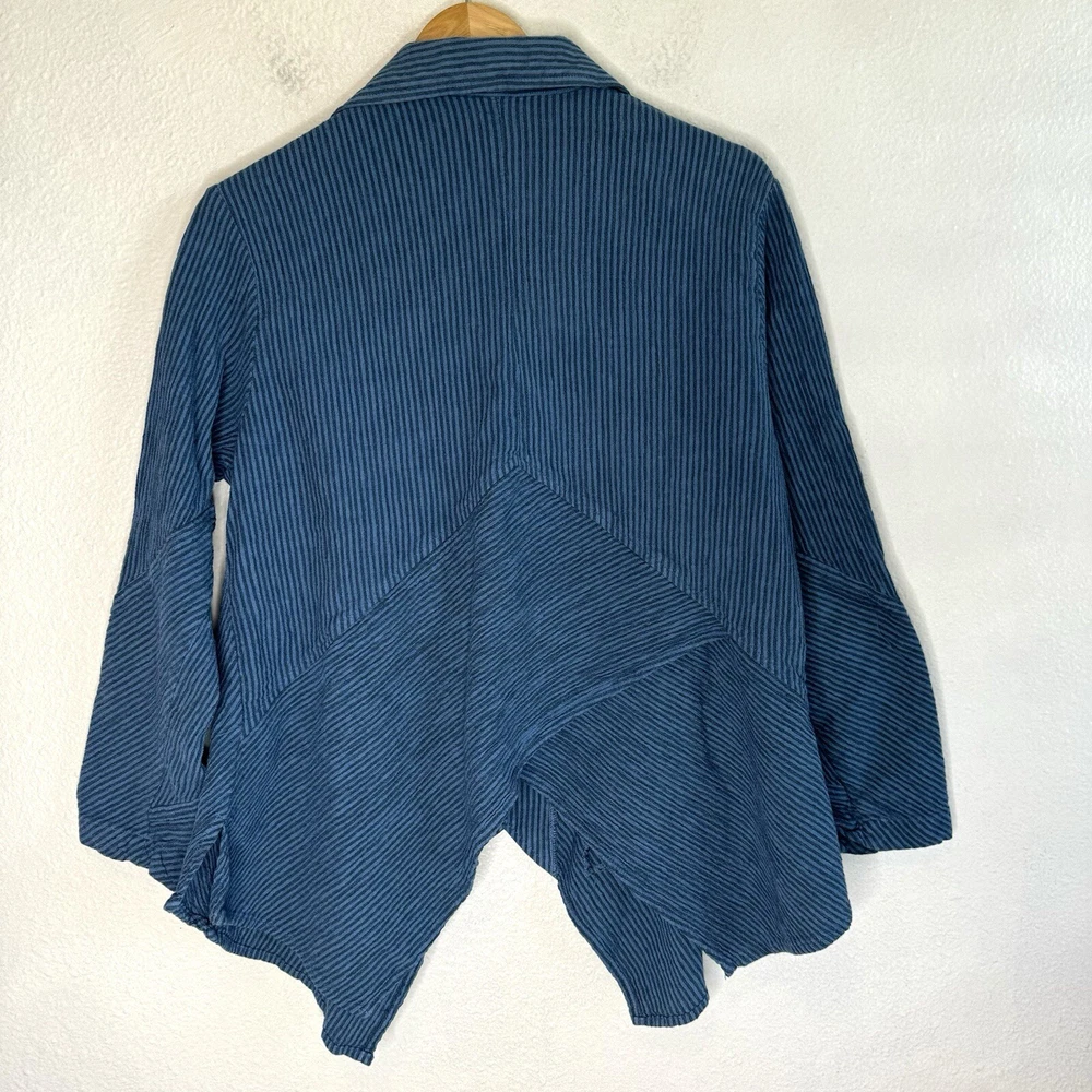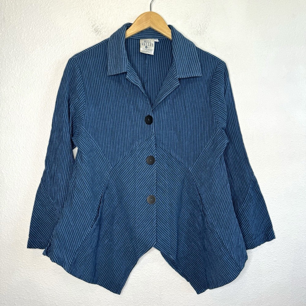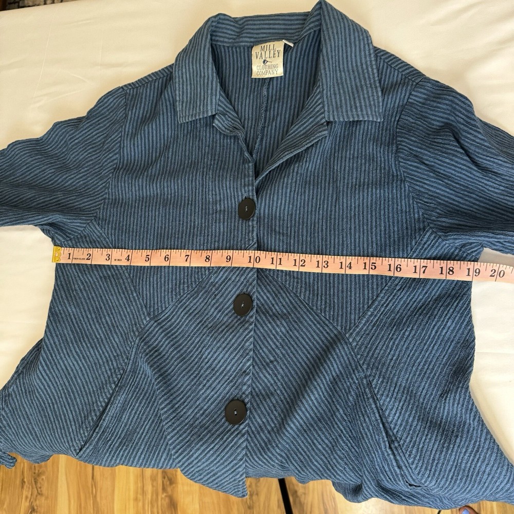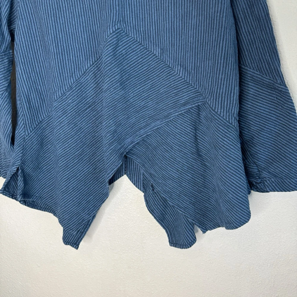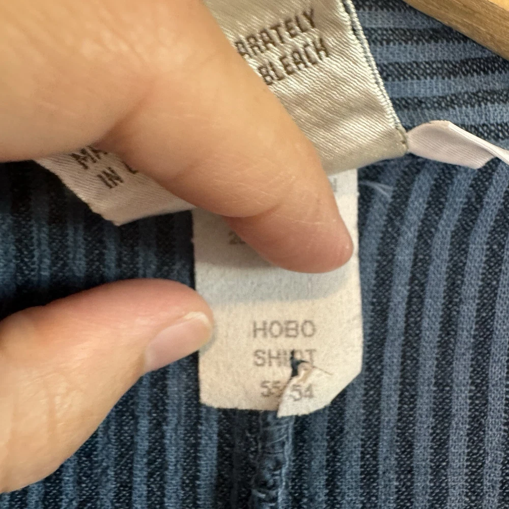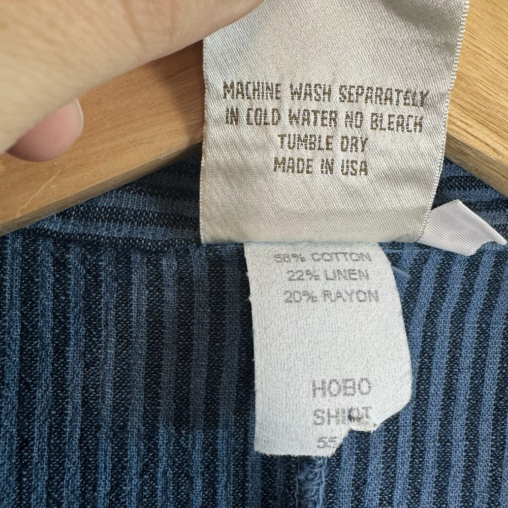 Mill Valley Clothing Company hobo shirt. Button front tunic with asymmetrical hem. Collared. Blue striped pattern. 58% cotton, 22% linen, 20% rayon. Made in USA. Size: Small please see photos for approximate measurements. Stripes - Lagenlook - Boho - Bohemian - Artsy - Art to wear