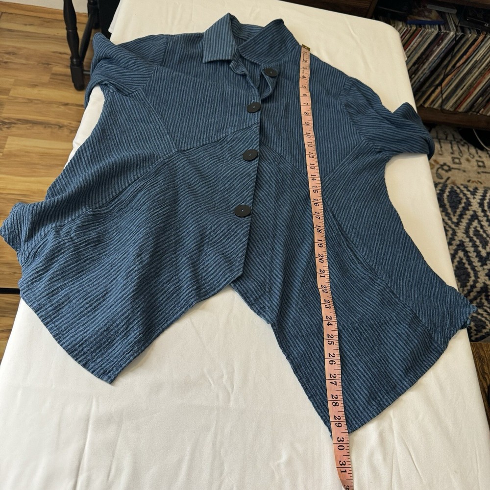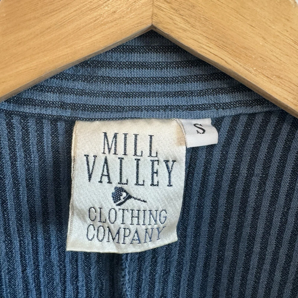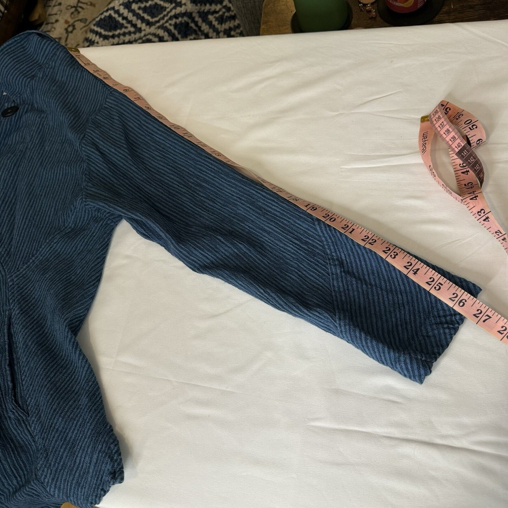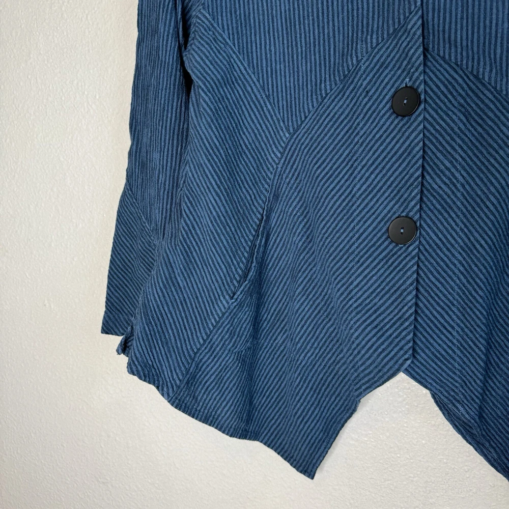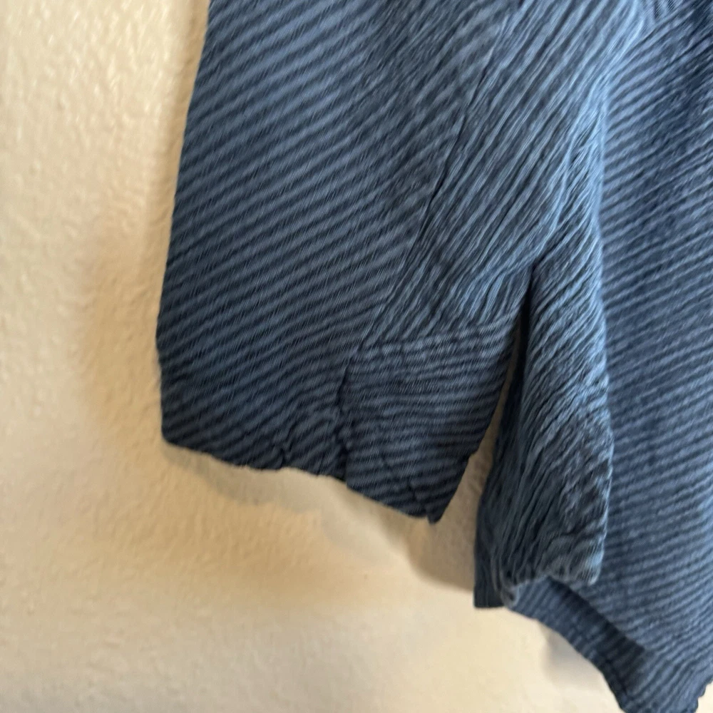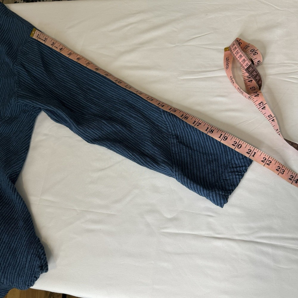 Mill Valley Clothing Company hobo shirt. Button front tunic with asymmetrical hem. Collared. Blue striped pattern. 58% cotton, 22% linen, 20% rayon. Made in USA. Size: Small please see photos for approximate measurements. Stripes - Lagenlook - Boho - Bohemian - Artsy - Art to wear