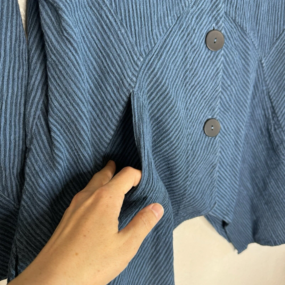 Absolutely love this boho-chic tunic! The soft, breathable fabric blend makes it so comfortable, and the asymmetrical hem adds a stylish touch. The blue stripes give it a fresh, artsy vibe—perfect for layering or wearing on its own. The quality is fantastic, and I appreciate that it’s made in the USA. Fits true to size and feels effortlessly cool. A must-have for any boho lover!