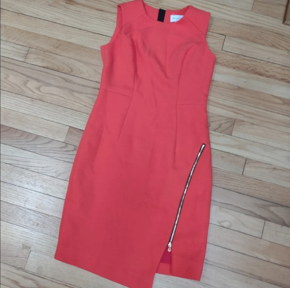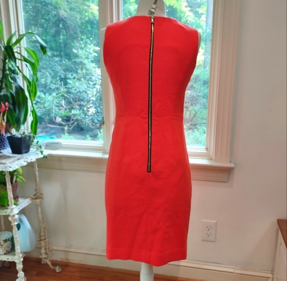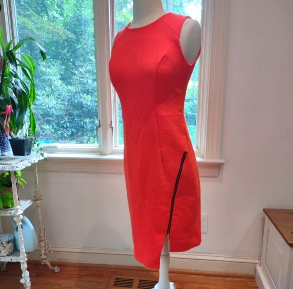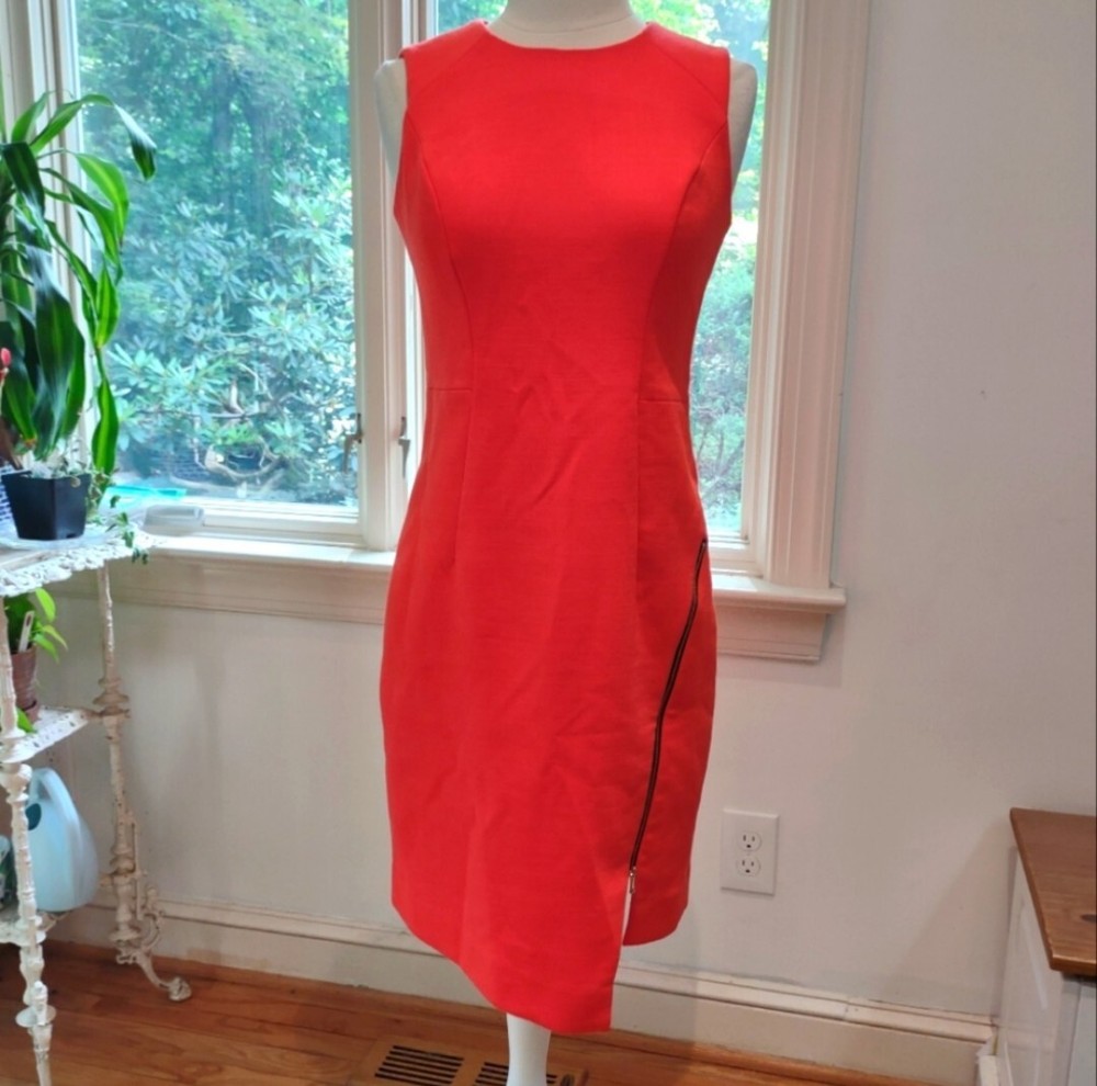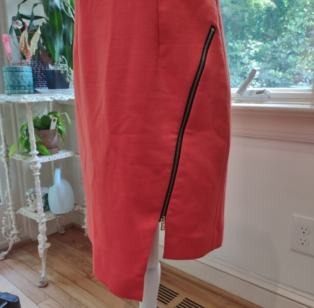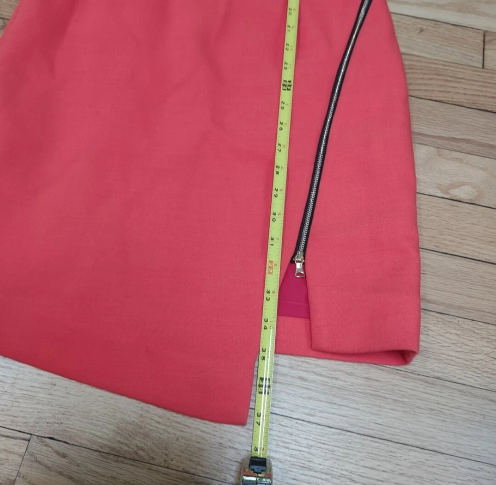 great condition. thick fabric. mix between red and orange. cool exposed zipper and asymmetrical front. runs big for size