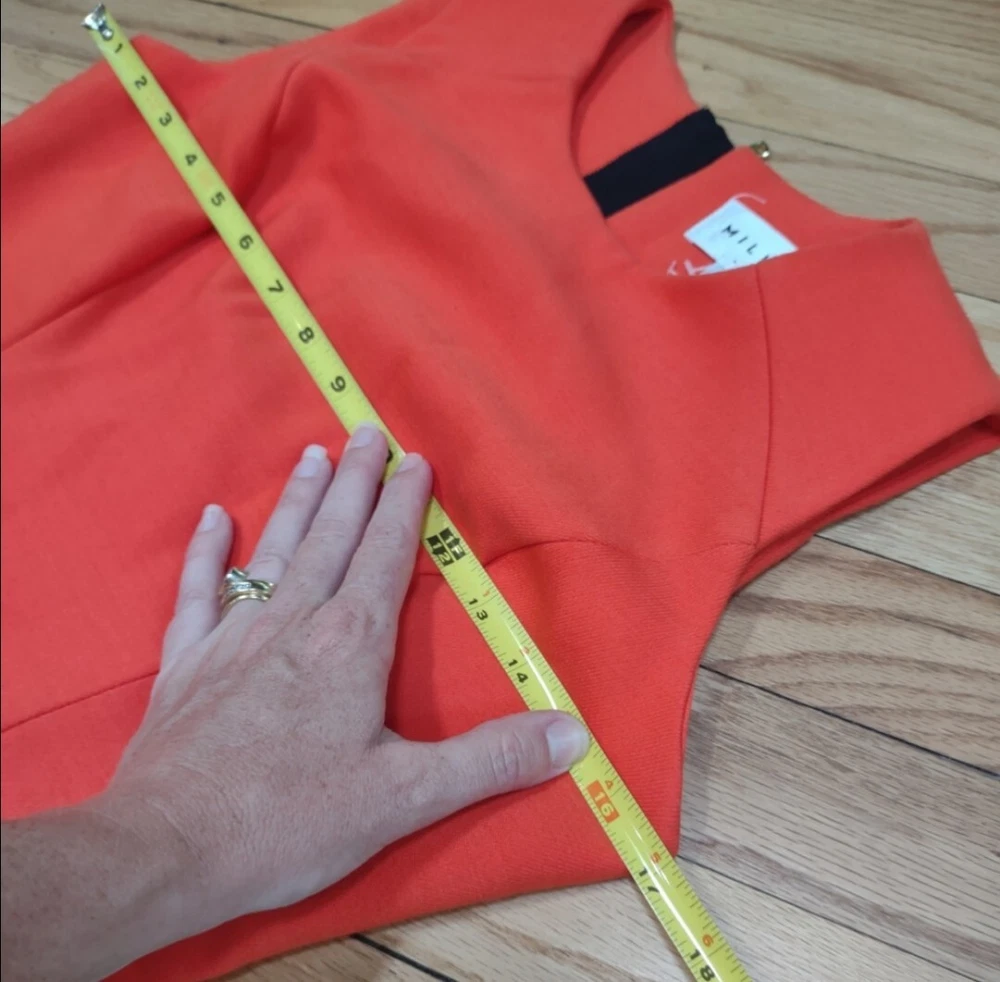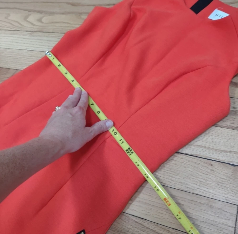 great condition. thick fabric. mix between red and orange. cool exposed zipper and asymmetrical front. runs big for size...