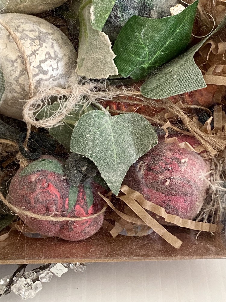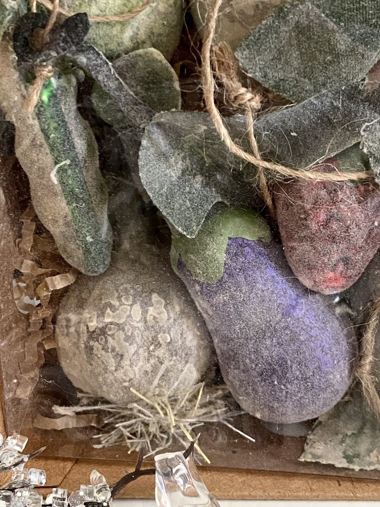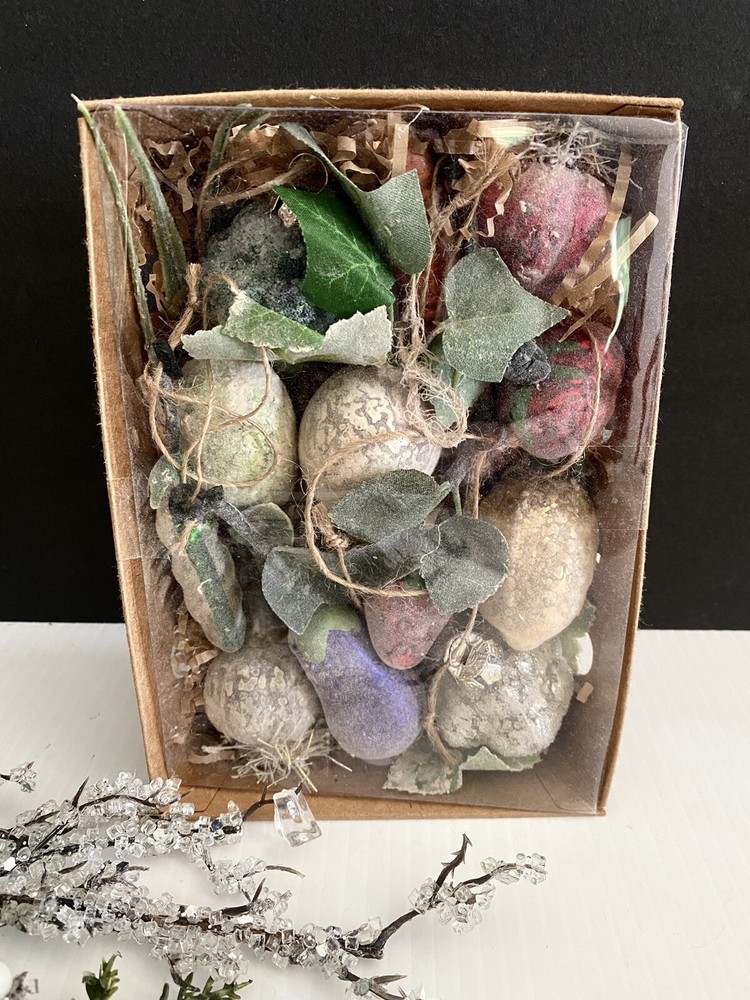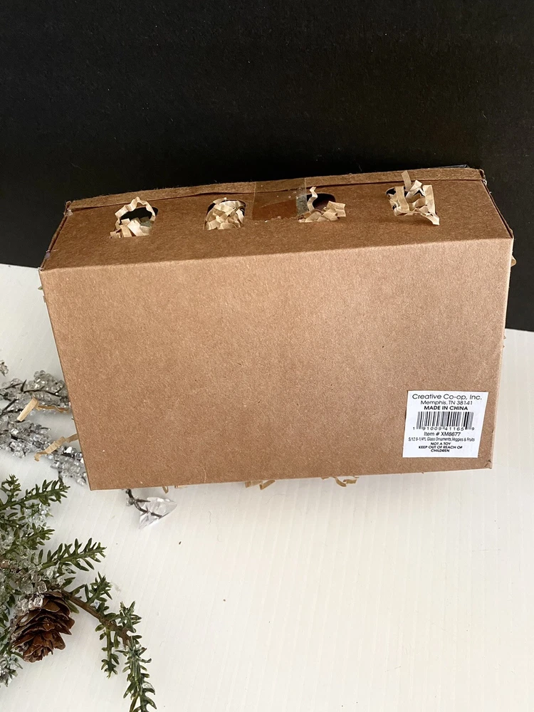 These ornaments are new in box! They are in a cardboard type crate container… one similar to what you would find fresh garden vegetables and fruits in. These are miniature.. 1-3L… and have an aged molted frosted look… brand is Creative Co-op..view photos for details. I brr we lived there are roughly 12 pieces… it’s hard to tell… Thank you for viewing! Item ships usps ground or priority. #422#840chornbox/1178/1.7