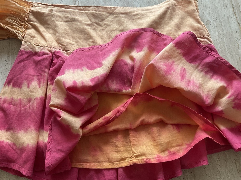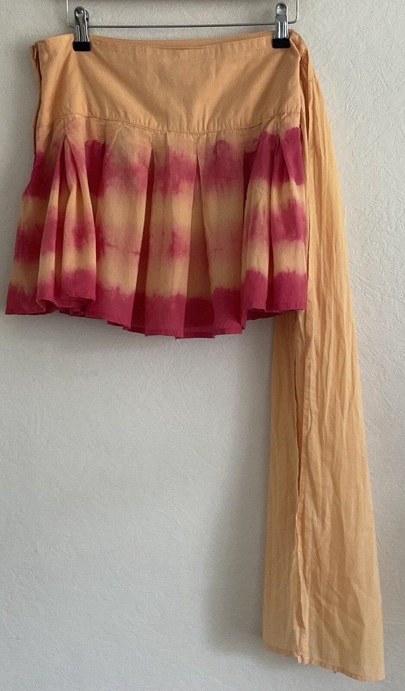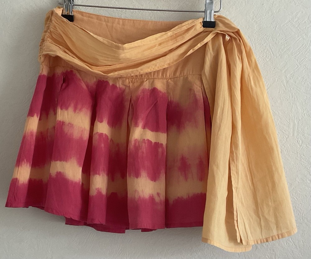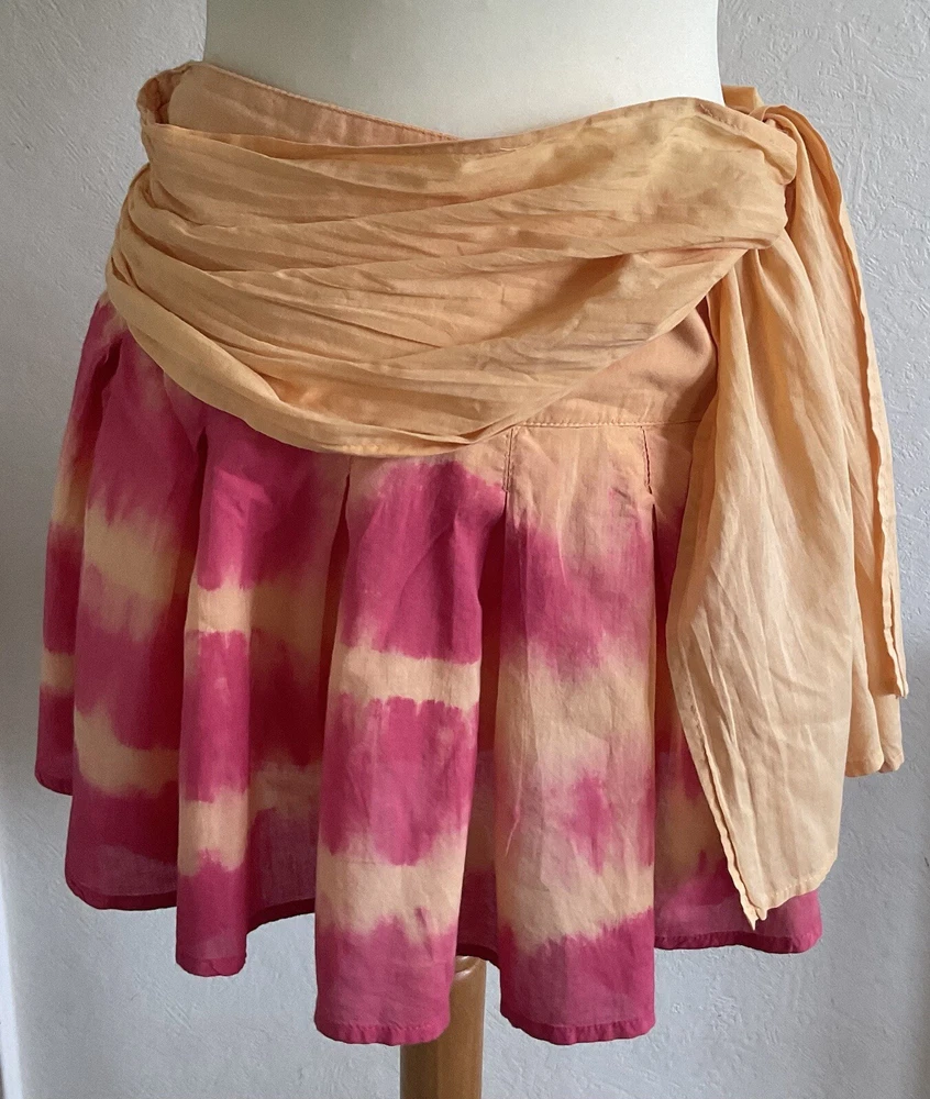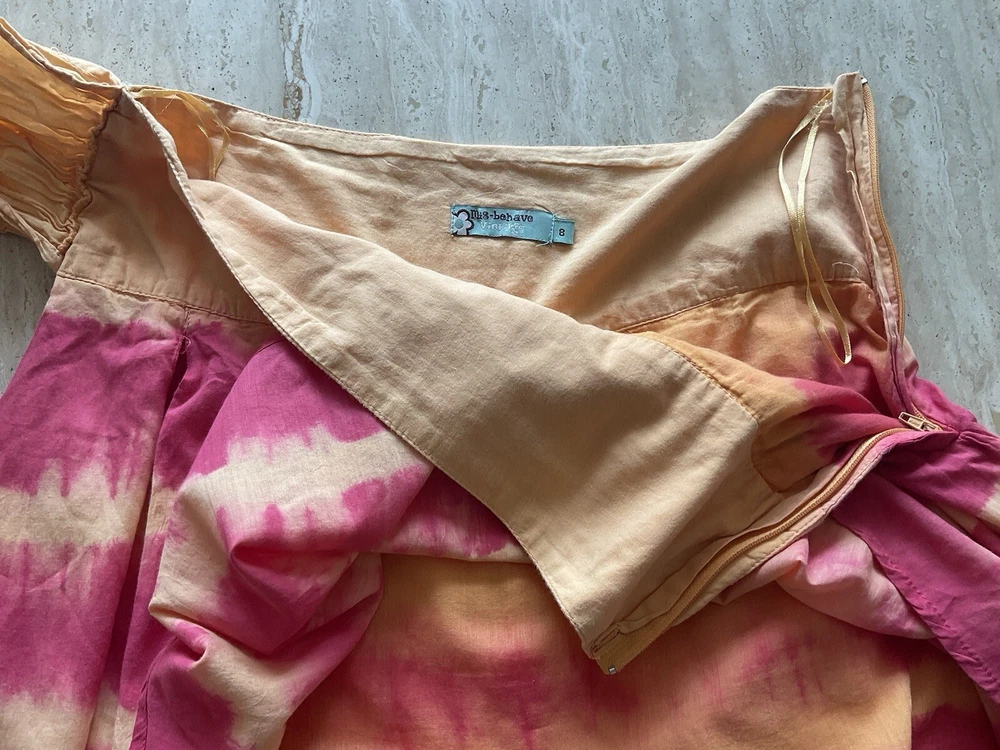Add a pop of colour to your wardrobe with this vintage tie-dye mini skirt from Mis-behave. In a vibrant orange mix, this skirt is perfect for a casual occasion and can be worn throughout the year with its lightweight fabric and fixed belt/waist tie the skirt can be worn in a variety of ways. The skirt is made from 100% cotton and features a mid-rise waist, making it a comfortable fit for all seasons. The skirt has a side zip closure and is lined for extra comfort. Its short length and stylish design make it a great addition to any outfit. Hand wash only to keep the skirt looking its best. Perfect for a day out with friends or a night on the town, this skirt is a must-have for any fashion-forward woman. In good, clean condition. Skirt measures 38cm/15” from waist to hem.