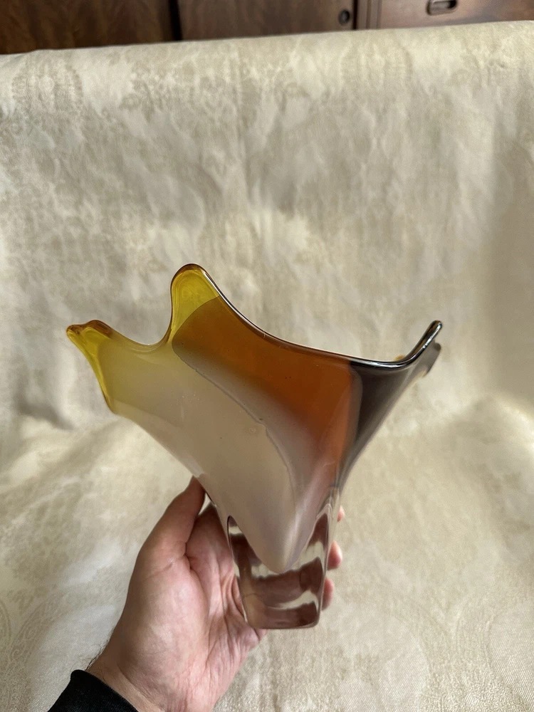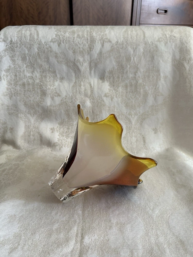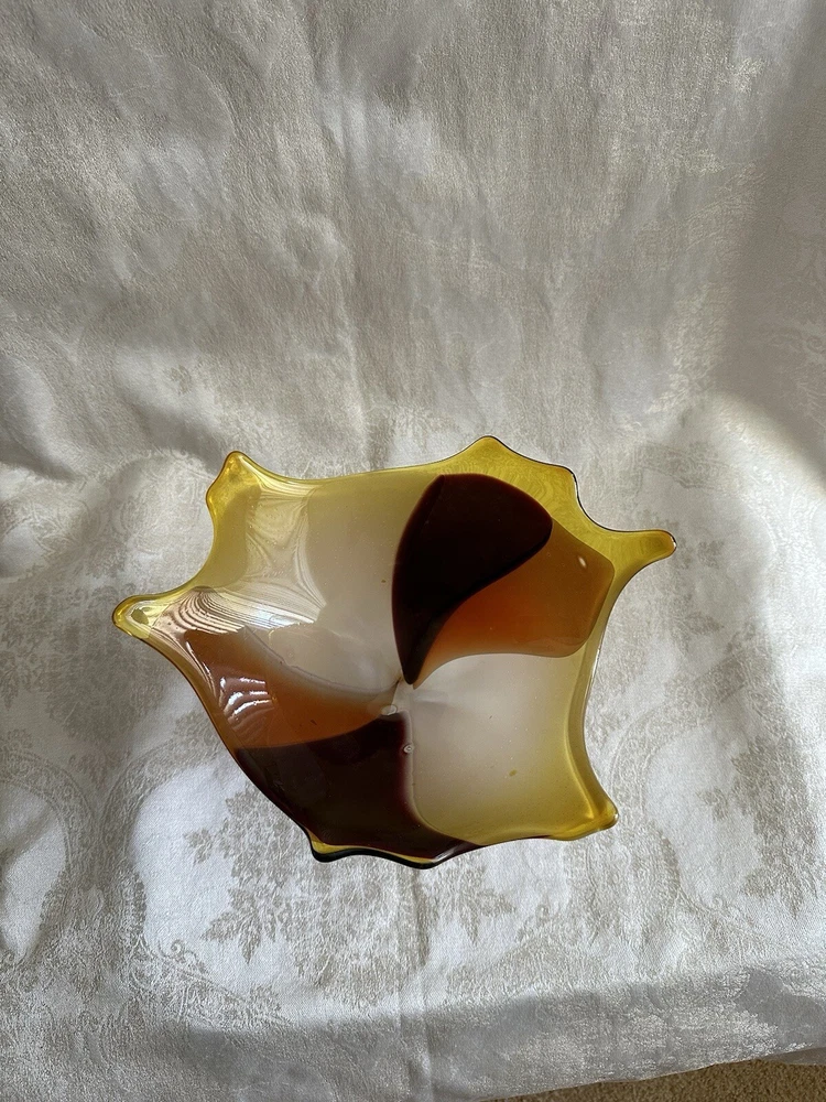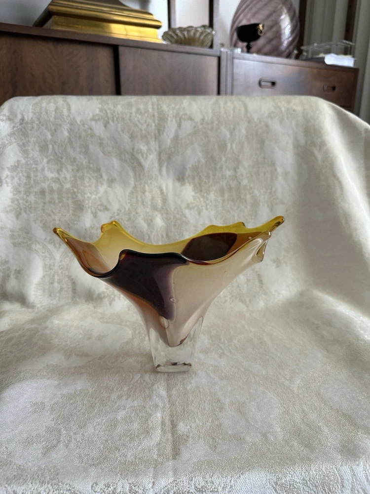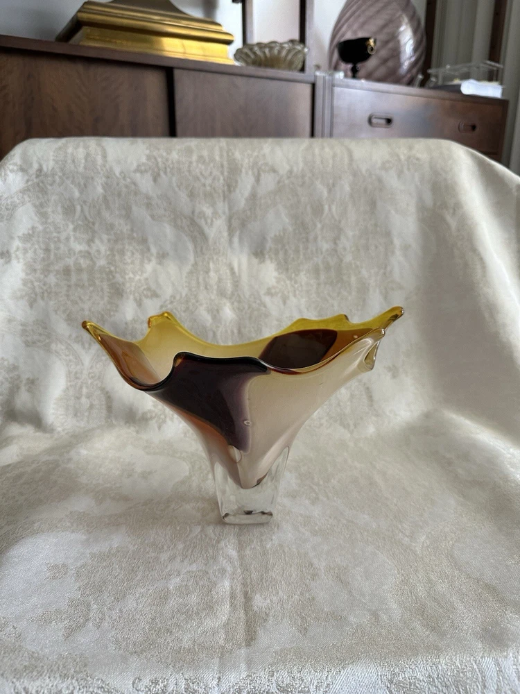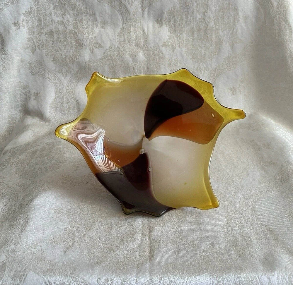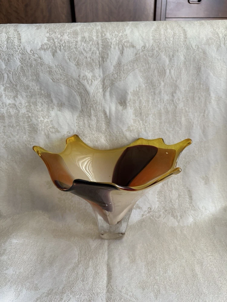 Vintage Art Glass Decorative Bowl - Decorator Piece Mid Century Modern Style I believe this to be a contemporary art glass piece. I purchased this for a design job because of the colors. Browns, golds, yellows and oranges. Abstract modern design. Works well with contemporary, mid-century modern, post modern and vintage aesthetics. Probably made in the last 30 years. A very attractive piece of art glass. Various uses. Great for display About 6" tall, freeform top is 11" x 9". Has good weight. Excellent condition with light wear. No major damage or issues. Only used for display. **Heavy. I will only charge actual shipping costs. Whatever overage there is, I will gladly refund** I ship items once a week, at the end of the week. Please message with questions. Thanks so much.