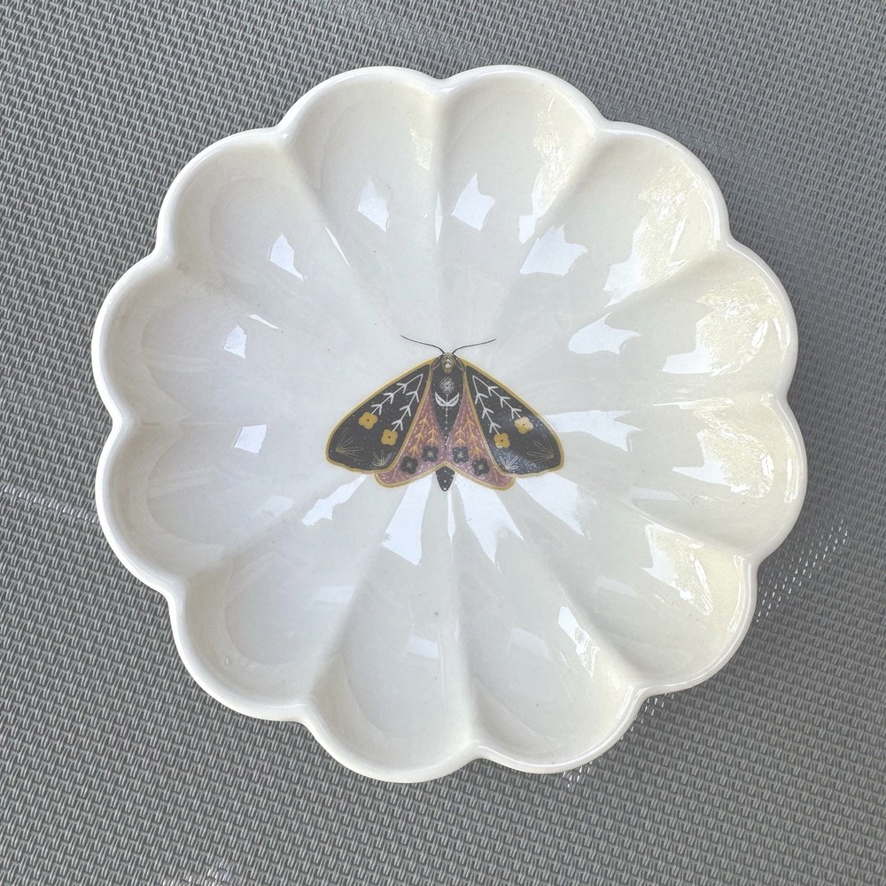 Add a touch of elegance to your home decor with this beautiful Moth Stoneware Scalloped Jewelry/Trinket/Soap Dish. Crafted from high-quality stoneware, this dish features a unique scalloped edge and a white color that complements any decor. The dish measures 4 3/4" in diameter, making it perfect for storing your small jewelry items, trinkets, or even as a soap dish in your bathroom. The dish is part of the Secret Garden product line by Creative Co-Op and features a beautiful moth character design that adds a touch of whimsy to your home. Made in China, this trinket dish is a must-have for any home decor enthusiast. Please ask all questions prior to purchasing, as all sales are final. I usually ship within one day of receiving payment. Item will ship U.S. Postal Service Ground Advantage Mail with tracking.