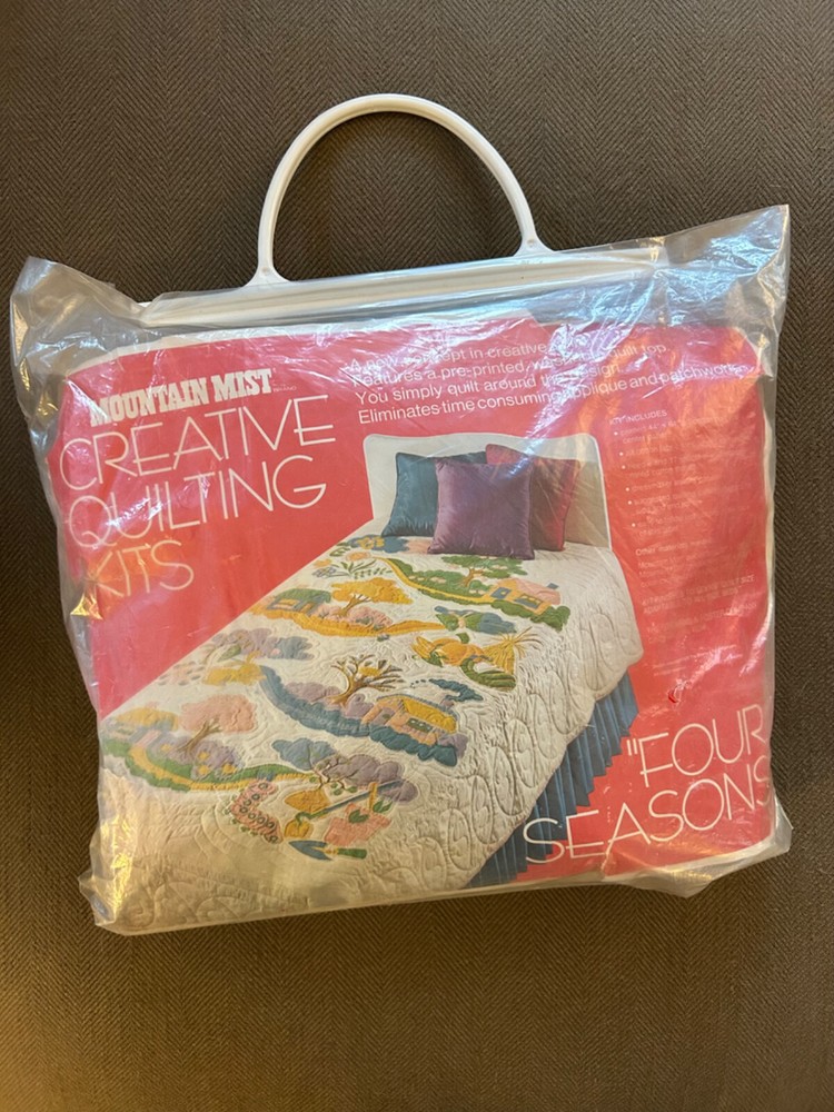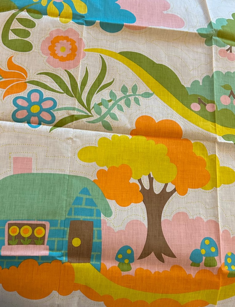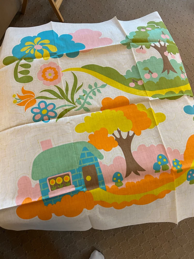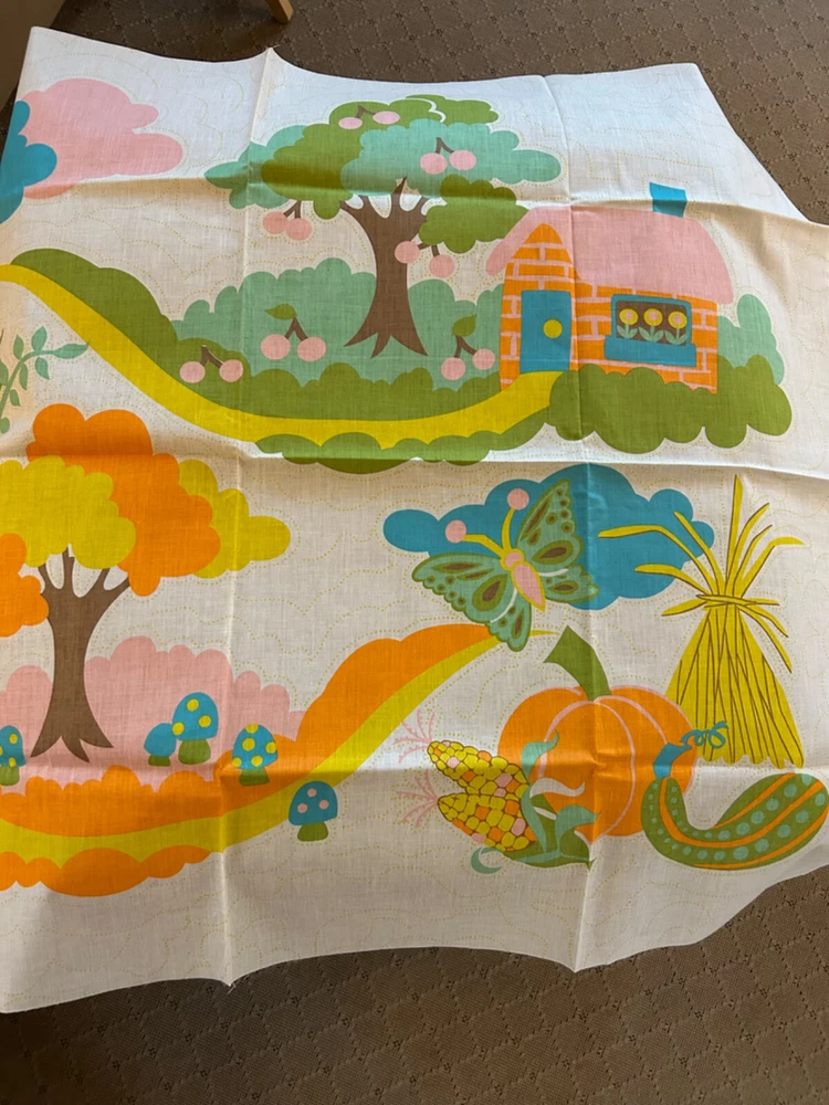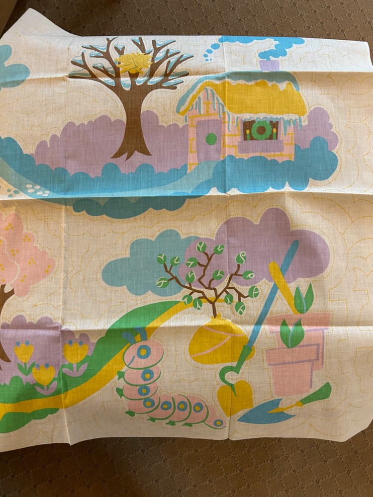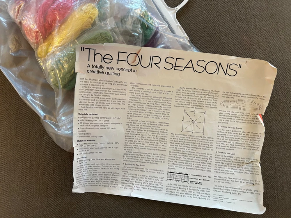Amazing 1972 Stearns &Foster Quilt Kit that finishes to 88" x 106" quilt cover with pre-printed, washable top. Step into the 70s with this design – bright fluffy clouds, colorful mushrooms, happy cottages meet cheerful flowers, butterflies, caterpillars and harvest fruit. It's all illustrating the "Four Seasons". Love this for the fabric alone!! Not sure it's 100% there, but seems to have quilt top, paneling, spools of thread, pattern and instructions. Needs Batting, Quilt Backing, Bias Binding Tape and possibly a needle.