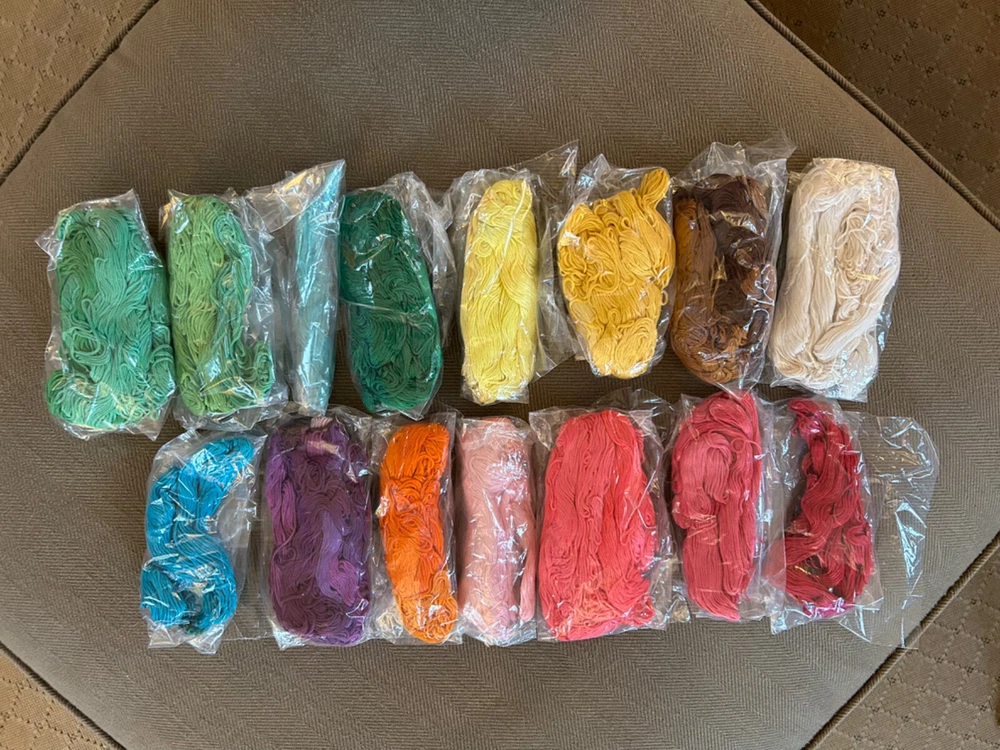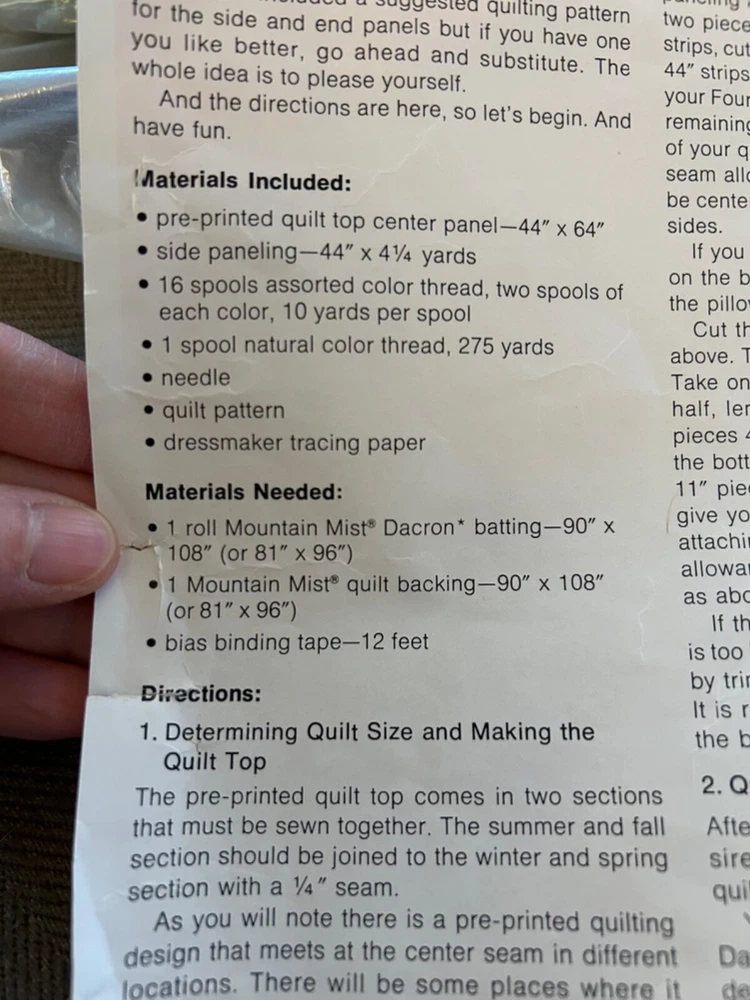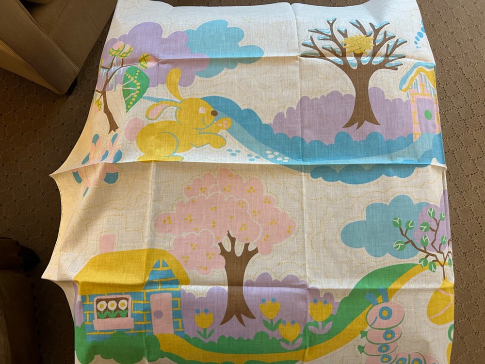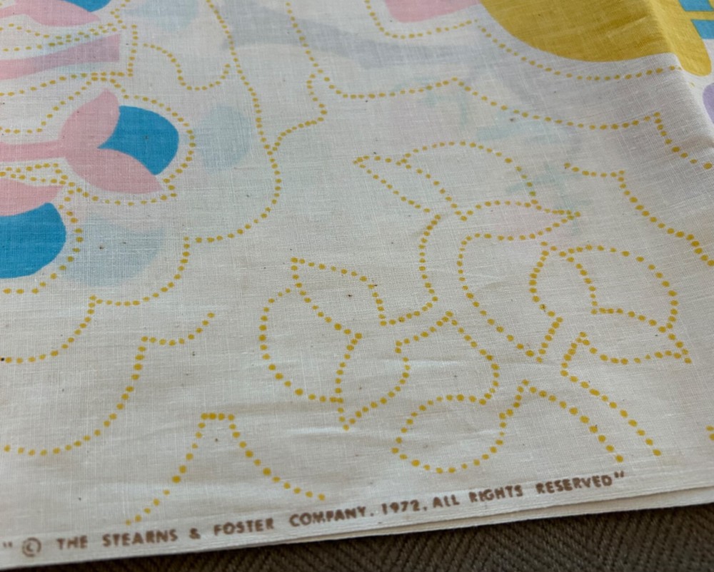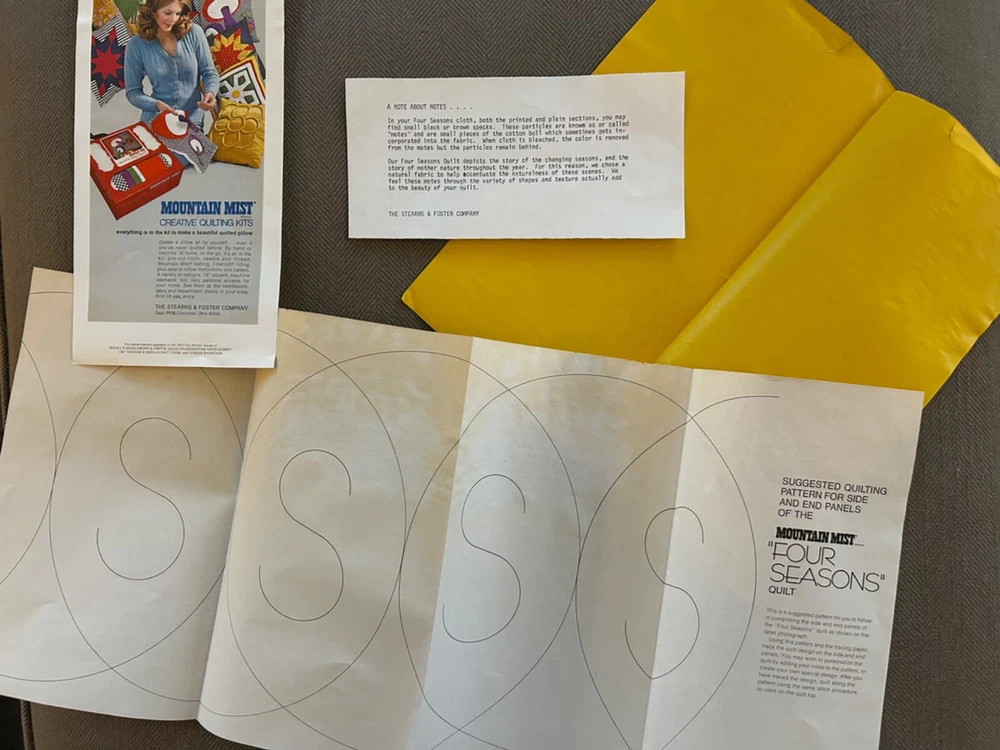 Amazing 1972 Stearns &Foster Quilt Kit that finishes to 88" x 106" quilt cover with pre-printed, washable top. Step into the 70s with this design – bright fluffy clouds, colorful mushrooms, happy cottages meet cheerful flowers, butterflies, caterpillars and harvest fruit. It's all illustrating the "Four Seasons". Love this for the fabric alone!! Not sure it's 100% there, but seems to have quilt top, paneling, spools of thread, pattern and instructions. Needs Batting, Quilt Backing, Bias Binding Tape and possibly a needle.