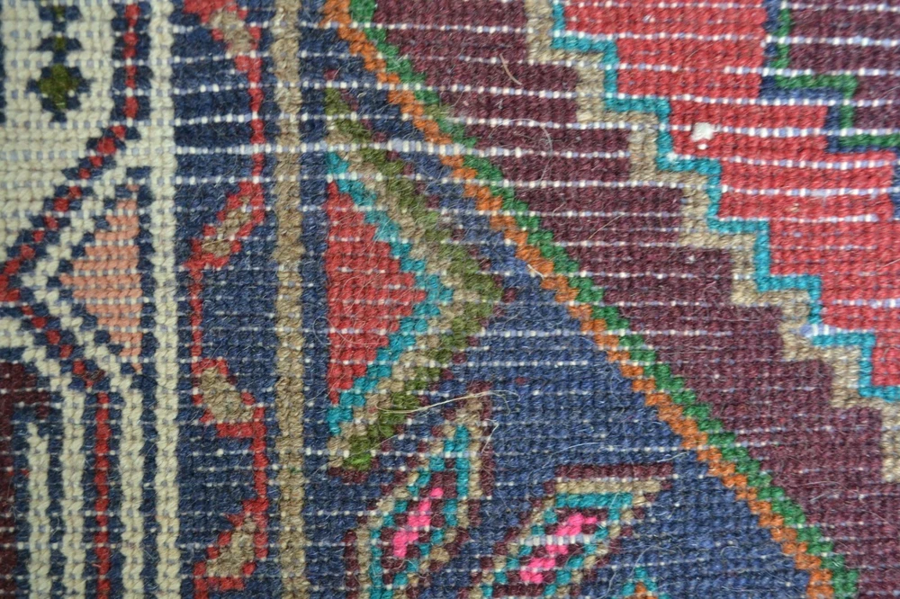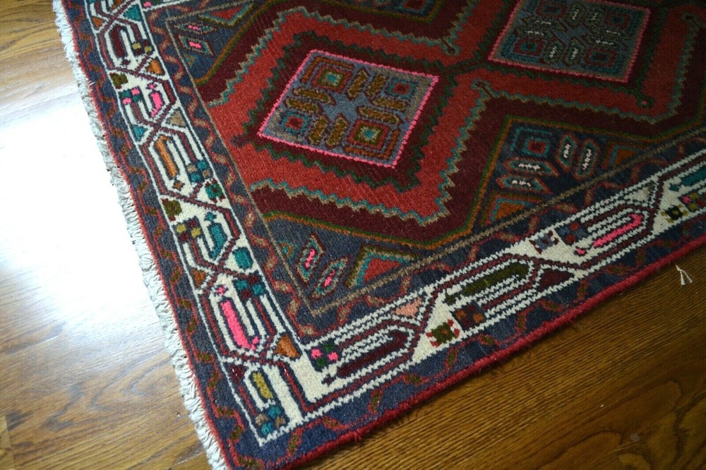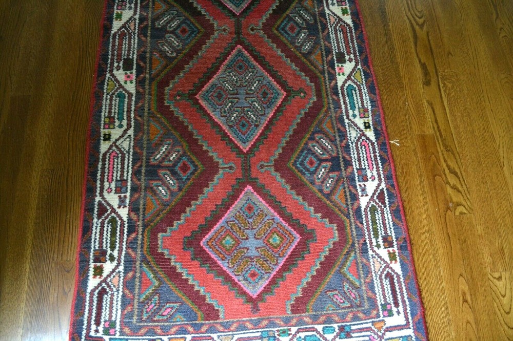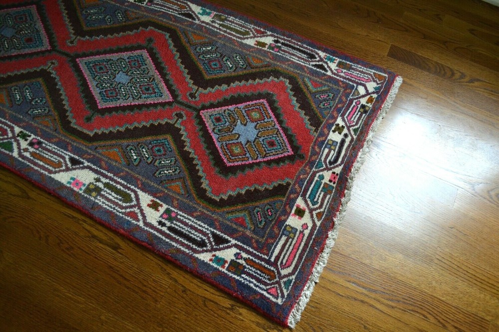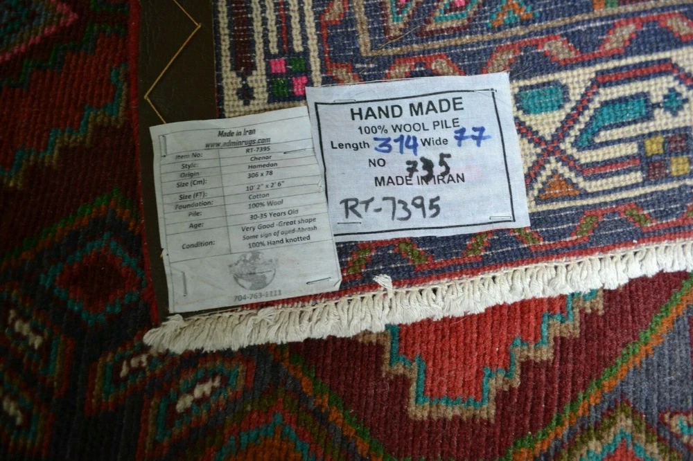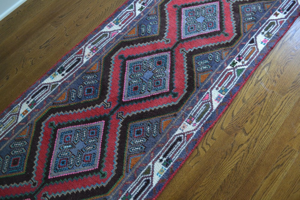 Great antique tribal geometric design runner. Unique colors. Maroon, ivory, pink, purple-ish/blue, orange, teal, etc. 2'6" x 10'2". Chenar Hamedan. 100% wool. Cotton backing. Hand knotted....