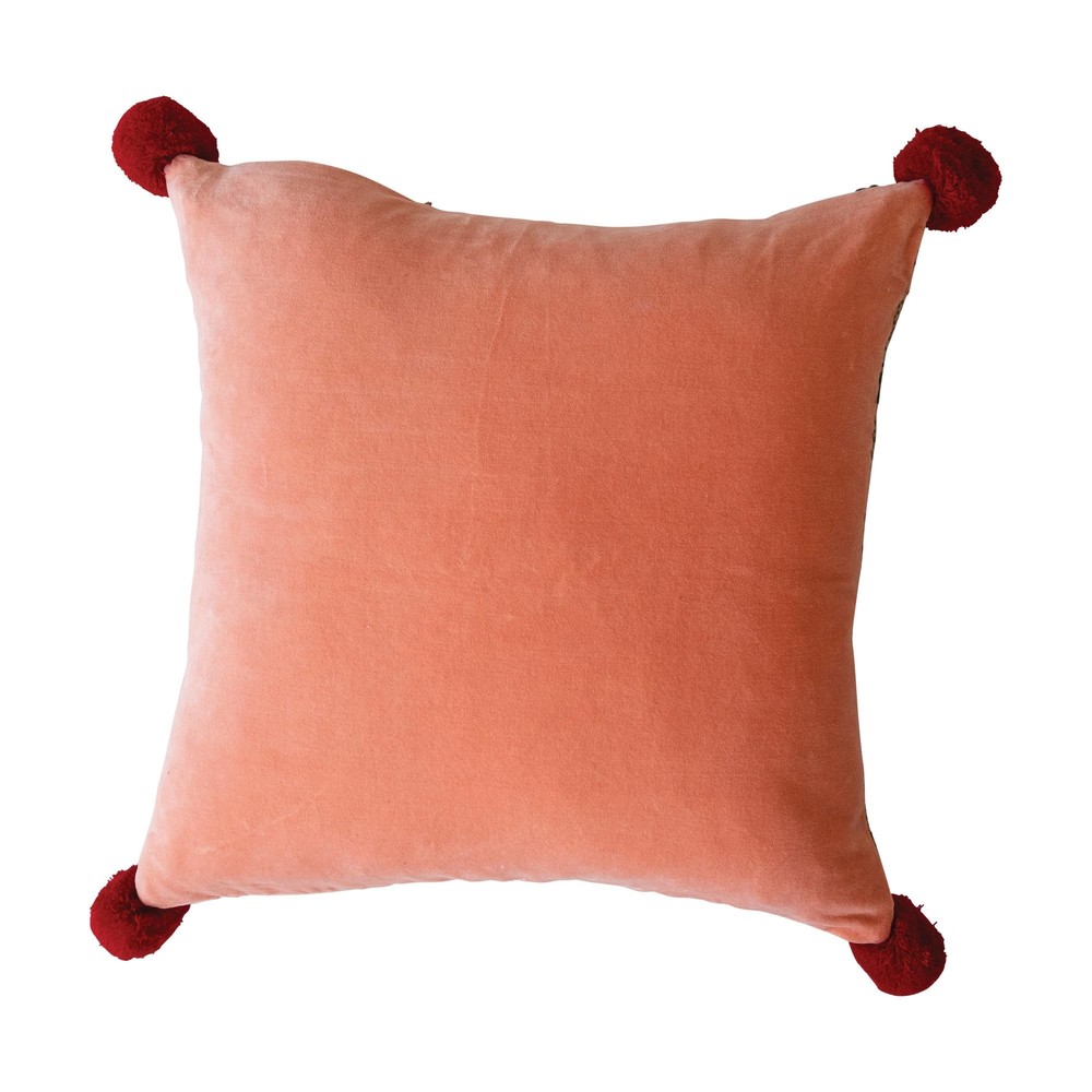 This square pillow captures the essence of modern elegance with its woven acrylic jacquard front, showcasing a stunning pattern highlighted by metallic gold thread embroidery. The reverse side is just as delightful, with a pink cotton velvet that feels as good as it looks. Each corner is finished with a charming pom pom, adding a playful note to this sophisticated piece. Whether it's accenting the living room sofa or adding a splash of color to any bedroom, this pillow is sure to enchant. The luxurious texture and attention to detail make this pillow a versatile and stylish addition to any room in the home. Elevate the decor with this unique and eye-catching accent piece. A luxurious woven acrylic jacquard pillow, adorned with a mesmerizing pattern and shimmering metallic gold thread embroidery An opulent addition to any room, this pillow pairs beautifully with rich, solid-colored textiles and elegant deco A plush polyester fill gives this pillow a full, firm shape A blend of premium materials, featuring a cotton blend cover and a resilient polyester fill for lasting comfort 18” L x 18” W