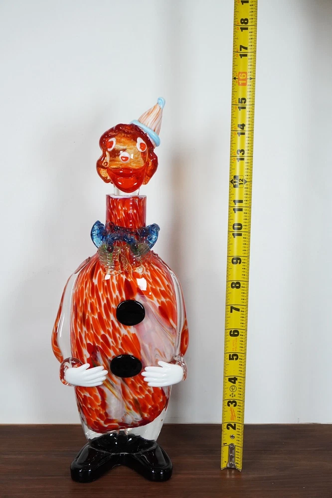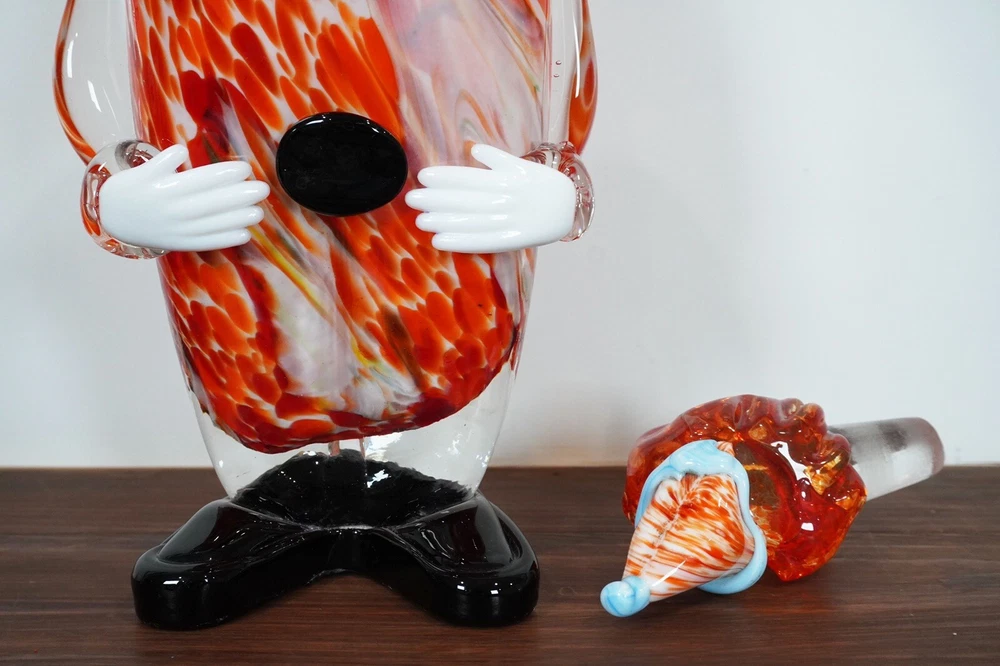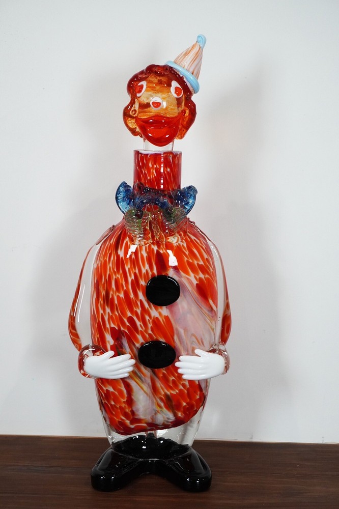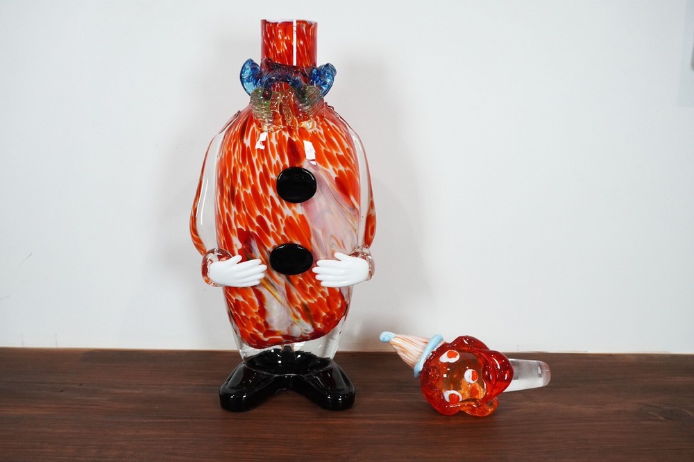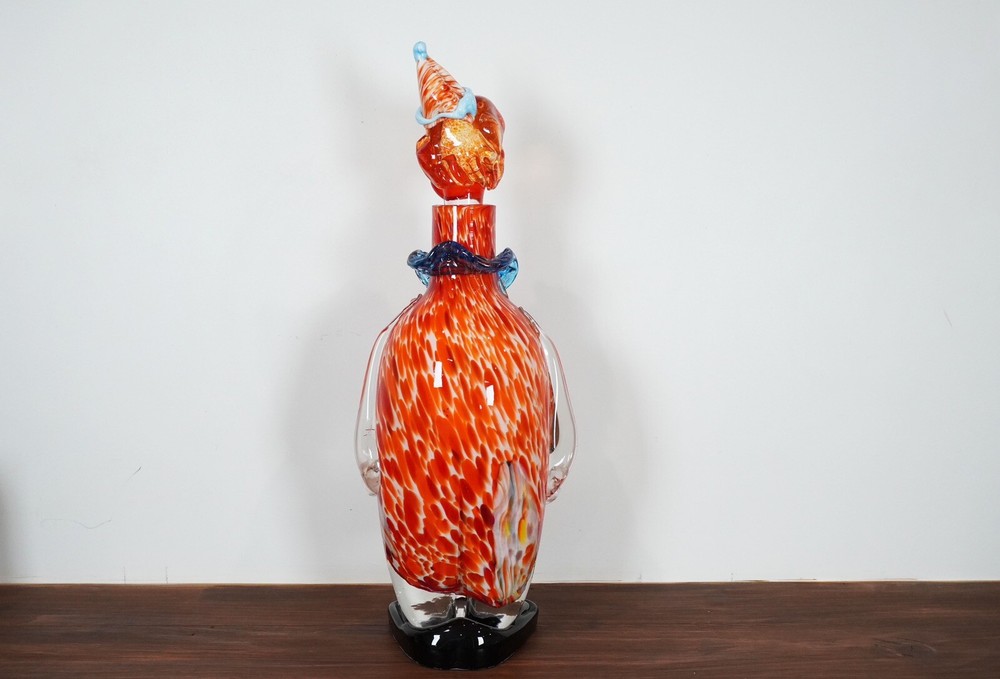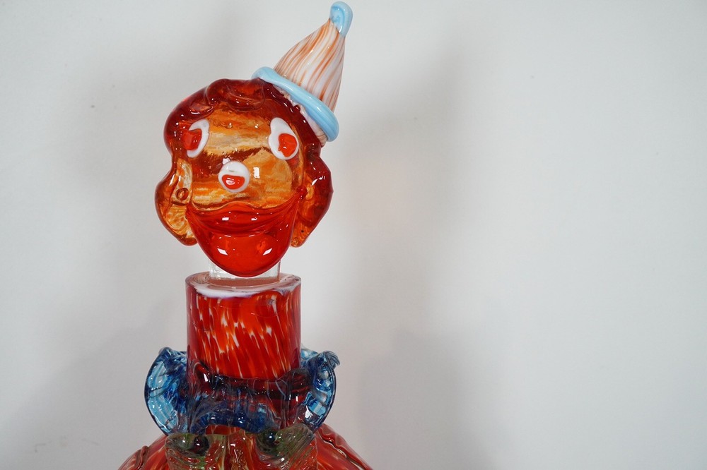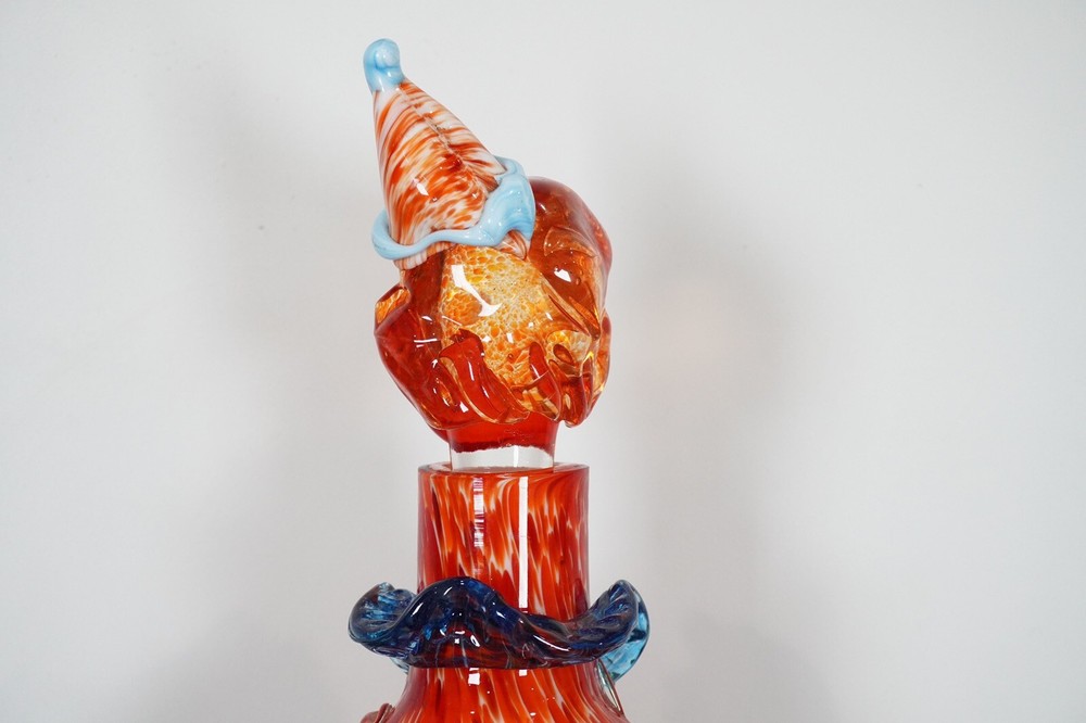 Good pre-loved condition. This is a unique Murano Art Glass decanter in the shape of a clown, hand-blown in Italy during the Mid-Century Modernism era. The decanter stands at 15 inches tall and features a vibrant orange color, adding a pop of color to any barware collection. This one-of-a-kind piece is handmade and comes with a set of glasses, making it a functional and artistic addition to your home decor.
