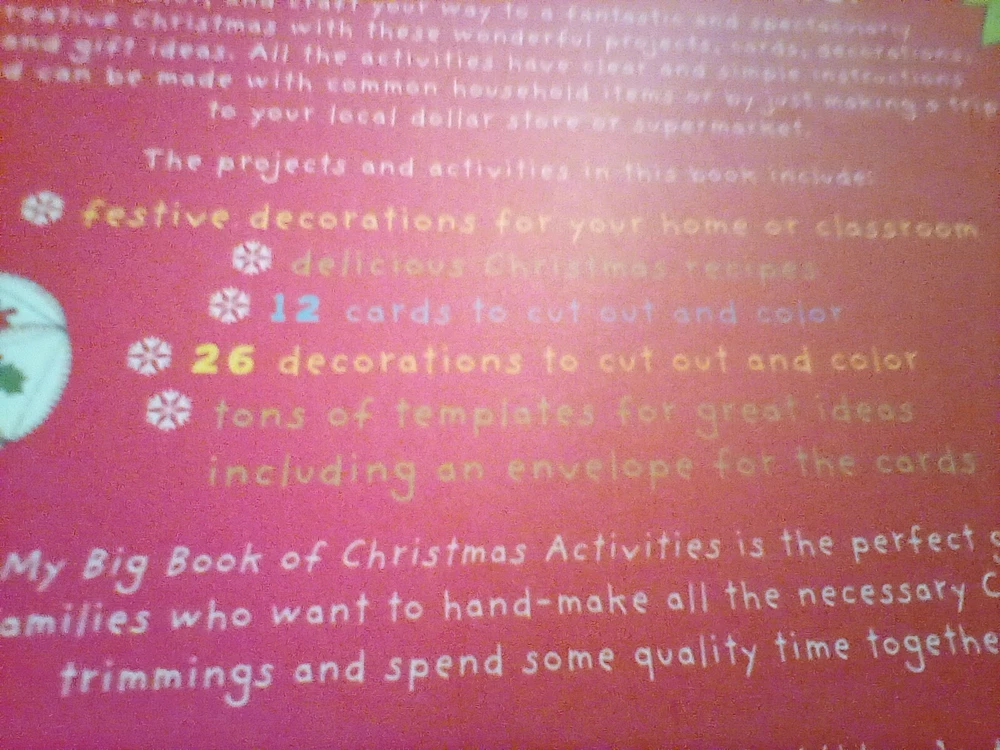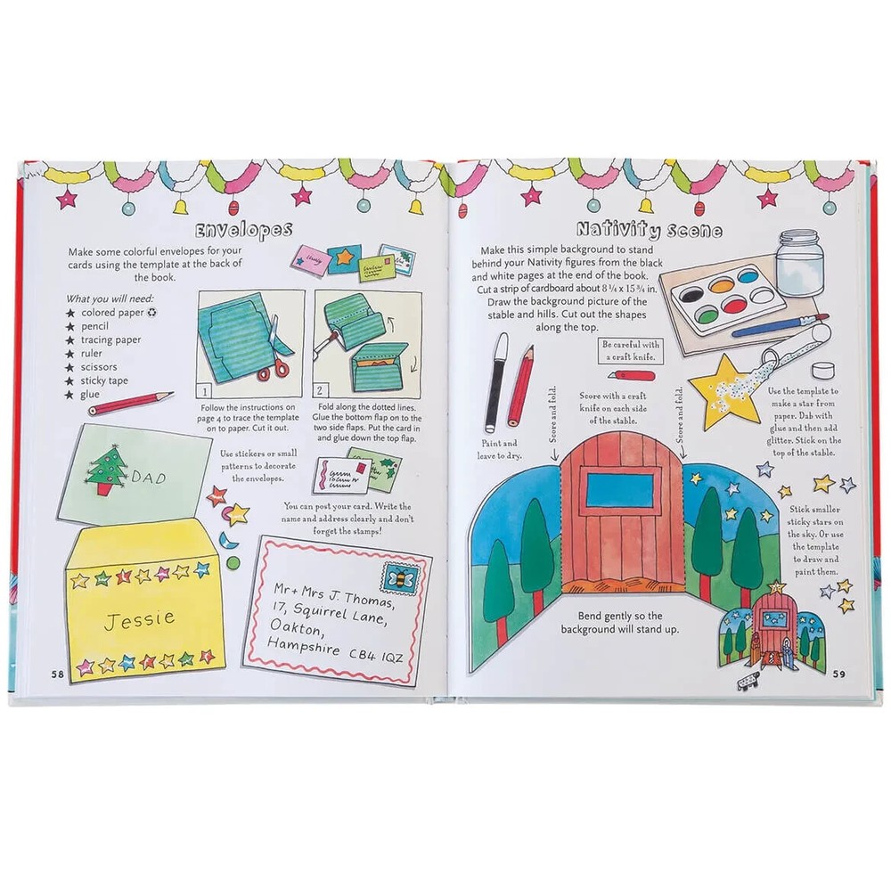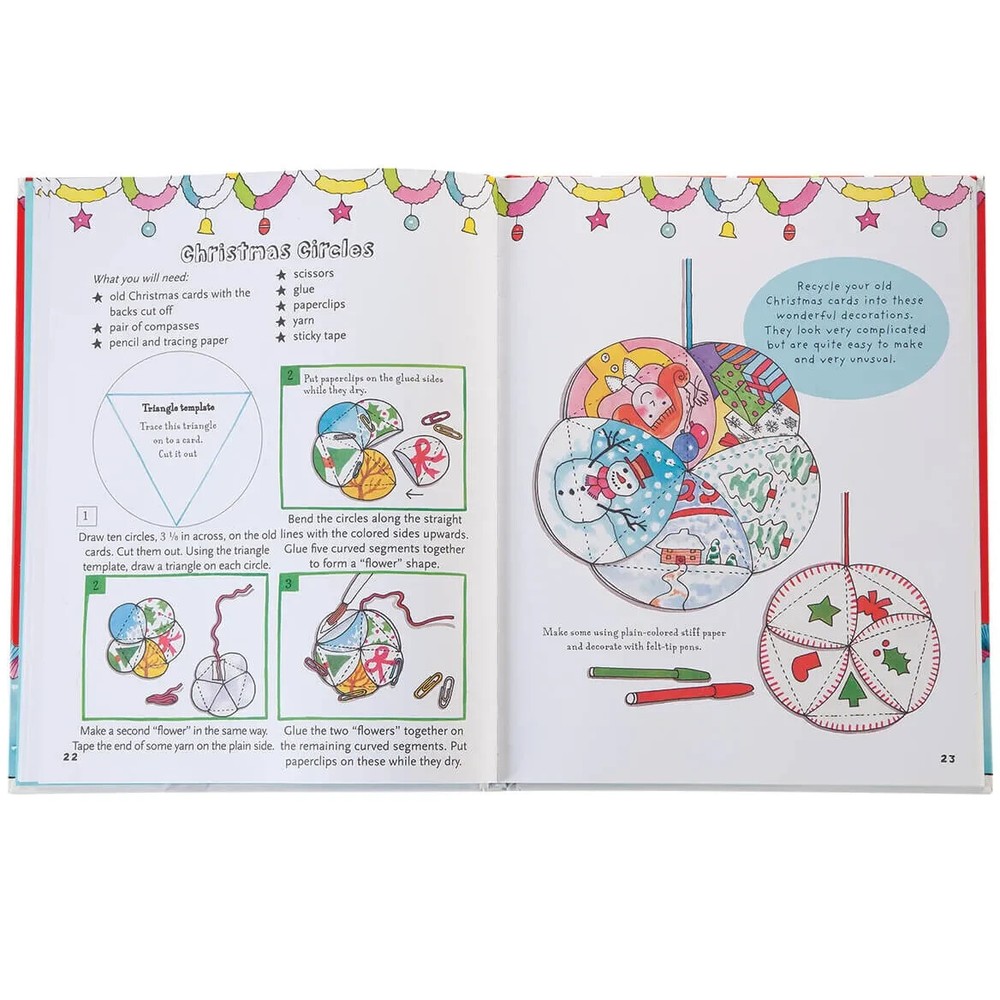 Full of activities, craft projects, recipes, cards, decorations and gift ideas. The projects and Christmas activities in this book include festive decorations for home or classroom, yummy holiday food recipes, 12 cards to cut out, color and send, 26 decorations to cut out and color, plus lots of templates for creative gift ideas, including an envelope for the Christmas cards. Hardcover book has 92 pages with full-color instructions. Measures 10 7/8" H x 8/1/2"W. For ages 7 and up.