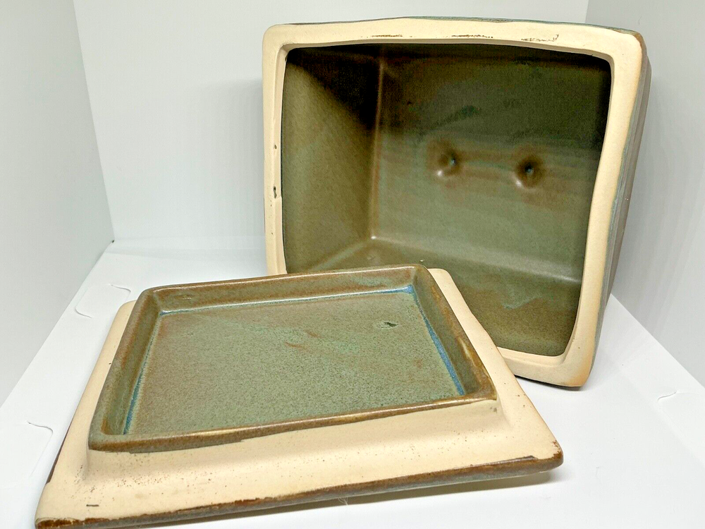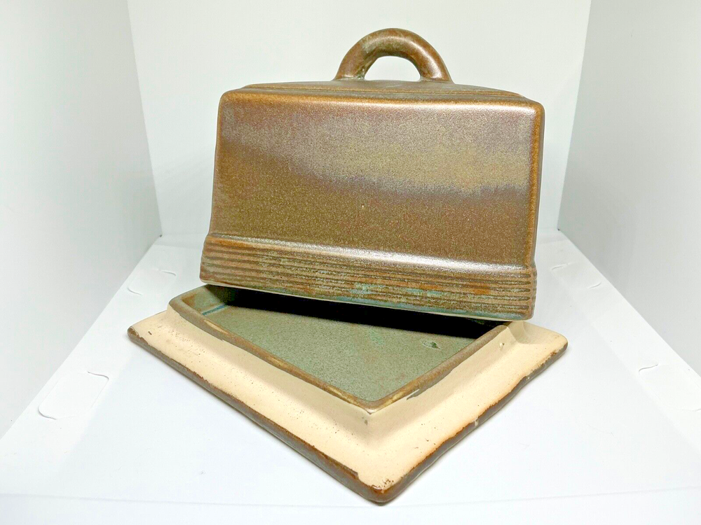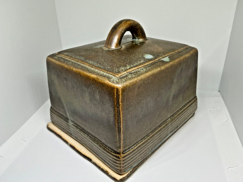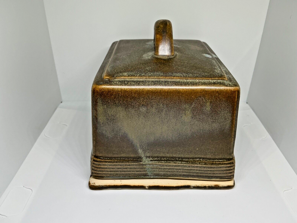 *PLEASE NOTE* DUE TO THE MANUFACTURING PROCESS, YOU MAY NOT GET THE EXACT ONE PICTURED. EACH STONEWARE BUTTER DISH IS SIMILAR BUT NOT IDENTICAL. Versatile, tall butter dish is 3 1/2 inches tall and 4 1/2 inches wide. The stoneware is a beautiful earthen color that is a brownish gray, but streaks of blue-green (turquoise almost but not quite) peaking through the reactive glaze. This 2-piece butter dish is microwave and dishwasher safe. I struggled to pick a “style” for the listing. It came in the Scandi (Scandinavian) collection, but would look great with farmhouse, industrial, bachelor, eclectic, or western styles as well. Location A1