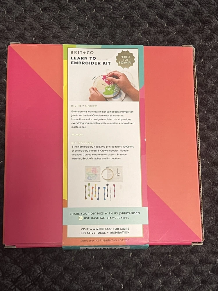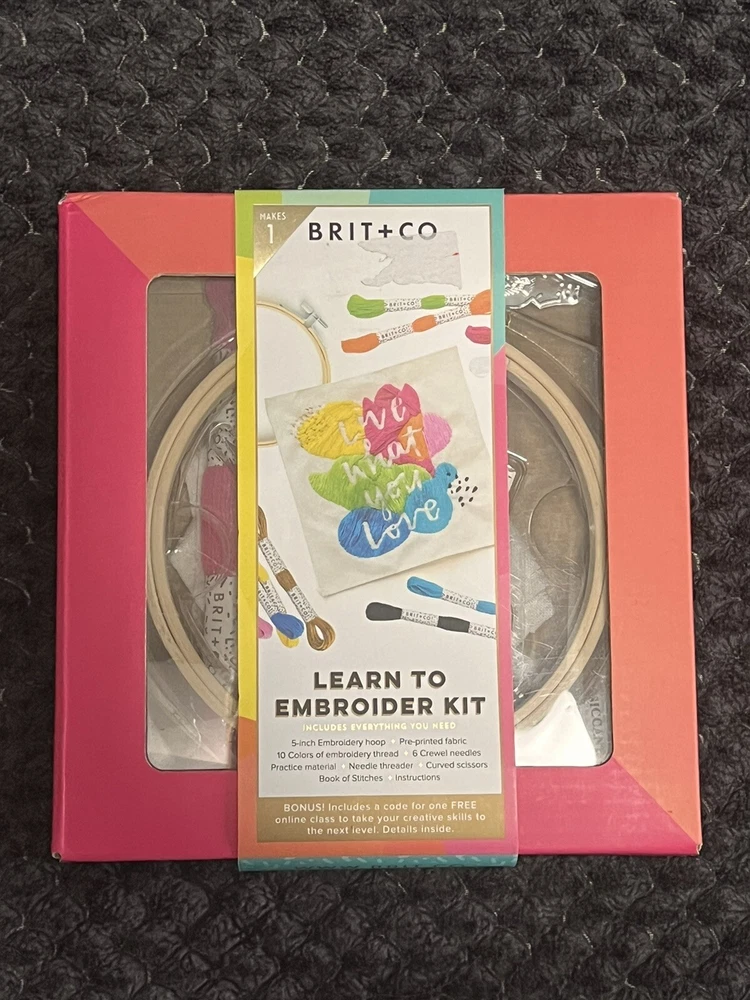 New from Brit + Co! Learn to Embroider Kit Includes: 5 inch Embroidery hoop Pre-printed fabric 10 Colors of embroidery thread 6 Crewel needles Practice material Needle threader Curved scissors Book of stitches Instructions BONUS: includes a code for a one FREE online class to take your creative skills to the next level! Fast shipping from my smoke free, pet friendly home!