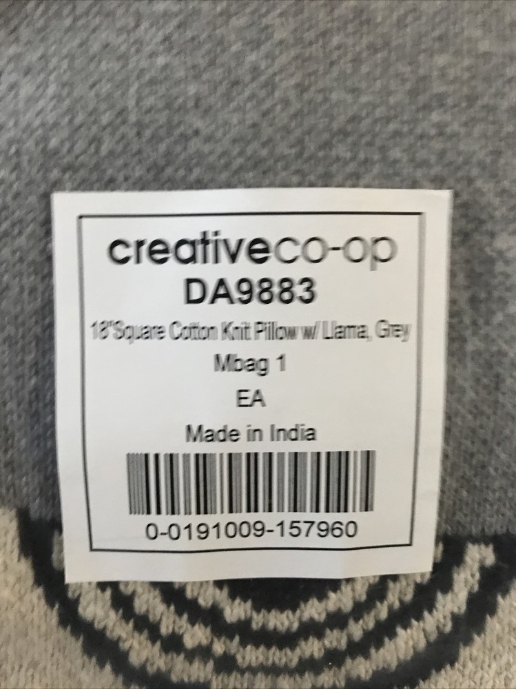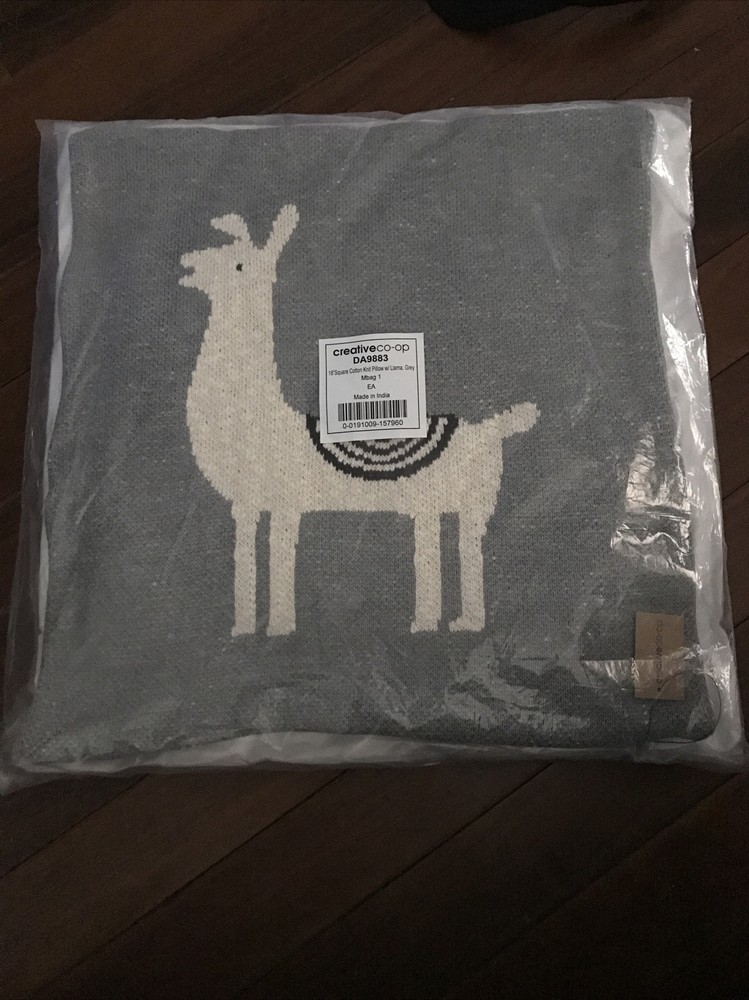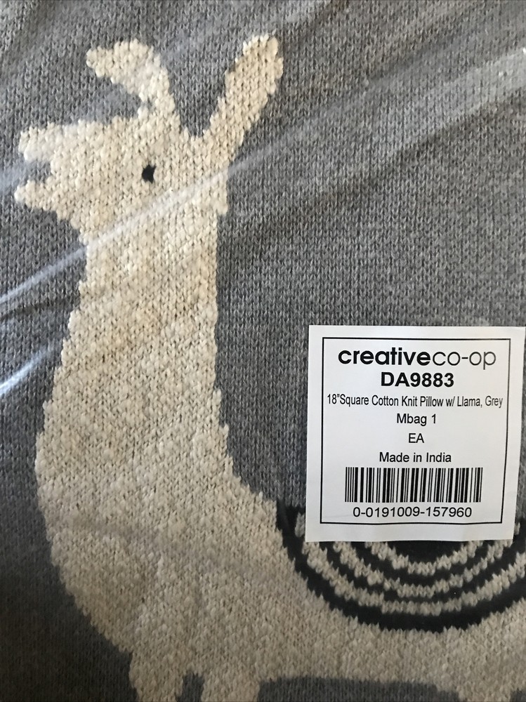 NEW CREATIVE CO-OP 18” SQUARE COTTON KNIT PILLOW W LLAMA GREY. NEW COVER WITH NEW PILLOW THE PILLOW IS VACUMN SEALED AND REGAINS ITS SHAPE WHEN OPENED PLEASE SEE PICTURES FEEL FREE TO ASK QUESTIONS MORE THAN 1 AVAILABLE IF YOU NEED MORE IF YOU DECIDE YOU NEED MORE, let me know, I can probably save you some on shipping