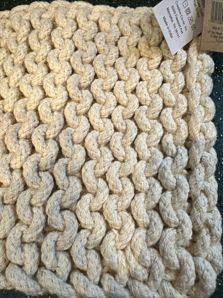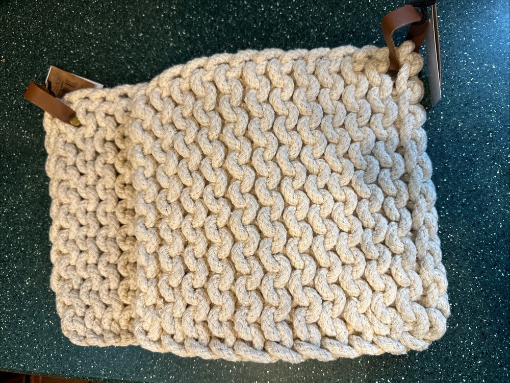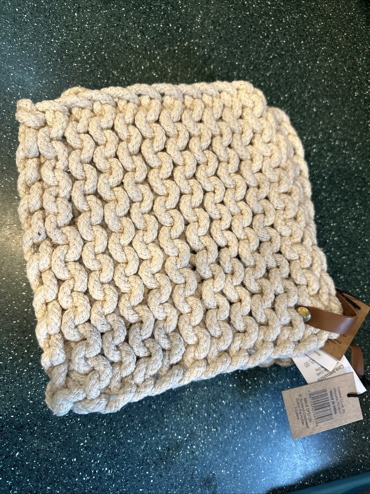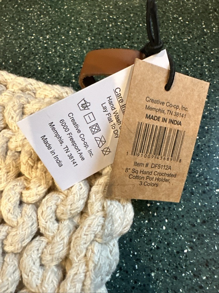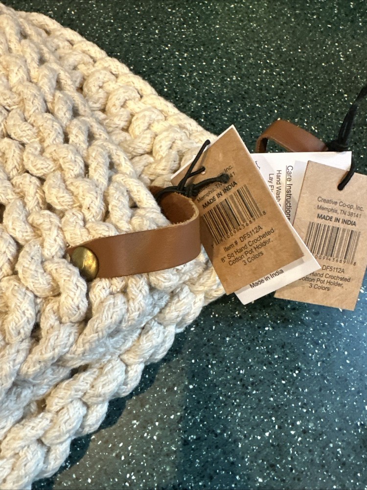 The NEW Creative Co-op Hand Crocheted Cotton Pot Holder is a set of two 8” pot holders in a tan and cream color. These handcrafted pieces are made by the brand Creative Co-op, known for their quality craftsmanship. Perfect for adding a touch of handmade charm to your kitchen, these pot holders provide a stylish and functional way to protect countertops and tables from hot dishes. Ideal for those who appreciate unique and artisanal items for their home decor.