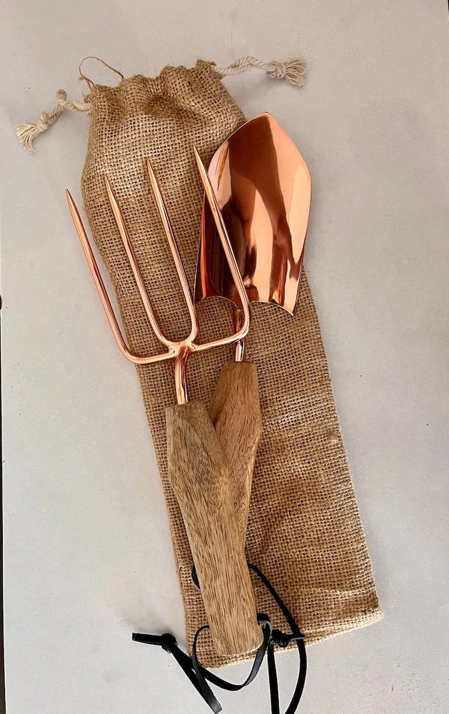 NEW! GOLD Garden Tools with Mango Wood Handles CREATIVE COOP set of 11 inch and 11 1/2 inch length stainless steel garden tools with mango wood handles. Set of 2 in burlap sack...