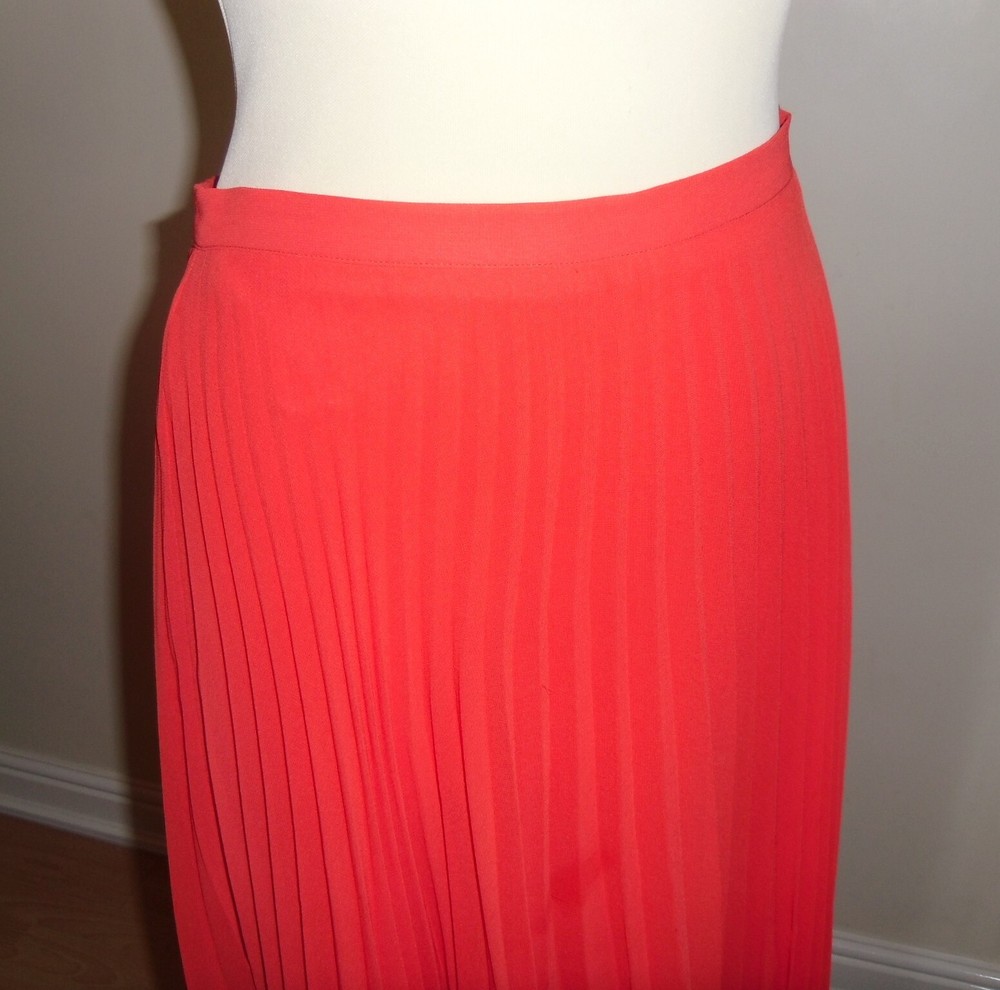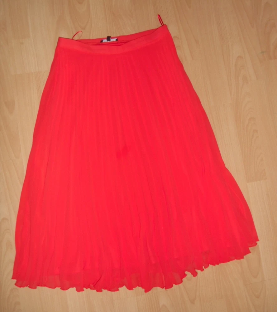 New Look orange pleated skirt size 10 Concealed side zip fastening, full lined Floaty sheer delicate material Length approx. 28.5in (lower calf length) 100% Polyester Used. Very good condition From a ...