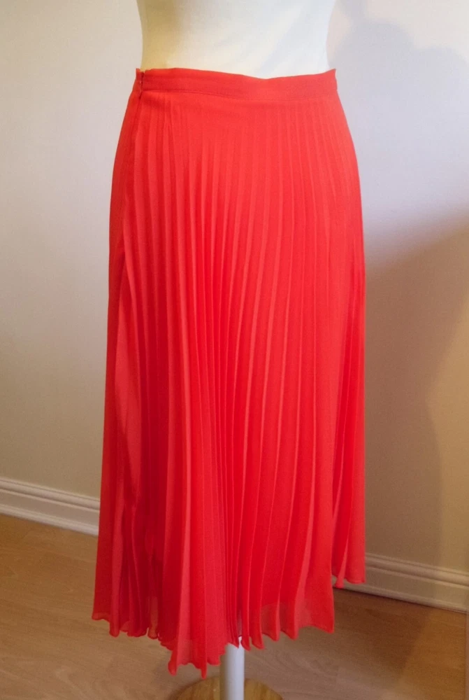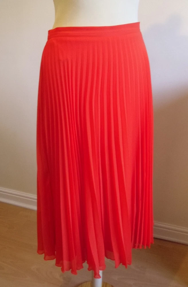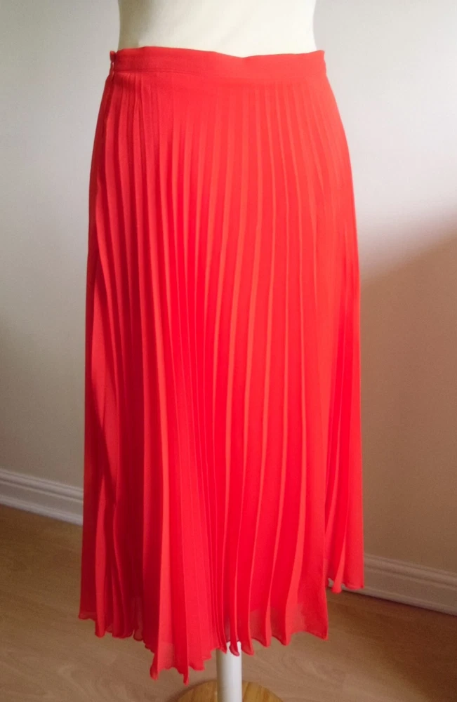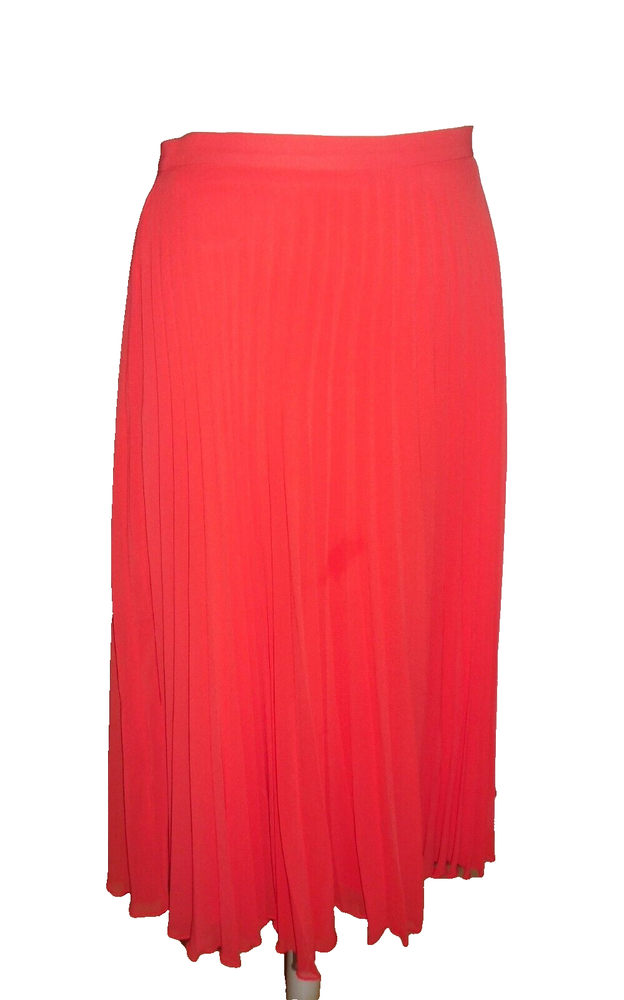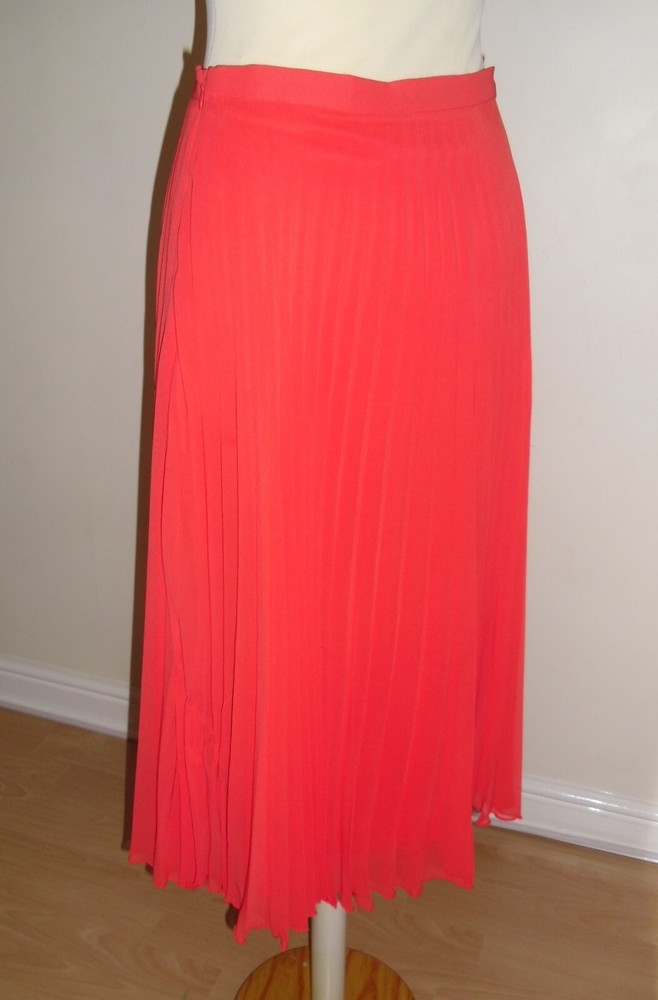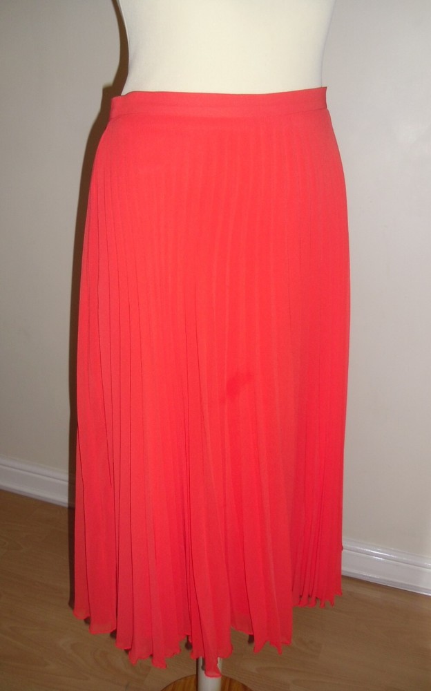 New Look orange pleated skirt size 10 Concealed side zip fastening, full lined Floaty sheer delicate material Length approx. 28.5in (lower calf length) 100% Polyester Used. Very good condition From a non-smoking and pet-free home