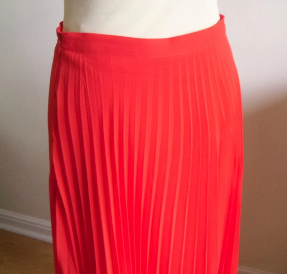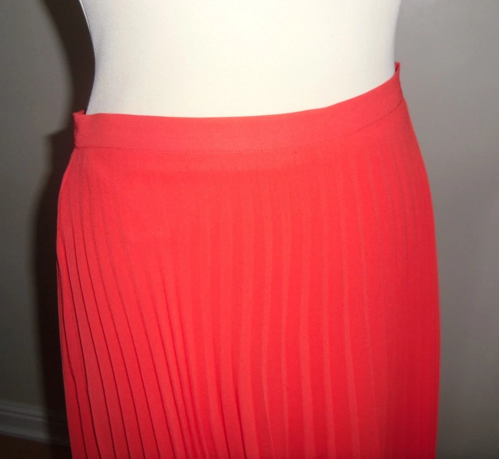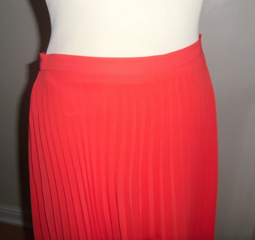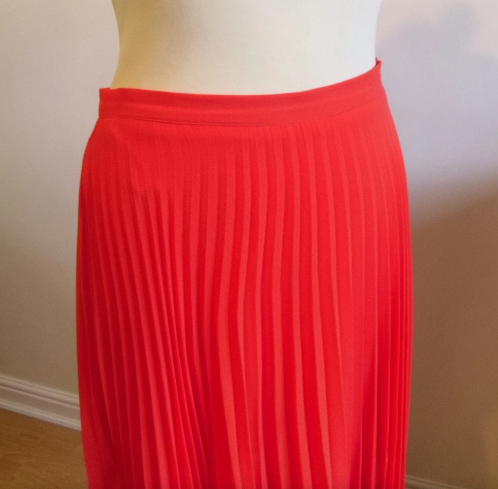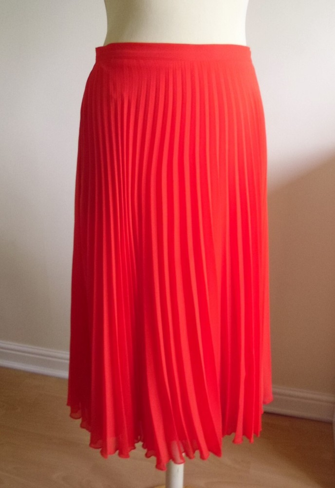 New Look orange pleated skirt size 10 Concealed side zip fastening, full lined Floaty sheer delicate material Length approx. 28.5in (lower calf length) 100% Polyester Used. Very good condition From a non-smoking and pet-free home