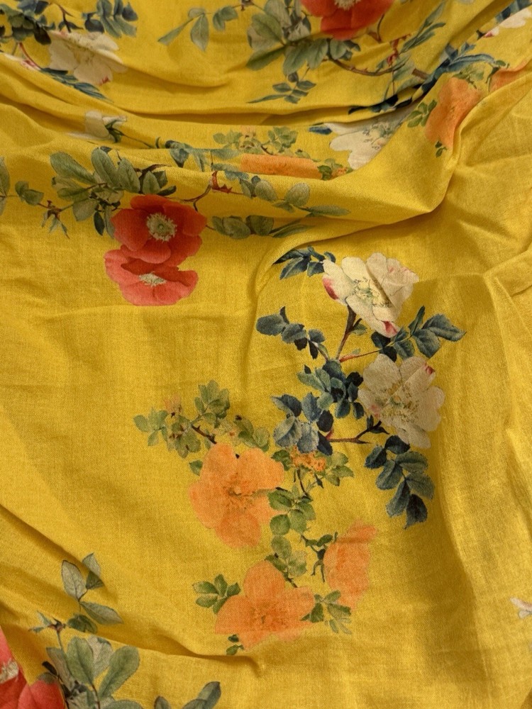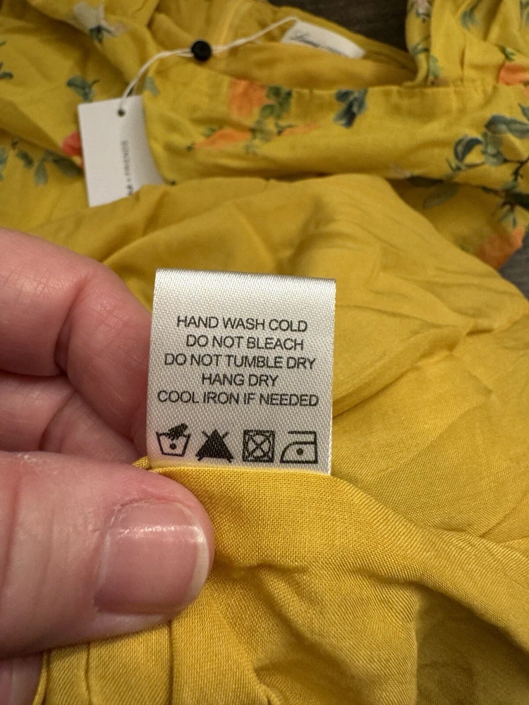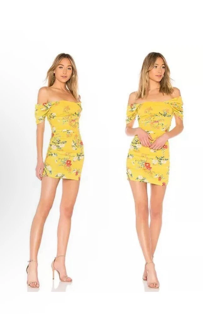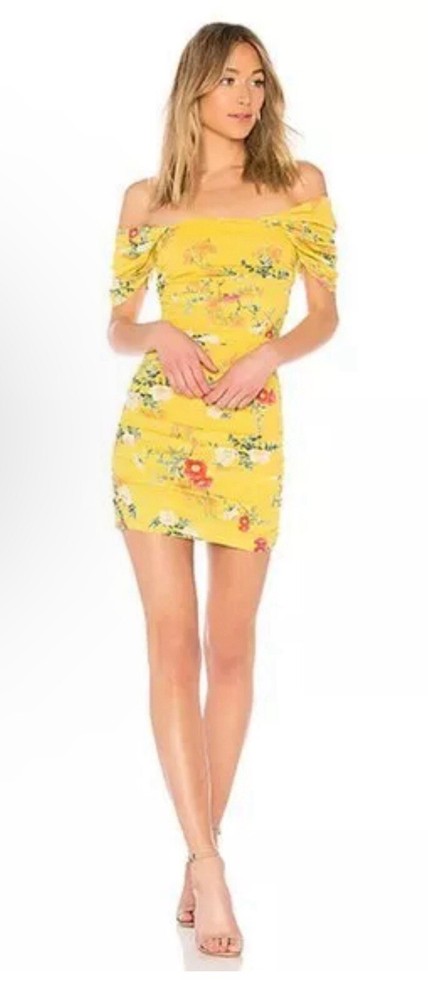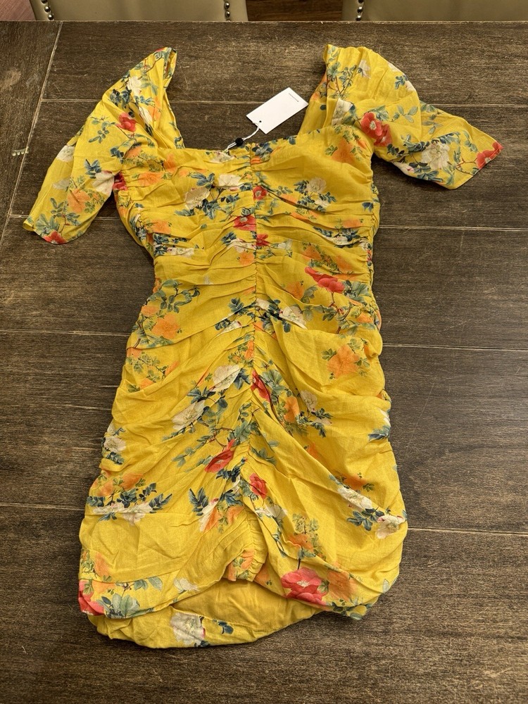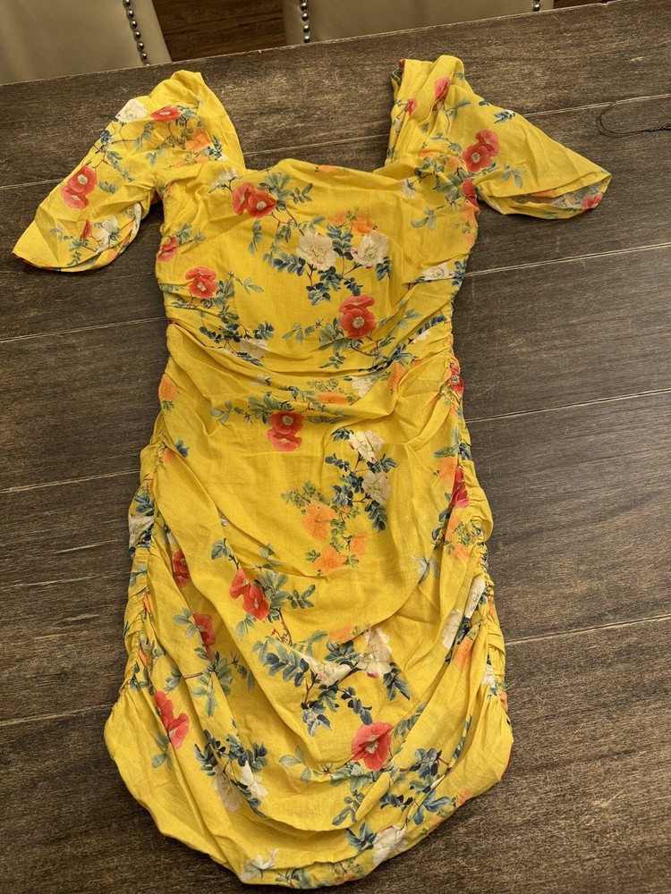 Introducing a beautiful and stylish Lovers + Friends Joss Dress, perfect for any occasion. This dress features a stunning floral print in yellow and multicolor, with off the shoulder sleeves and a zip closure. It is made of 100% cotton, woven fabric, and has a short dress length, making it ideal for travel, parties, or casual events. The dress has a unique character, with a flower theme and a mini style, suitable for women of all ages. It is a regular size, with a size of S, and has a lovely neckline that complements the overall design. This dress is perfect for the summer and spring seasons, and can be paired with your favorite shoes and accessories to complete your look. A7. 22215. 15 inches across back.