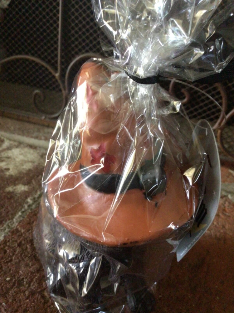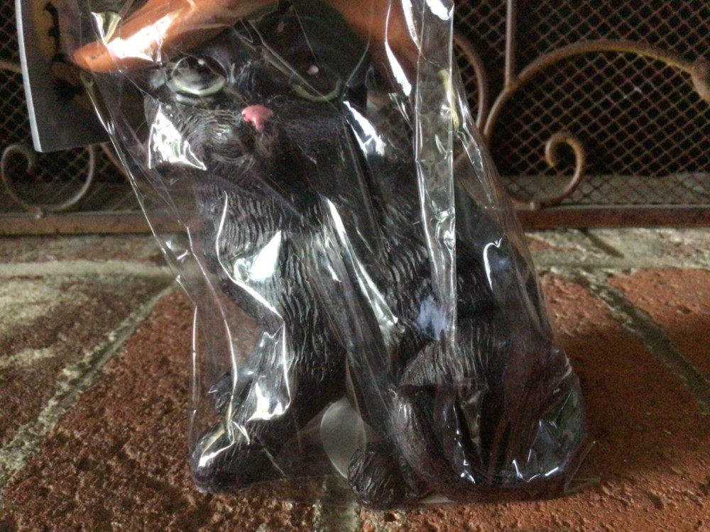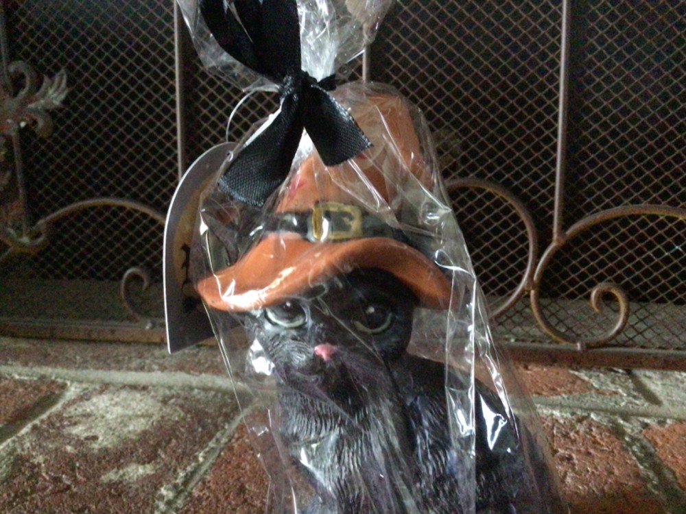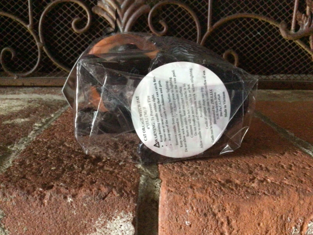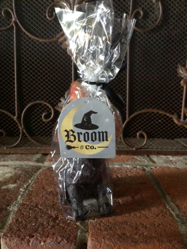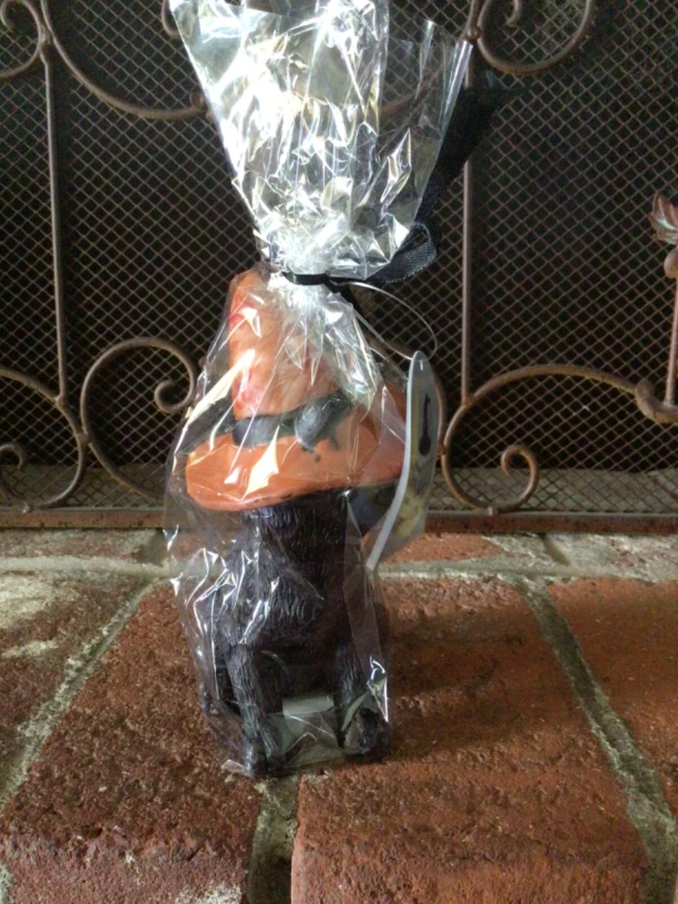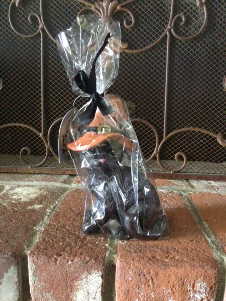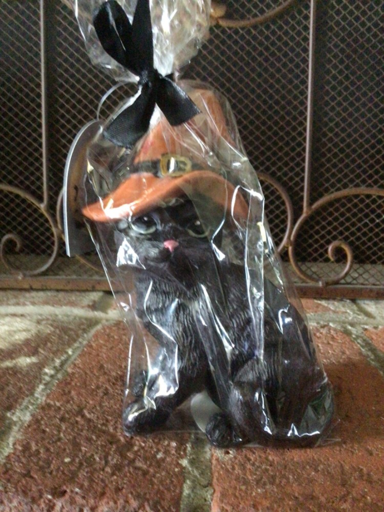 This is a brand new, sealed Halloween black cat candle by Broom & Co. The candle is a black cat with green eyes and pink nose wearing an orange witch hat with a black buckle and red stars. It measures 7 inches tall and 4 inches wide. It wrapped in cellophane with a black bow. Thanks!