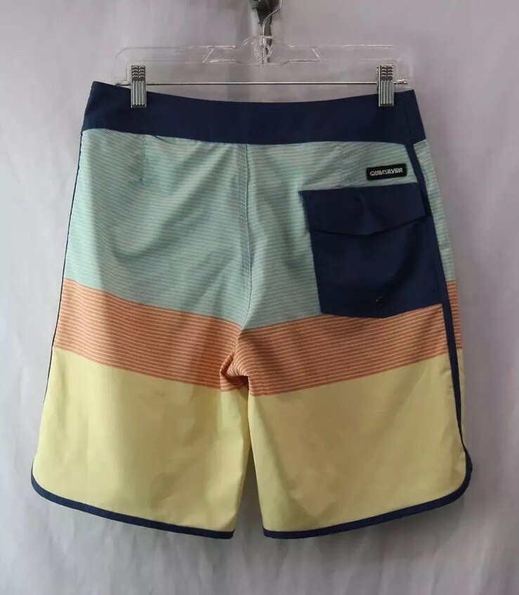 Experience the ultimate comfort and style with these Quiksilver swim trunks. The blue, yellow, and orange striped pattern adds a fun and trendy touch to your beach or pool day. These regular size trunks are perfect for any man looking for a comfortable and fashionable option. Crafted with high-quality materials, these mid-length trunks are built to last. The size 29 fit ensures a comfortable and flattering option for any body type. Whether you're surfing, swimming, or just soaking up the sun, these Quiksilver trunks are the perfect choice.