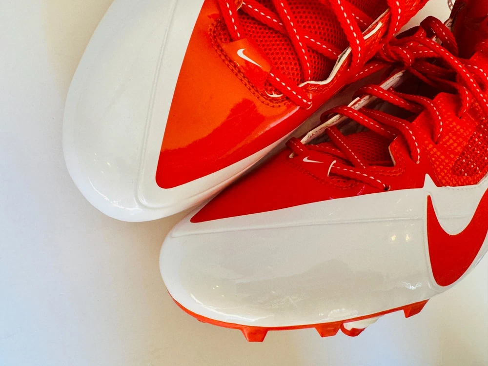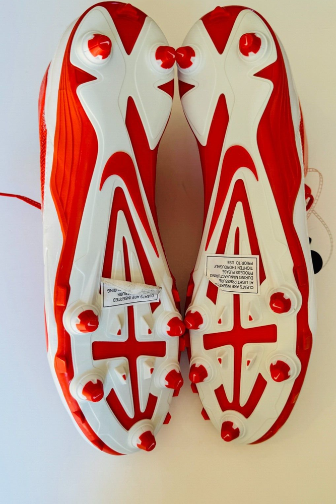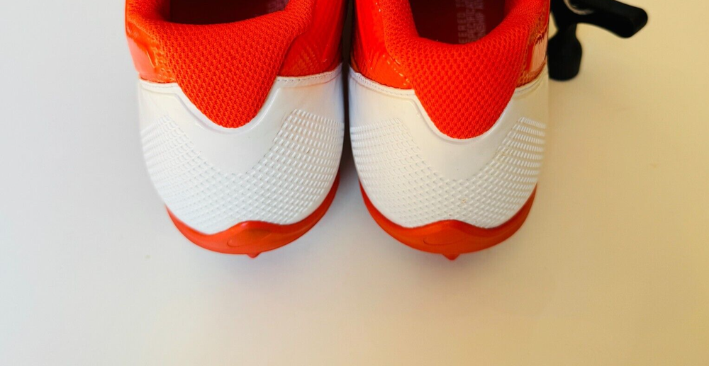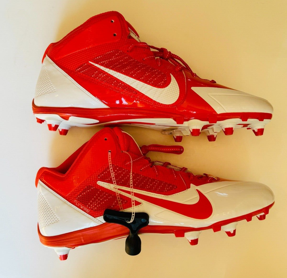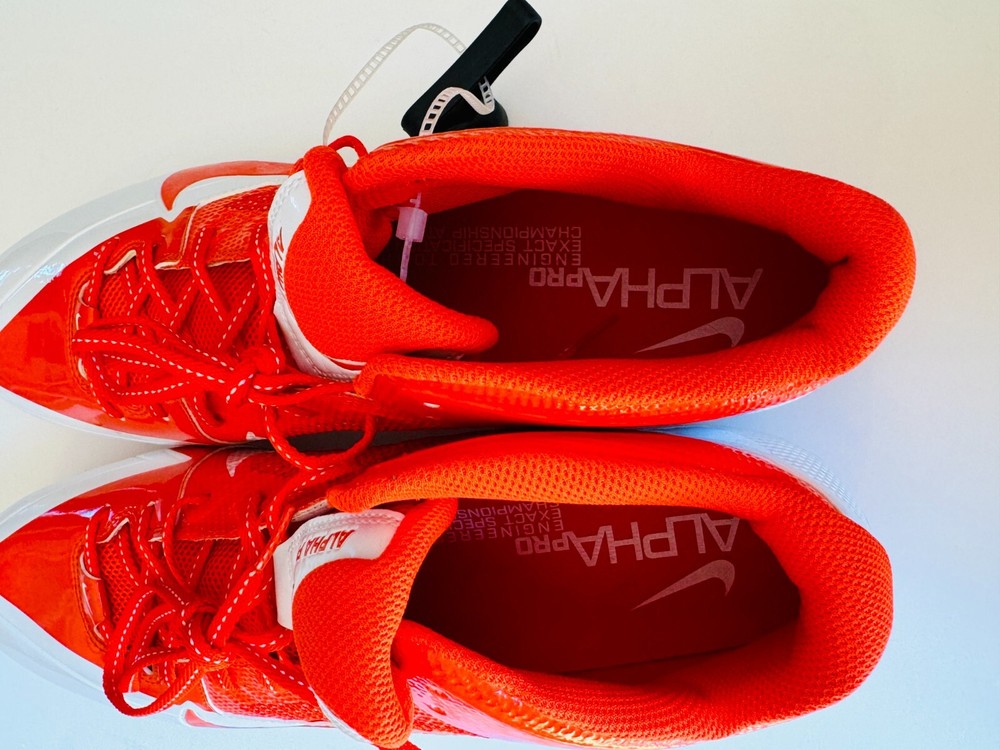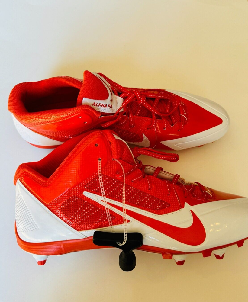 NEW Nike Alpha Pro Flywire TD Mid Football ORANGE Cleats Men's Size 16 599025-181. New without box. Includes wrench. Shoes are ORANGE and white (they look more red in the pictures). A good representation of the orange color is how the pictures look along the bottom part of the shoe towards the heel of the shoe. Shoes show minor shelf-wear. See pictures. ALL OF MY ITEMS WERE PURCHASED IN THE USA FROM RETAIL STORES! THEY ARE 100 PERCENT AUTHENTIC! YOUR ITEM WILL SHIP THE NEXT BUSINESS DAY AFTER PAYMENT! NEW Nike Alpha Pro Flywire TD Mid Football ORANGE Cleats Men's Size 16 599025-181