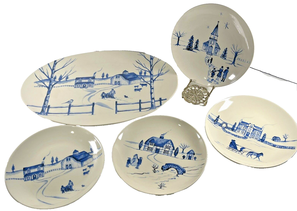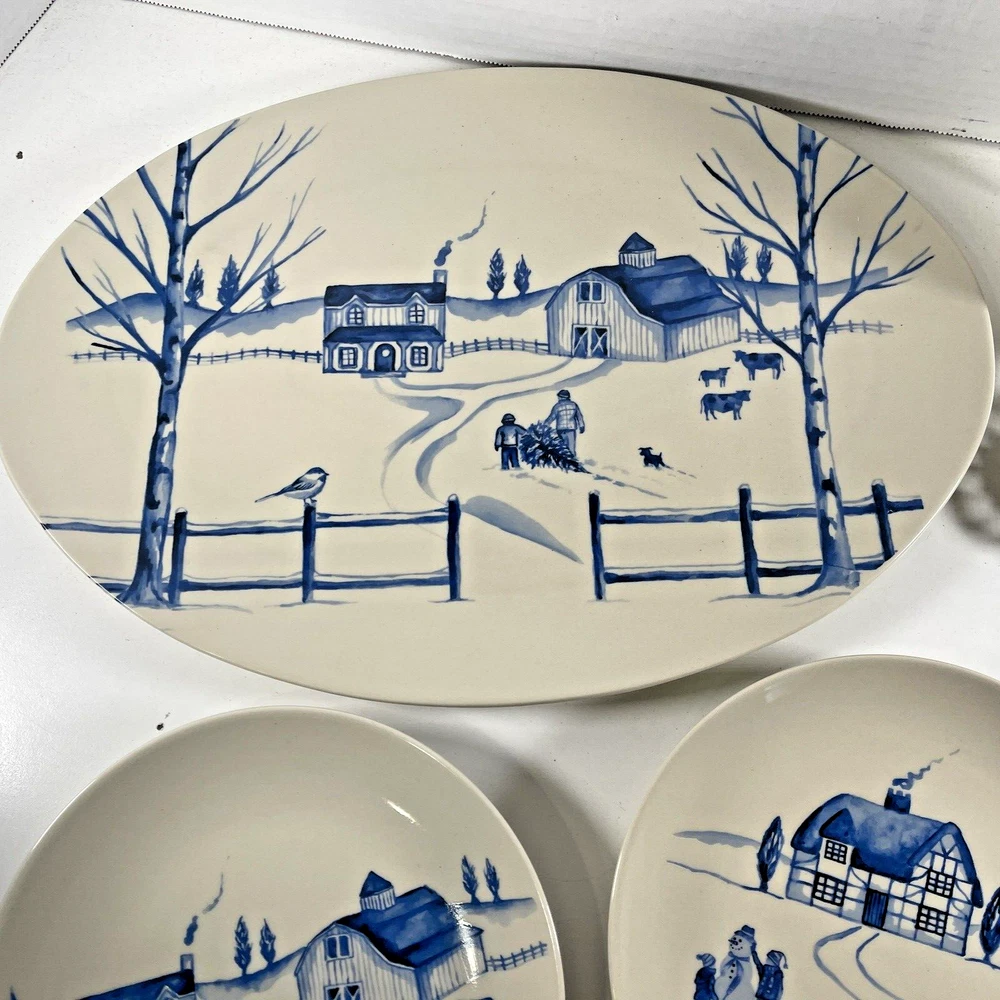 NEW OLD STOCK Creative Co-Op Stoneware 16" Platter & 4x 8" Plates w Winter Scenes