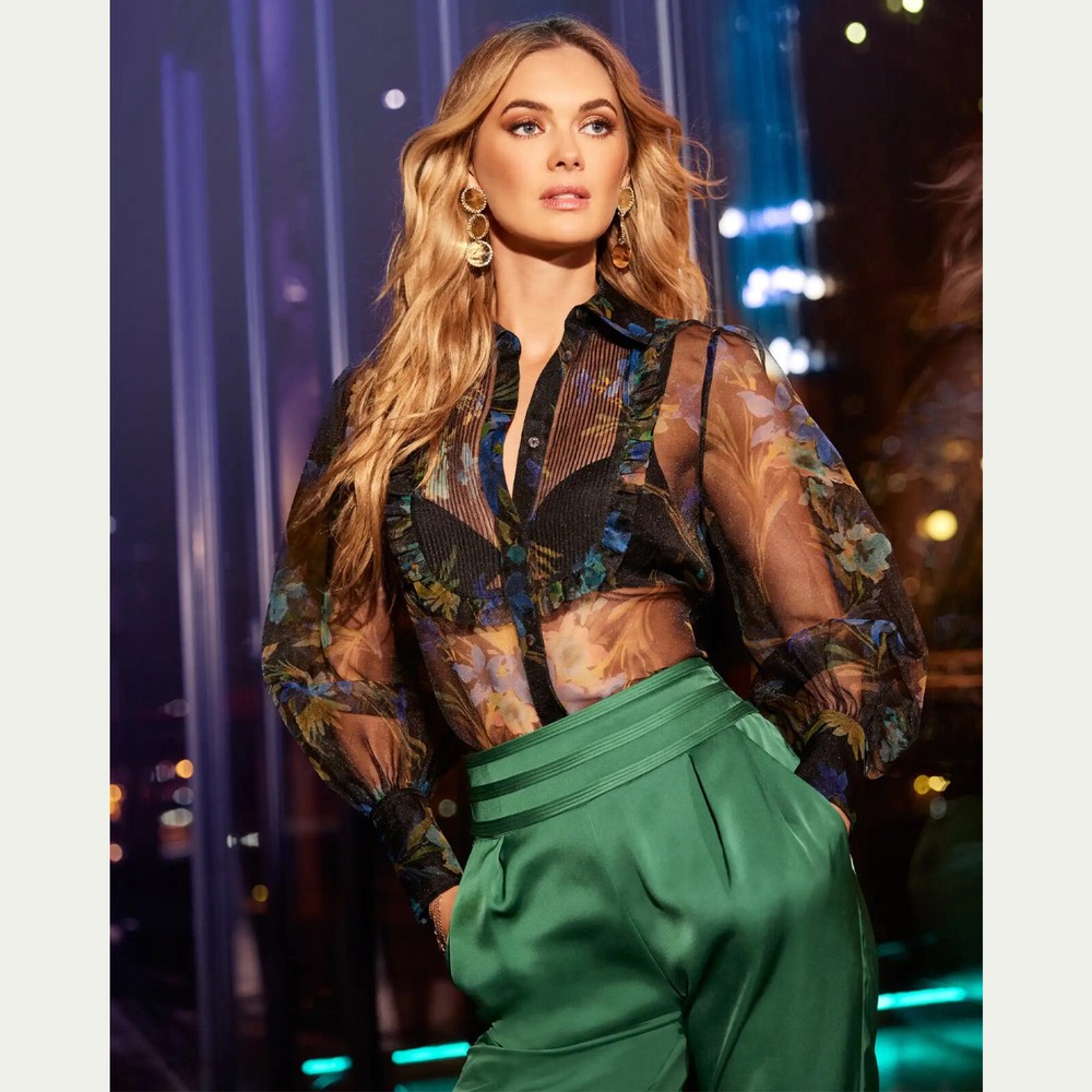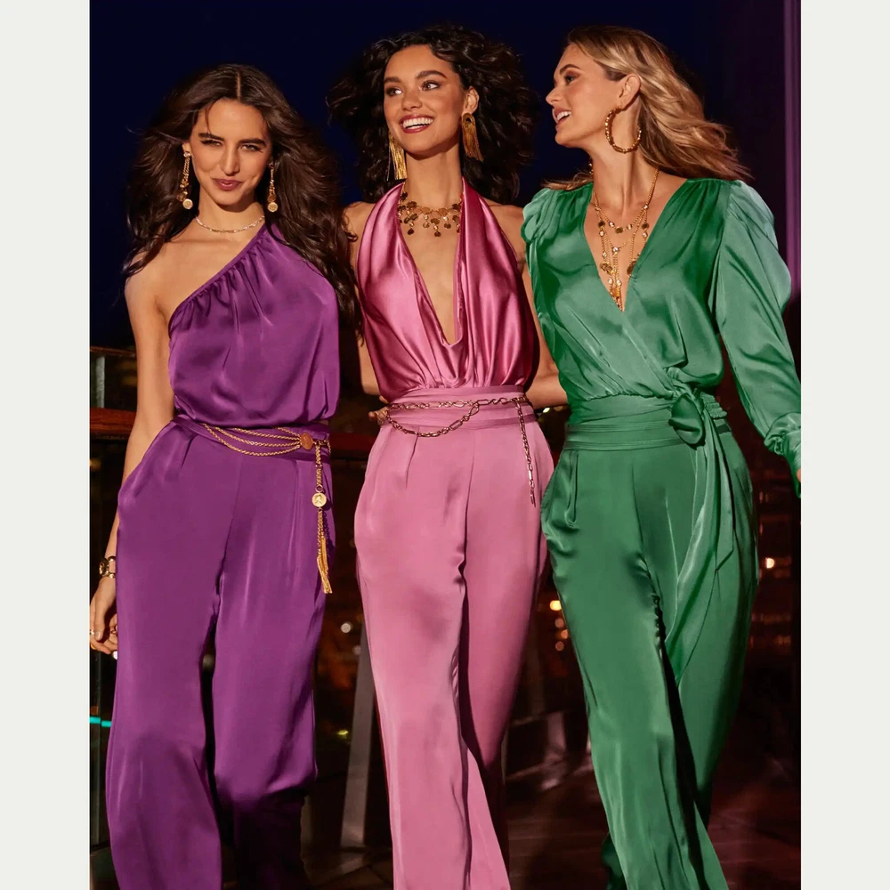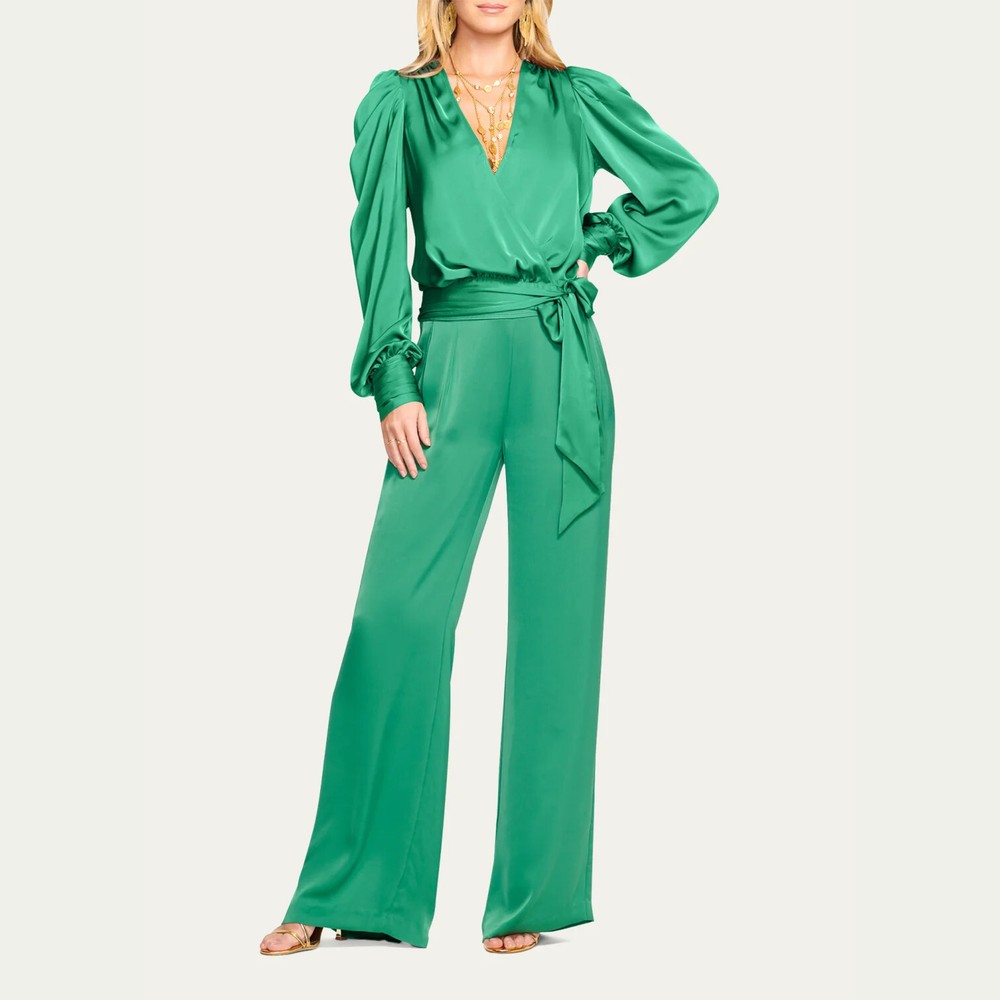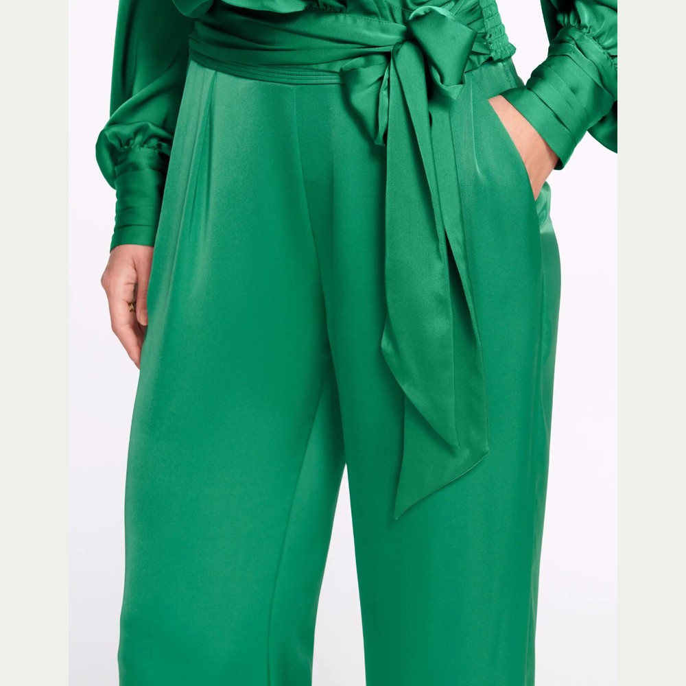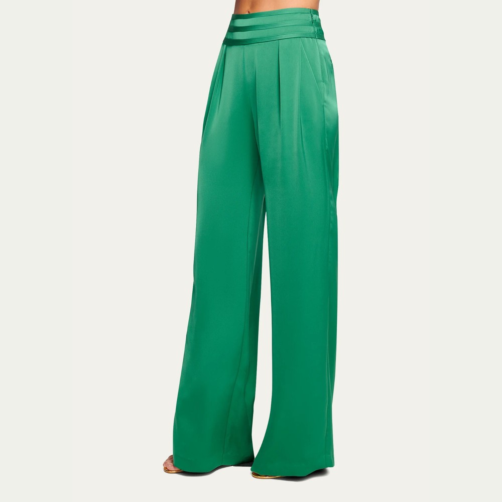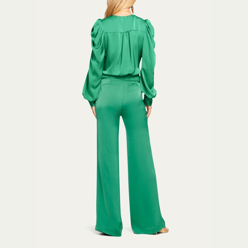 Meet our do it all trouser, the Joss. Fashioned in a rich satin, this breezy design has a striking tuxedo-inspired waist detail for a dose of dimension. Simply swap your white t-shirt for a cropped top and blazer to take these transformational trousers from day to night. Ramy Brook "Joss" trousers in a satin finish Approx. 33" inseam High rise Pleated front Slanted side pockets; back welt pockets Full length Wide legs Invisible side zip Polyester Imported New with tags