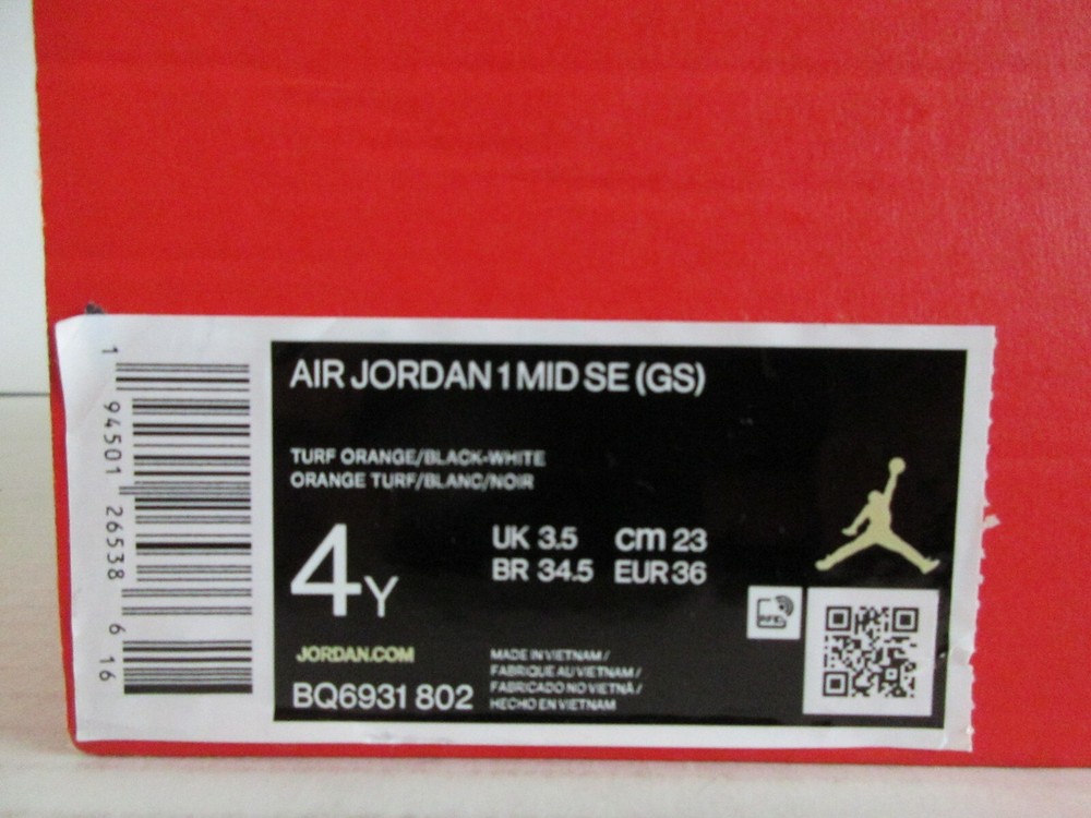 NIKE AIR JORDAN 1 MID SE(GS) Features 100% AUTHENTIC BRAND NEW IN OPEN TOP BOX. COLOR: TURF ORANGE-BLACK-WHITE Awesome sneakers with a classic color combination Size & Style Info SIZE 4Y = AND FITS A WOMENS SZ 5.5 INTERNATIONAL SIZES: (3.5 UK) (36 EU) (23 CM) Style # BQ6931 802 Shipping We ship within 1-2 business days (excludes Saturday, Sunday, and holidays) from receipt of payment All domestic items are shipped USPS Priority Mail (Free shipping in the USA) We do ship to APO/FPO and Post Office box addresses We do ship to Alaska and Hawaii Tracking will be sent for all purchases within 24-48 hours Payment We accept payment by PayPal and credit card through PayPal Immediate payment is required Returns We offer a 30 day (after payment) 100% money back guarantee. Buyer pays return shipping All items MUST be in the original shipping condition for a refund. We inspect all returned items before a refund or exchange is given. Signs of wear and/or damage will not qualify for a refund or exchange Customer support Emails are answered within 48 business hours (this excludes weekends, and or holidays) Please contact us only through eBay "My Messages" Why NYZCORP ? 100% Authentic Nike products Unique, hard to find items 100% positive feedback Lightning fast shipping Thank you for visiting and shopping with Nyzcorp!! Have a wonderful day!