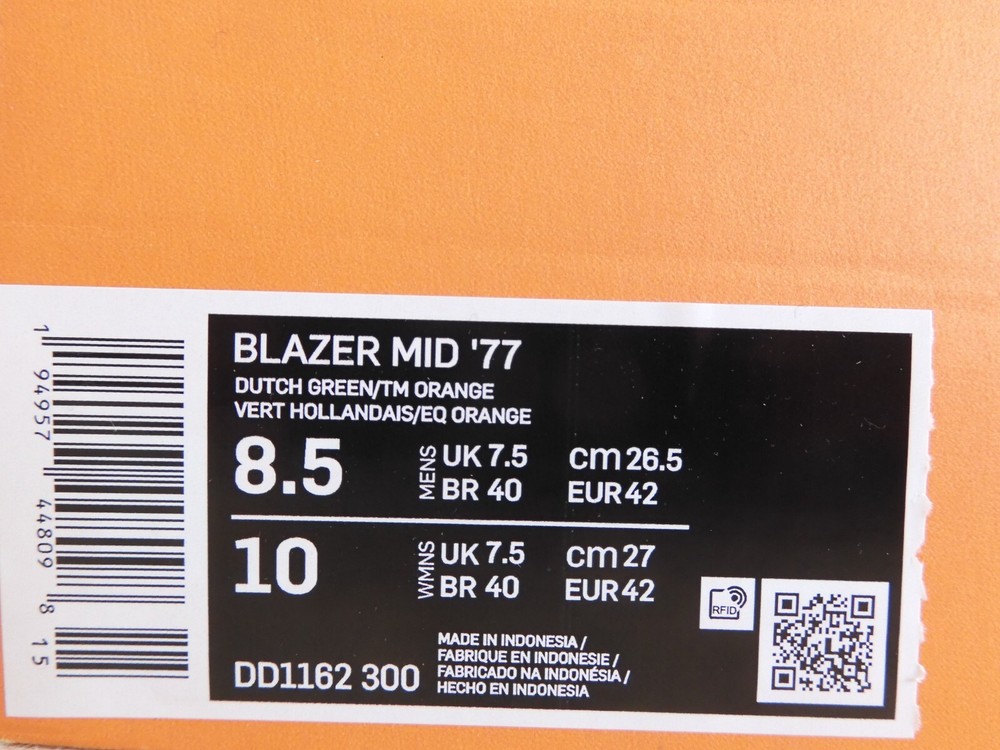 NIKE BLAZER MID '77 "PATCH" Features 100% AUTHENTIC BRAND NEW IN OPEN TOP BOX. COLOR: Dutch Green-Team Orange Equipped with extra cushioning in the ankle area Sleek design that works on the street as well as on the ramp Size & Style Info SIZE 8.5 US MENS INTERNATIONAL SIZES: (7.5 UK) (42 EU) (26.5 CM) Style # DD1162 300 Shipping We ship within 1-2 business days (excludes Saturday, Sunday, and holidays) from receipt of payment We do ship to APO/FPO and Post Office box addresses We do ship to Alaska and Hawaii Tracking will be sent for all purchases within 24-48 hours Payment We accept payment by PayPal and credit card through PayPal Immediate payment is required Returns We offer a 30 day (after payment) 100% money back guarantee. Buyer pays return shipping All items MUST be in the original shipping condition for a refund. We inspect all returned items before a refund or exchange is given. Signs of wear and/or damage will not qualify for a refund or exchange Customer support Emails are answered within 48 business hours (this excludes weekends, and or holidays) Please contact us only through eBay "My Messages" Why NYZCORP ? 100% Authentic Nike products Unique, hard to find items 100% positive feedback Lightning fast shipping Thank you for visiting and shopping with Nyzcorp!! Have a wonderful day!