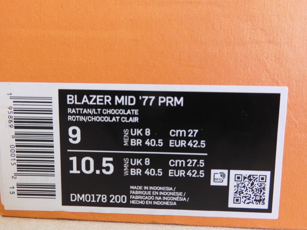 NIKE BLAZER MID '77 PREMIUM Features 100% AUTHENTIC BRAND NEW IN OPEN TOP BOX. COLOR: Rattan-Light Chocolate Equipped with extra cushioning in the ankle area Sleek design that works on the street as well as on the ramp Size & Style Info SIZE 9 US MENS INTERNATIONAL SIZES: (8 UK) (42.5 EU) (27 CM) Style # DM0178 200 Shipping We ship within 1-2 business days (excludes Saturday, Sunday, and holidays) from receipt of payment We do ship to APO/FPO and Post Office box addresses We do ship to Alaska and Hawaii Tracking will be sent for all purchases within 24-48 hours Payment We accept payment by PayPal and credit card through PayPal Immediate payment is required Returns We offer a 30 day (after payment) 100% money back guarantee. Buyer pays return shipping All items MUST be in the original shipping condition for a refund. We inspect all returned items before a refund or exchange is given. Signs of wear and/or damage will not qualify for a refund or exchange Customer support Emails are answered within 48 business hours (this excludes weekends, and or holidays) Please contact us only through eBay "My Messages" Why NYZCORP ? 100% Authentic Nike products Unique, hard to find items 100% positive feedback Lightning fast shipping Thank you for visiting and shopping with Nyzcorp!! Have a wonderful day!