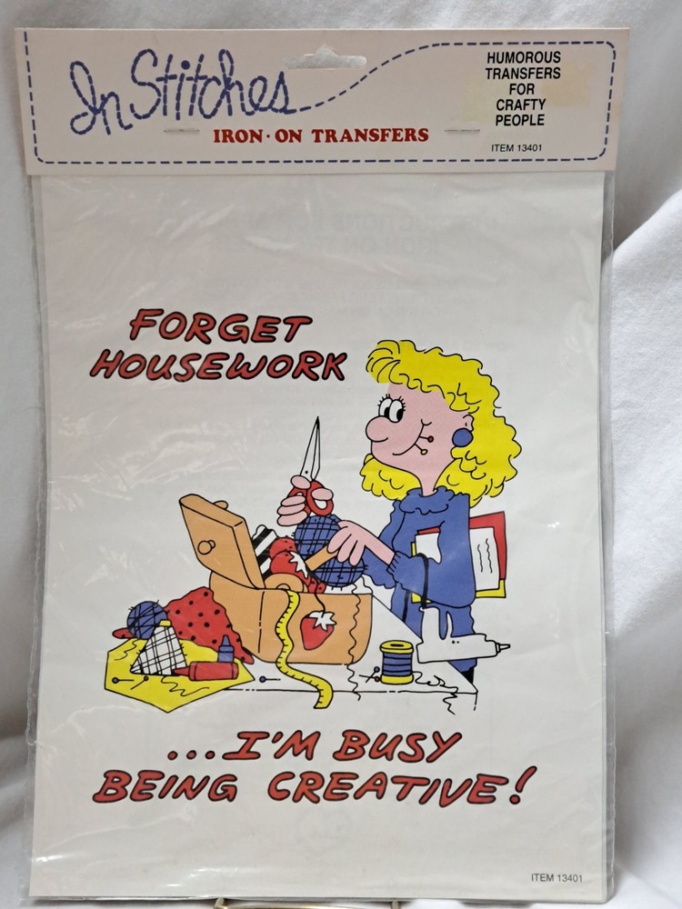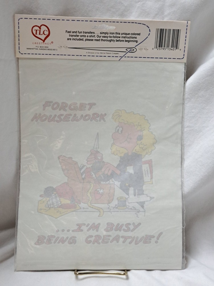 Discover a charming vintage iron-on transfer from McCall Pattern Co., a delightful addition to any collector's sewing assortment. With the quaint phrase "Forget Housework...I'm Busy Being Creative!"This transfer captures the essence of a bygone era's homemely charm and creative spirit. Ideal for embellishing apparel or home décor, this pattern piece offers a touch of nostalgia and a playful twist to your crafting projects. Whether you're a seasoned sewer or a budding enthusiast, this collectible transfer is sure to inspire and add a unique flair to your handiwork. Dive into the joy of customization and let this classic pattern spark your imagination and elevate your creations.