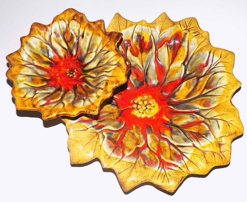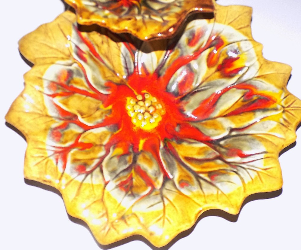 NOS Vintage Retro Poinsettia Chip & Dip from Two Guys Gold Orange NOS vintage retro chip in dip pottery in the shape of a poinsettia. The colors are orange and gold. An original Two Guys label is still attached on the bottom. The two level chip and dip dish measures 12 inches wide on the bottom and 7 inches wide on the top dish. Condition is VERY GOOD - A petal on the large bowl (at the back under the small bowl has no glaze on it. It is not chipped. I am happy to combine shipping on multiple purchases. Please check out my other listings!!! Bid with confidence as I offer a money back guarantee. If you are unsatisfied with your item, just return within seven days of receipt for a refund. Please NOTE: Most of my items are vintage and I cannot guarantee that they were not in a smoking or pet environment in their previous life. I do have a cat. Vintage clothing and accessories ***May have been in previous smoking environments. ***May have been in households with pets ***May have a musty odor due to its length in storage. As a vintage seller I have made every attempt to ensure your vintage garment is free of odors at the time of shipment. However, it has been shown that undetected odors sometimes revive during shipping. This is due to the item being packaged in a confined space such as a box or envelope. RECOMMENDED Tips to Revive Your Item ***Hang your garment outside in a dry shaded location for a few days ***Place your garment in a paper bag with newspaper for several days. The newspaper will absorb unpleasant odors. Change the newspaper frequently. ***Take your garment to a reputable dry cleaners. Dry cleaning should remove any smells if you request your item be deodorized. I try my best to offer clean and odor free items but I DO NOT have them dry cleaned in order to offer them to you at a lower price. I ship several times a week. Please allow extra time for Parcel Post. I will also ship by FedEx Ground for heavier items. Please let me know if you'd like to use this option. Please email with any questions about payment. I will strive to ship within a day's time, but sometimes it is impossible to do so. I thank you for your understanding. inkfrog terapeak