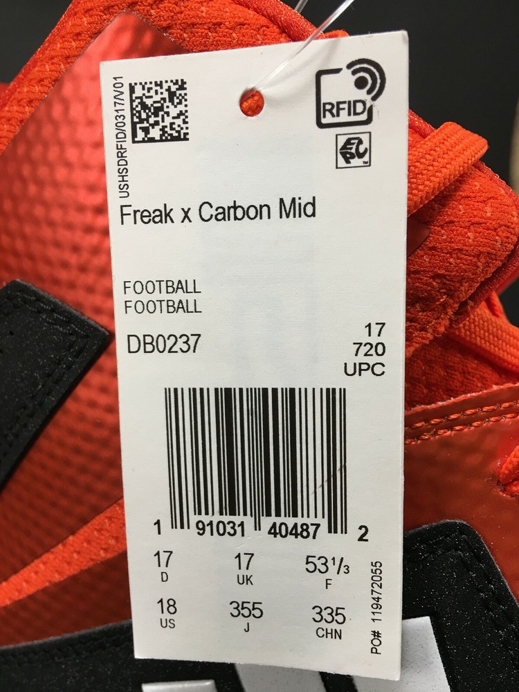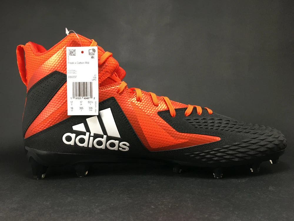 Adidas Freak X Carbon Mid men's football cleats. US size 18 Model DB0237 New with tags, no box included. Still has the tissue paper in the toes and tied shoe-store style, as shown in pictures. Seller’s policies and procedures: If you have any comments, concerns, or problems with your order, please message the seller first before leaving feedback or opening a case with eBay. I will do my very best to resolve issues right away. On Photography: When picturing defects, my policy is to show the most important, noteworthy, visible defects first. All photos are taken in either natural light or using “daylight bulbs,” with no color-correction filters. I am color-blind, so if I have not named the color of an item, it means I can't confidently call it, and you will need to trust the photographs.