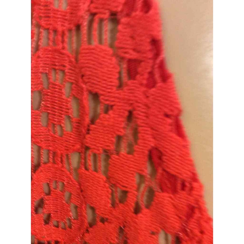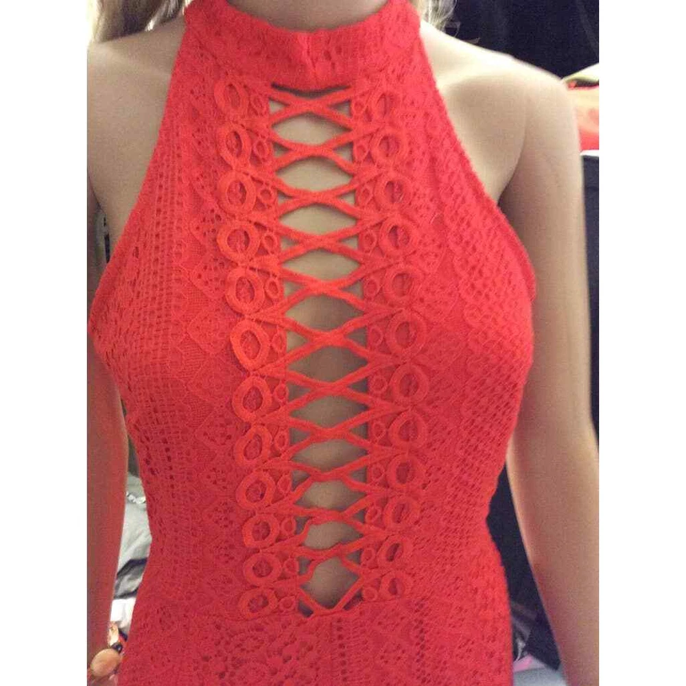 <![CDATA[<div>This is a beautiful coral laced jumper with a mid calf length. It is new with tags with no stains rips or tears. The top front has a criss cross opening from neck to waist with halter top style. The measurements are armpit to armpit 17", inseam 20", neck to hip 21", waist is 28", thigh is 11", and Total length 49". It is a size medium.