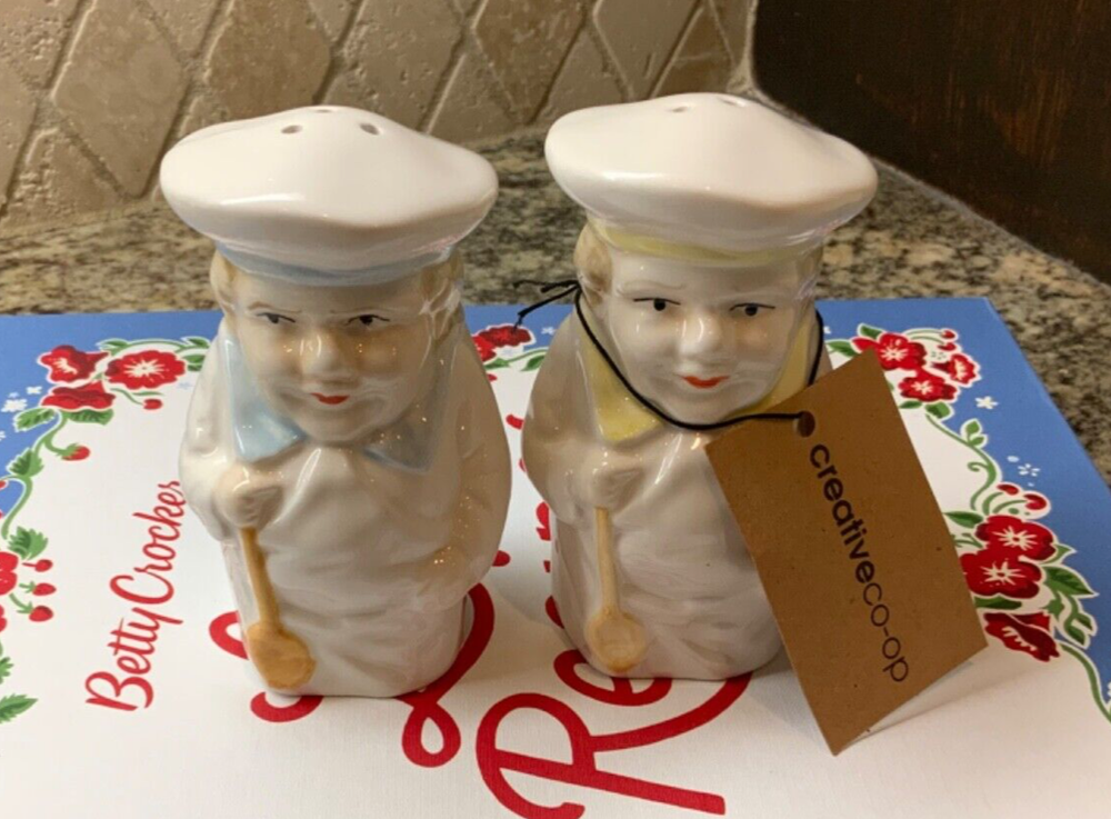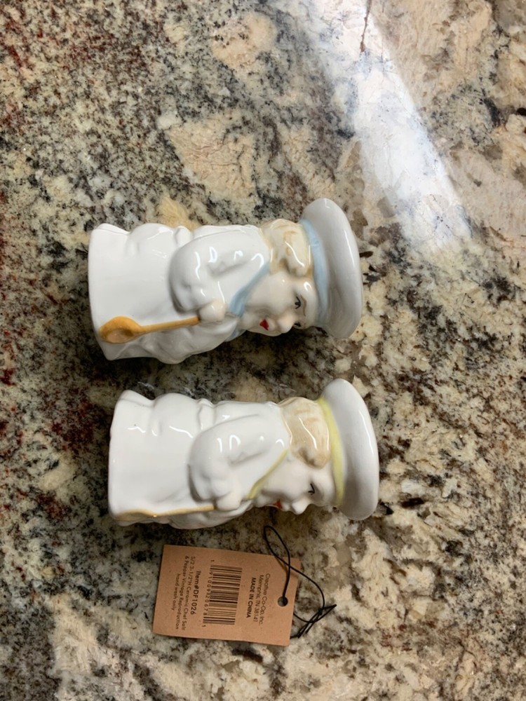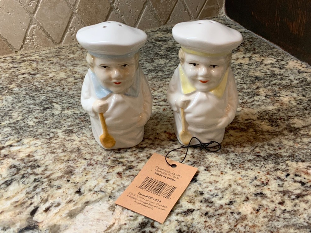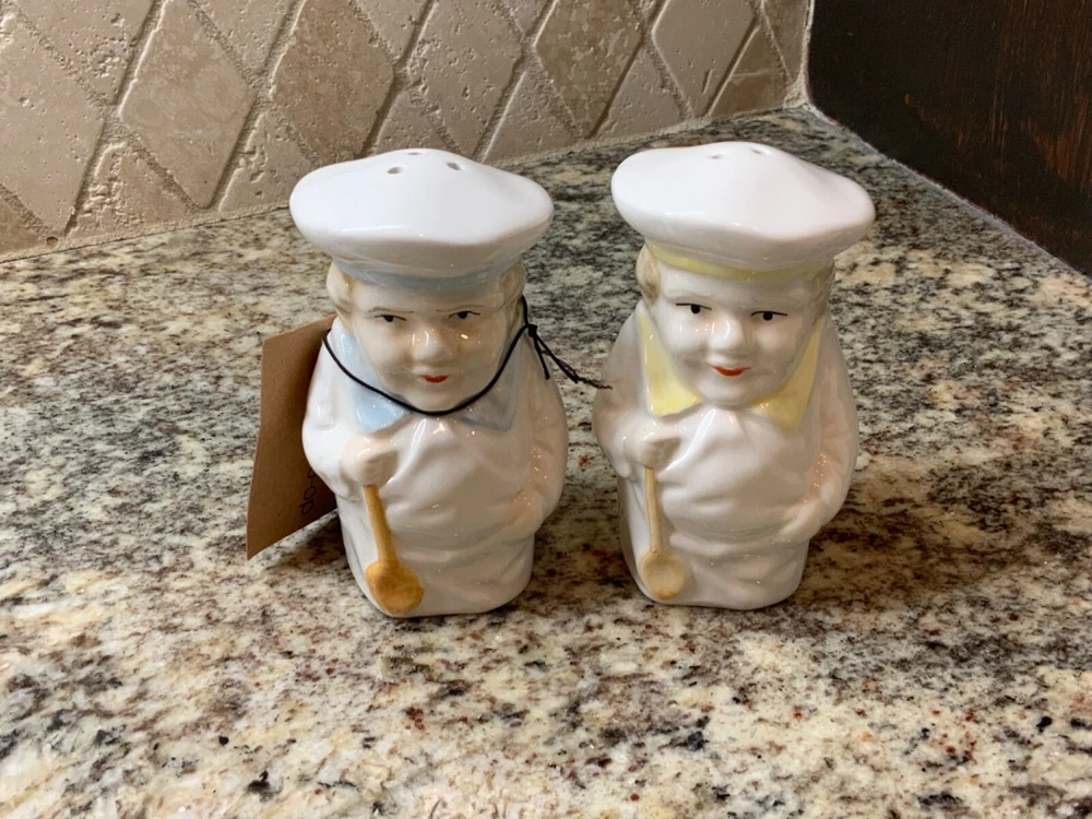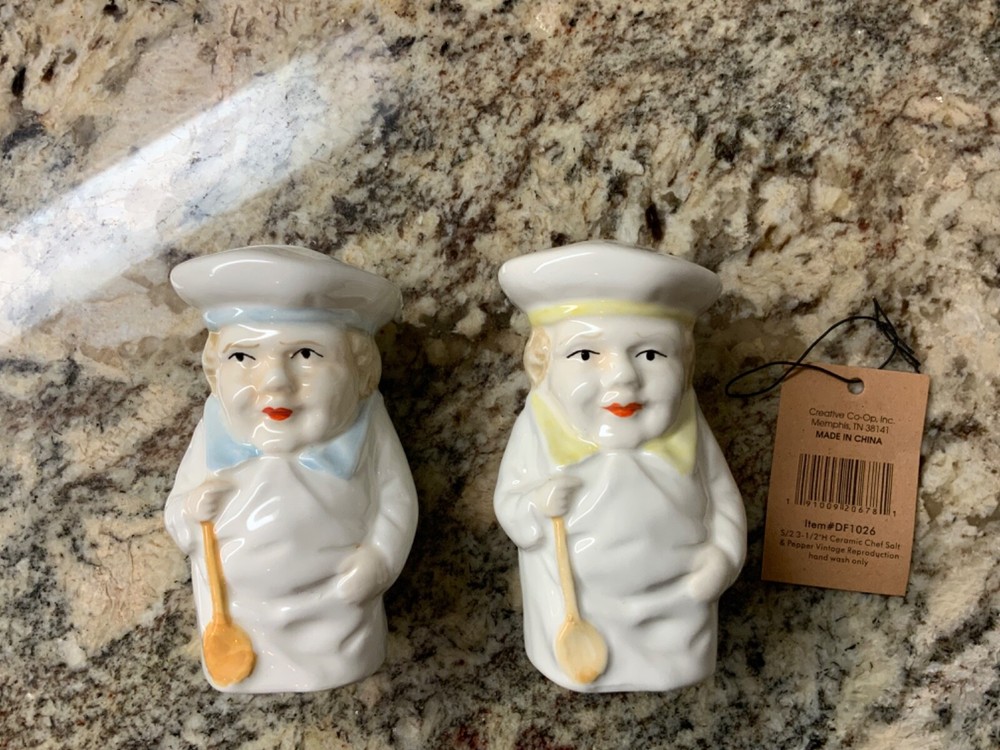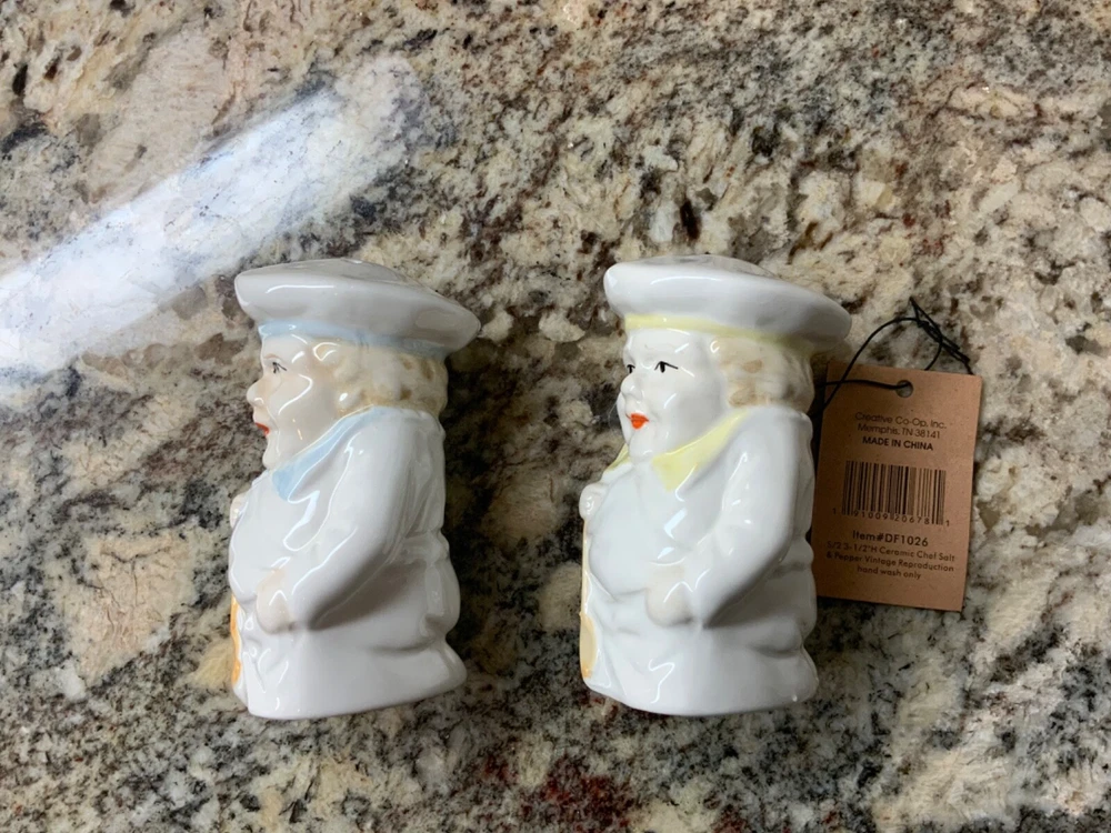 Enjoy the vintage look without worrying about breaking an antique! These adorable chubby chefs are reproductions that remind me of the Toby mugs of European collectibles. The chefs have different colored collars and hat bands so you can tell them apart - light blue has three holes for salt and the pale yellow has two holes for pepper.
