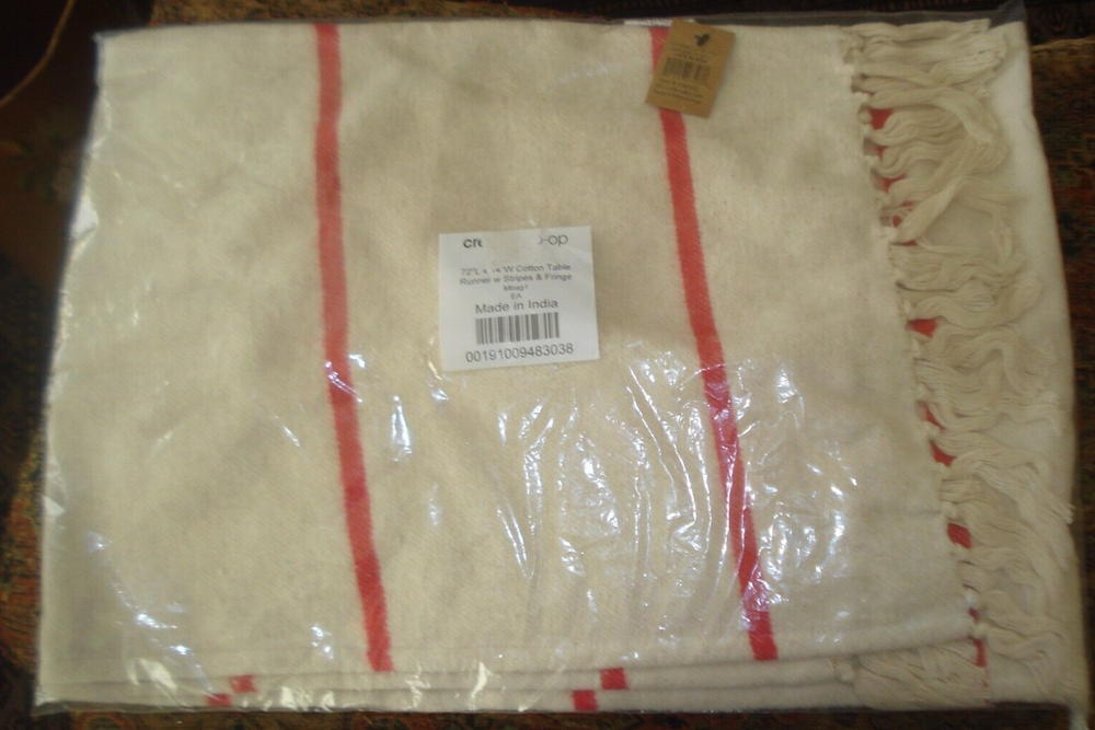 Creative Co-op 1 4" x 72" TABLE RUNNER Cotton w/Red Stripes & Knotted Fringe Made in India New in package....