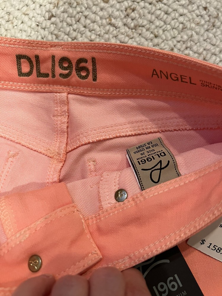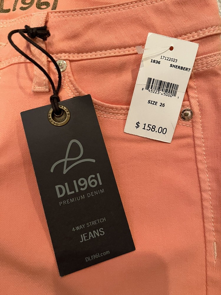 NWT DL 1961 Angel Mid Rise Skinny Ankle Jeans Size 26 The color is Orange “Sherbert“ 4 way Stretch Material 55% cotton 45% polyester Inseam approx 28” see measurement picture Original Retail $158. I am not accepting returns so please ask questions before bidding. Thanks for looking!
