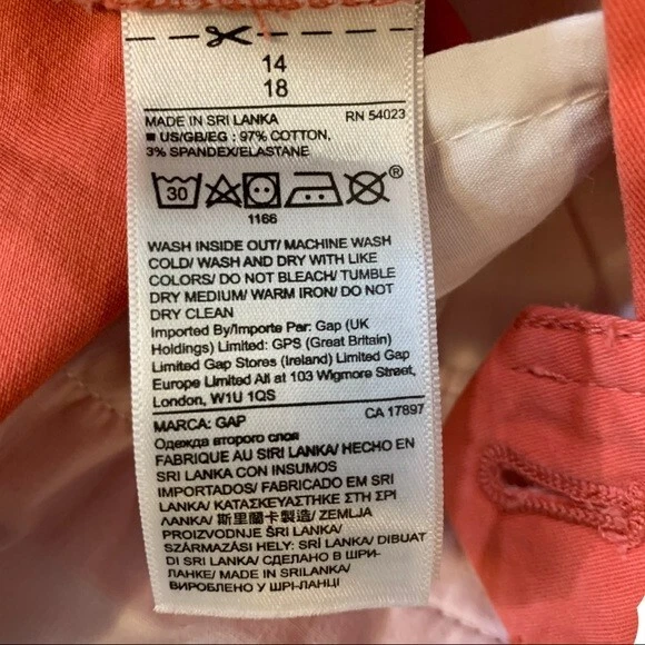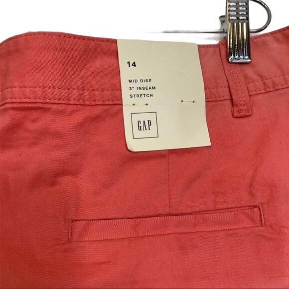 Gap shorts Size 14 New with tags Mid rise Stretch 2 bar and hook closure, zip fly Slash pockets in front Slit pockets in back Belt loops Orange/peach color I think they are probably lighter in color than they appear in the pictures Cotton, spandex blend Machine washable Laying flat it measures approximately Waist-18” across Hips-22” across Leg opening-13” across Inseam-3” Outseam-13.5” Rise-11” Please feel free to make an offer!