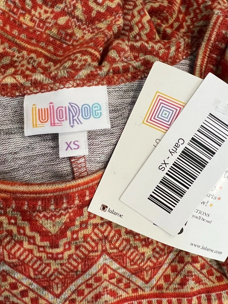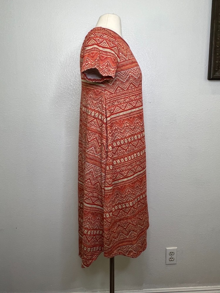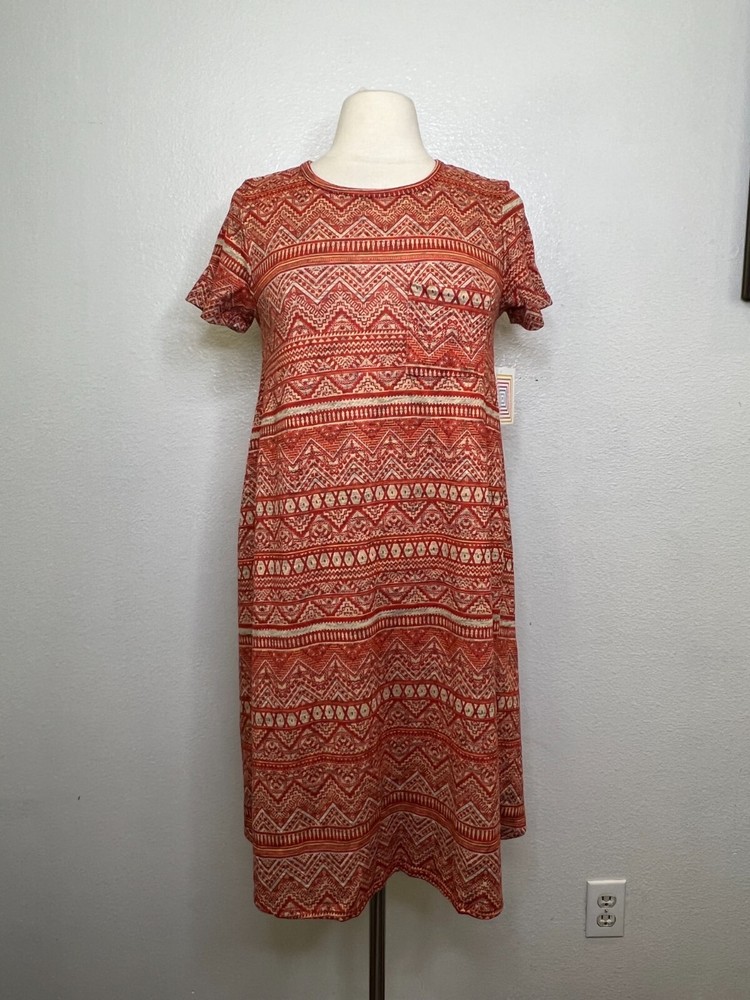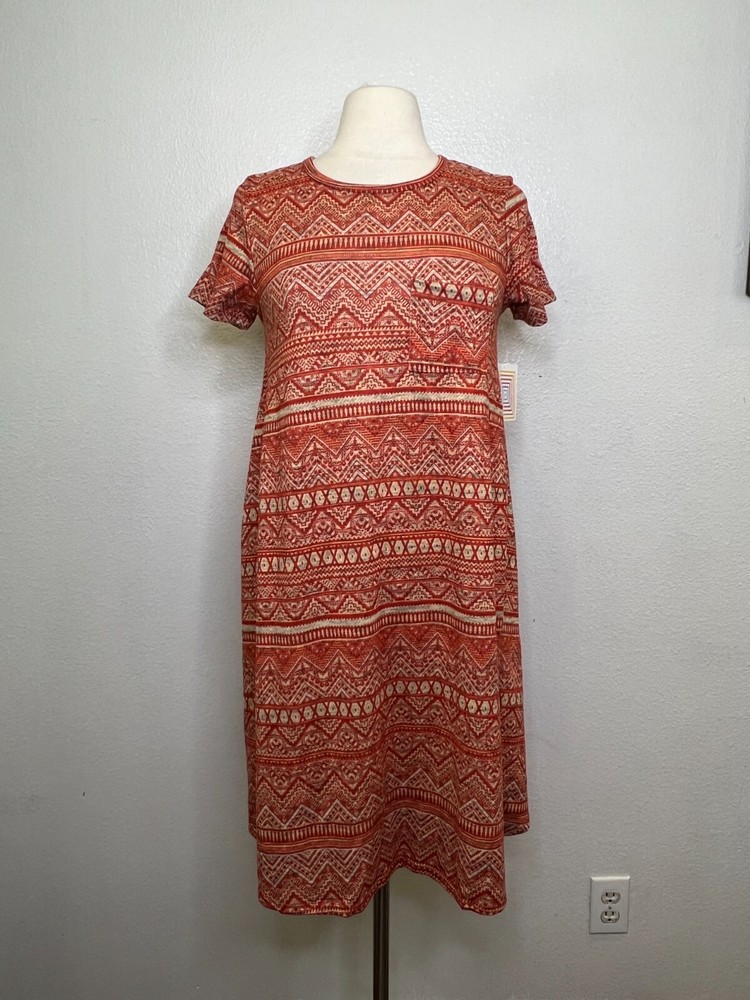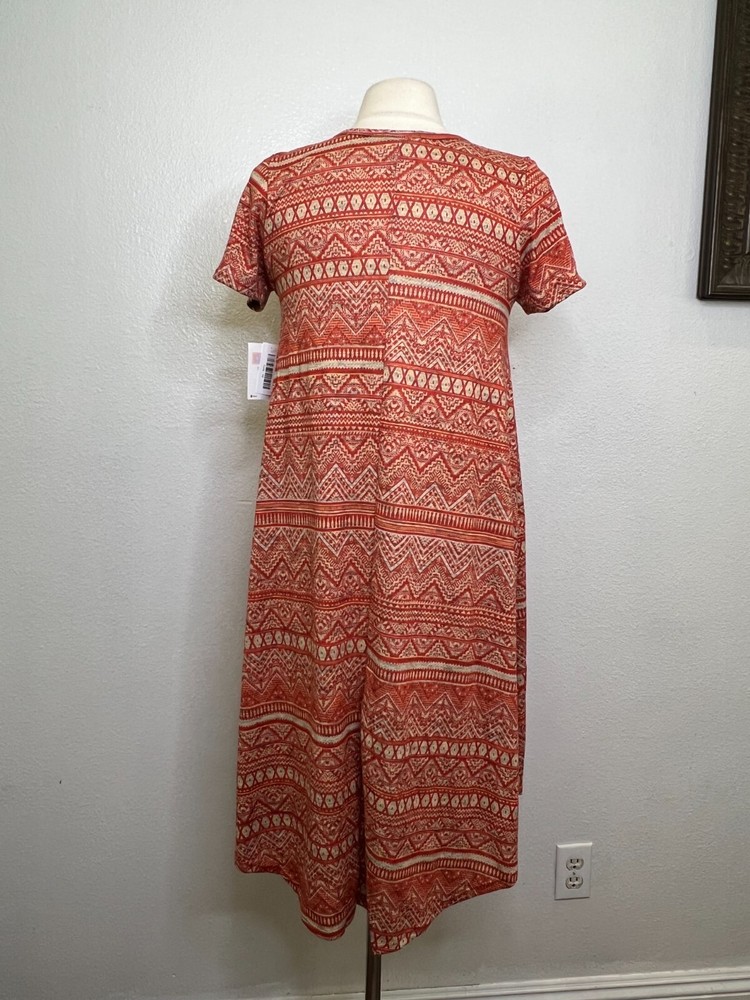 Name Brand: NWT LuLaRoe Carly Burnt Orange Tan Geometric Print Front Pocket Dress Sz XS Condition : NWT Size : XS (see measurements) Style : Carly Material: 96% Polyester 4% Spandex Always check the measurements, label sizes are not consistent. Measurements are approximate, and are of item laying flat and unstreched: Shoulder to Shoulder: 14" Bust: 16" Sleeve: 7" Waist: 19 Length: 36" front, 41" Back from shoulder to hem B3 DSS0058