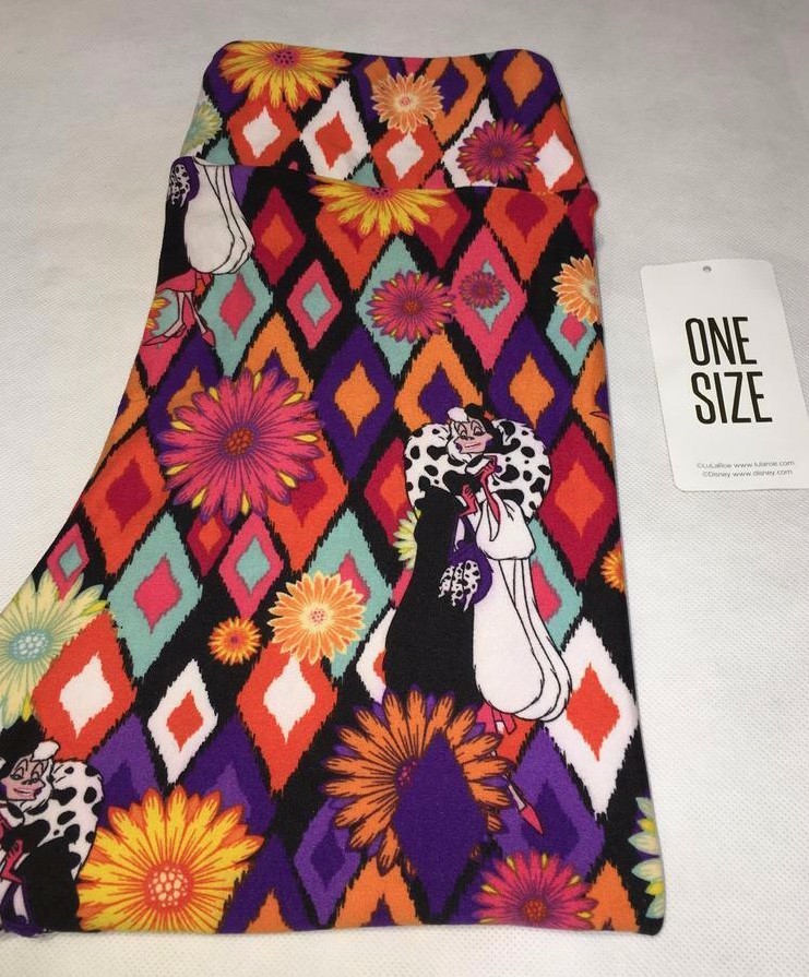 These Colorful Orange, Pink, Purple, and Blue LuLaRoe Disney OS (One Size, listed for Sizes 2 to 10) Floral Diamond Leggings in Warm Tones feature Cruella De Vil from the movie 101 Dalmatians, and are just right for your next Disney vacation, Halloween, or to wear at home anytime that you're feeling a bit villainous. You will LOVE them!