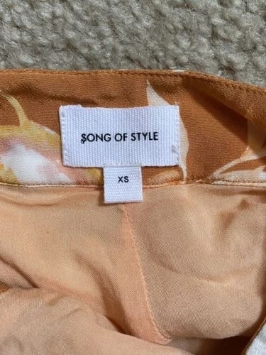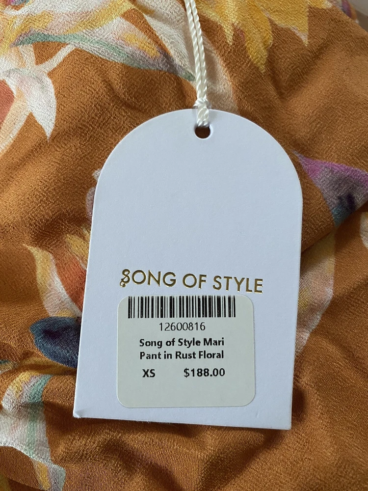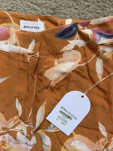 NWT RETAIL $188 SONG OF STYLE Rust Floral Orange Pant Bottoms SZ XS . Condition is New with tags. Shipped with USPS First Class Package. BRAND NEW, NEVER WORN Tags still attached. Measurements (taken when laid flat) Length: 43 inches Inseam: 31 inches Width: 24 inches Features -Contains lining for extra coverage/thickness -Zip fly with hook and bar closure -Beautiful rust floral fabric -Hand wash cold Please see images for exact fabric content. Perfect set of lightweight flowy bottoms for different occasions whether it be for the beach or even music festivals.
