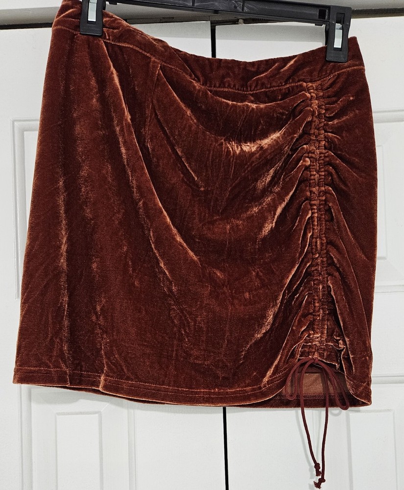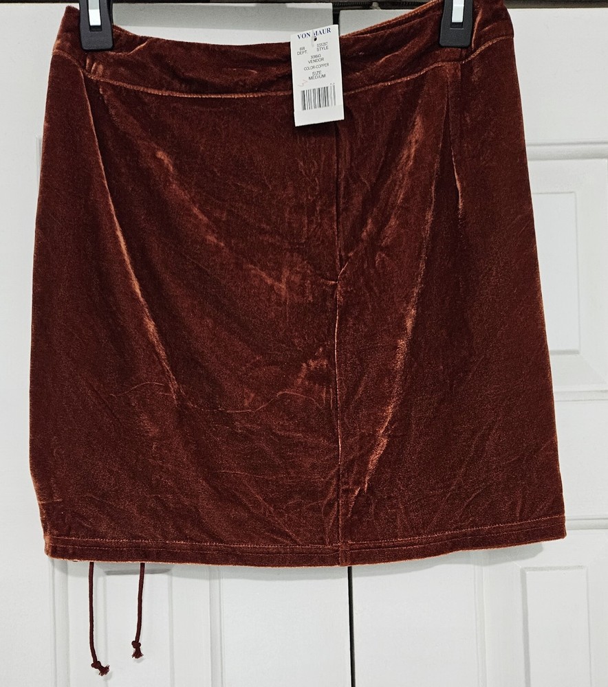 This listing is for a Shinestar, burnt orange, velvet, mini skirt, size Medium. It has a zip closure in the back and a matching vertical drawstring to adjust the length at left side in the front. It measures approximately 14-1/2" across the waist and about 17" from the top to the bottom of the hem. NWT drw2/bn10 Thank you for looking.