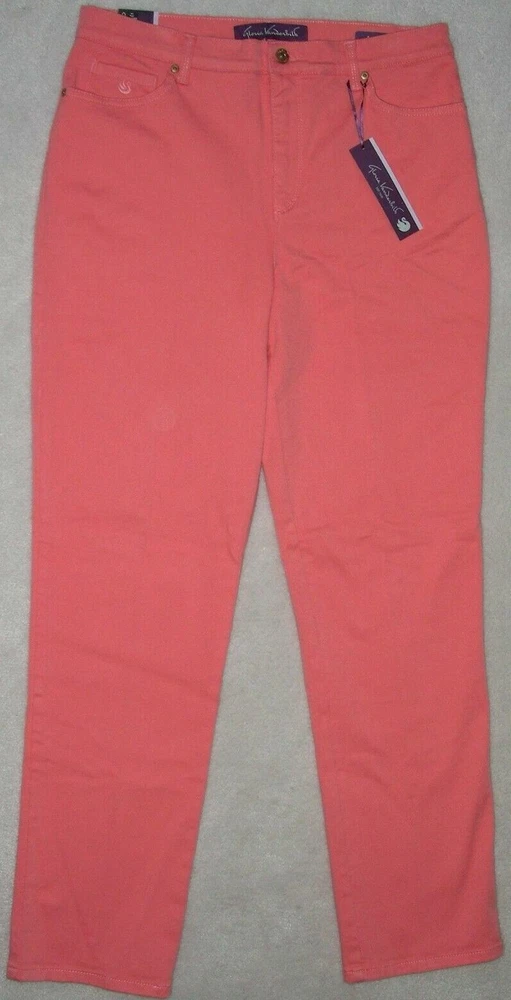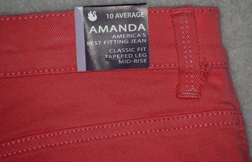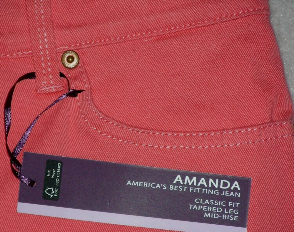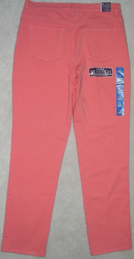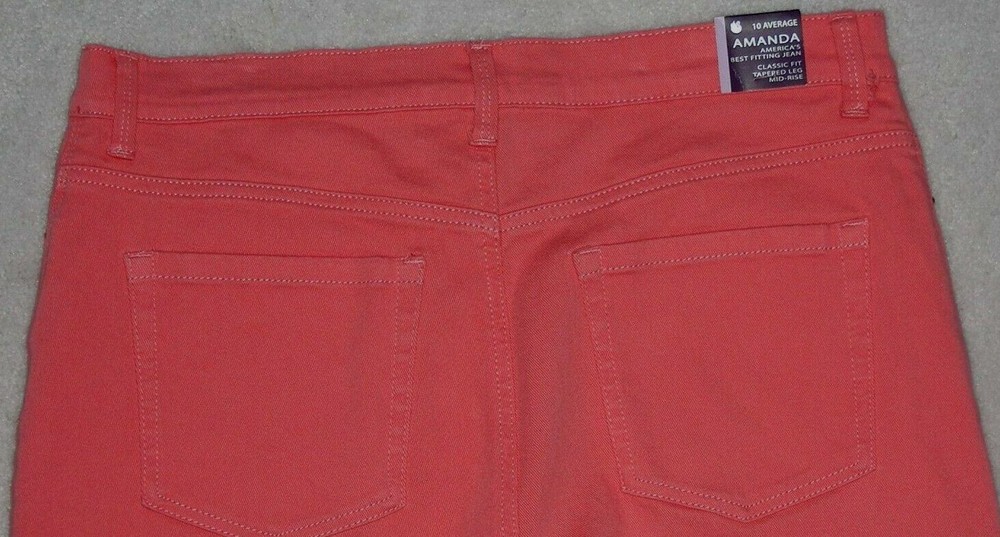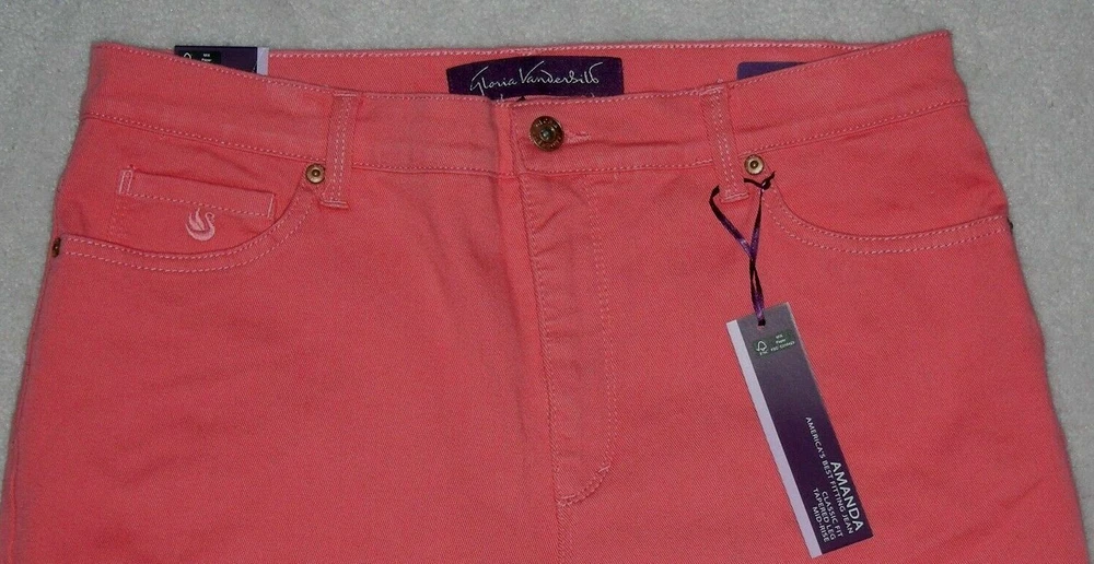 Clothing measurements shown in INCHES and US SIZES. WOMENS "GLORIA VANDERBILT" AMANDA JEANS NEW WITH TAGS SIZE 10A 10 AVERAGE These are superb quality GLORIA VANDERBILT (Classic Fit AMANDA Ultra Stretch MID-RISE Tapered Leg) stretch HEAVY DENIM jeans in a beautiful "melon orange" color. TUMMY CONTROL (cotton panel). Jeans have zipper & metal button closure, 2-scoop pockets + 1-watch pocket (front), 2-pockets (back) with tapered legs. Fabric is heavyweight & sturdy denim with tons of stretch. Even waistband has good amount of stretch. Jeans designed with comfort in mind! SUPERB QUALITY! MADE TO LAST! (Garment slightly larger than shown below to allow for shrinkage). SIZE 10A 10 AVERAGE WAIST - approx. 32-36" stretch (this is where jeans sit....BELOW actual waist) INSEAM - approx. 30" FRONT RISE - approx. 11-1/2" Back Rise - approx. 16" (crotch seam to BACK waistband) HIPS - approx. 42-50" stretch TOP OF THIGH - approx. 12-1/2" across BOTTOM OF LEG - approx. 7-1/2 "across (tapered leg) OVERALL LENGTH (top to bottom) - approx. 41-1/2" (measured outside leg seam) 98% COTTON, 2% SPANDEX MACHINE WASH & DRY WOMEN'S CLOTHING SIZES are NOT STANDARDIZED. Label size should be used a “guideline only” (as each women has a unique body shape). TO CHECK FIT " before purchase" MEASURE YOUR OWN CLOTHING and compare to measurements shown in listing. Rise will determine waist measurement (lower rise...bigger waist). If RISE shown in MY LISTING is SHORTER than YOUR RISE use MY RISE MEASUREMENT when you measure YOUR OWN PANTS (FIRST measure rise (from crotch seam up toward waistband) then measure across, that will give you waist measurement). BOX CC Inv#6426