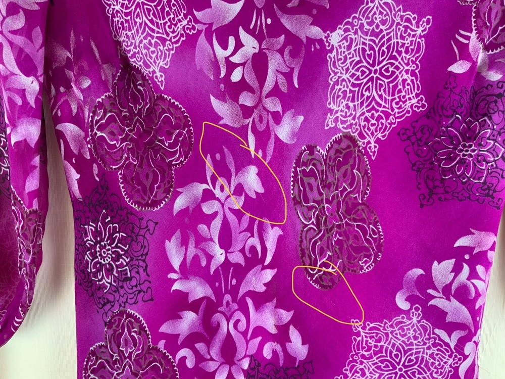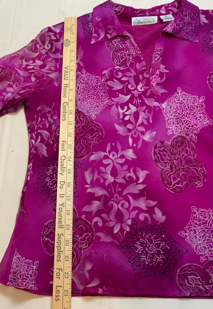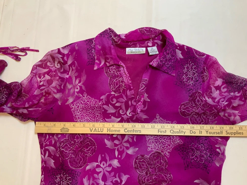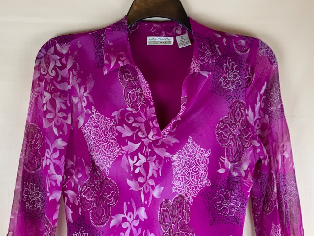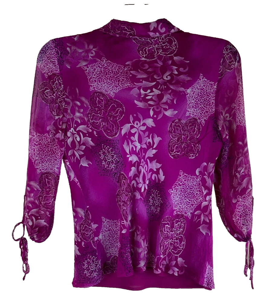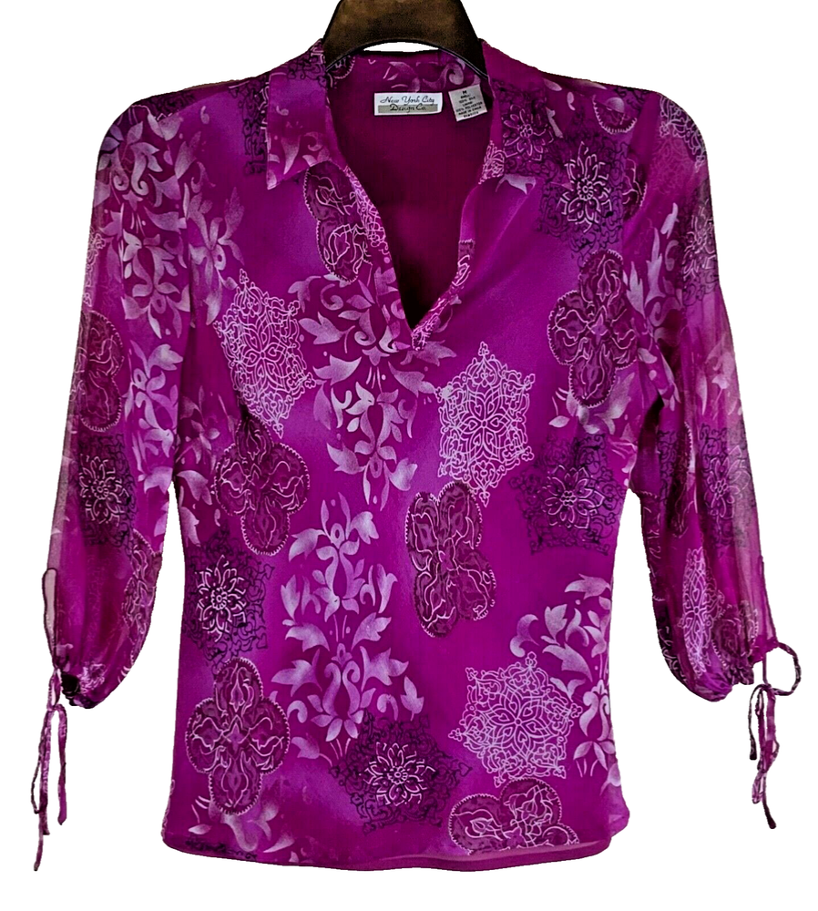 NYC Designs Co Silk Blouse women Sz M Boho V-Neck Lined 3/4 Sleeve Purple. 3/4 Tie-Sleeves, Geometric/Abstract Pattern. Fully Lined, except for sleeves. Theres a couple of threads missing from front, difficult to see in circled photos, Otherwise VGUC. B118