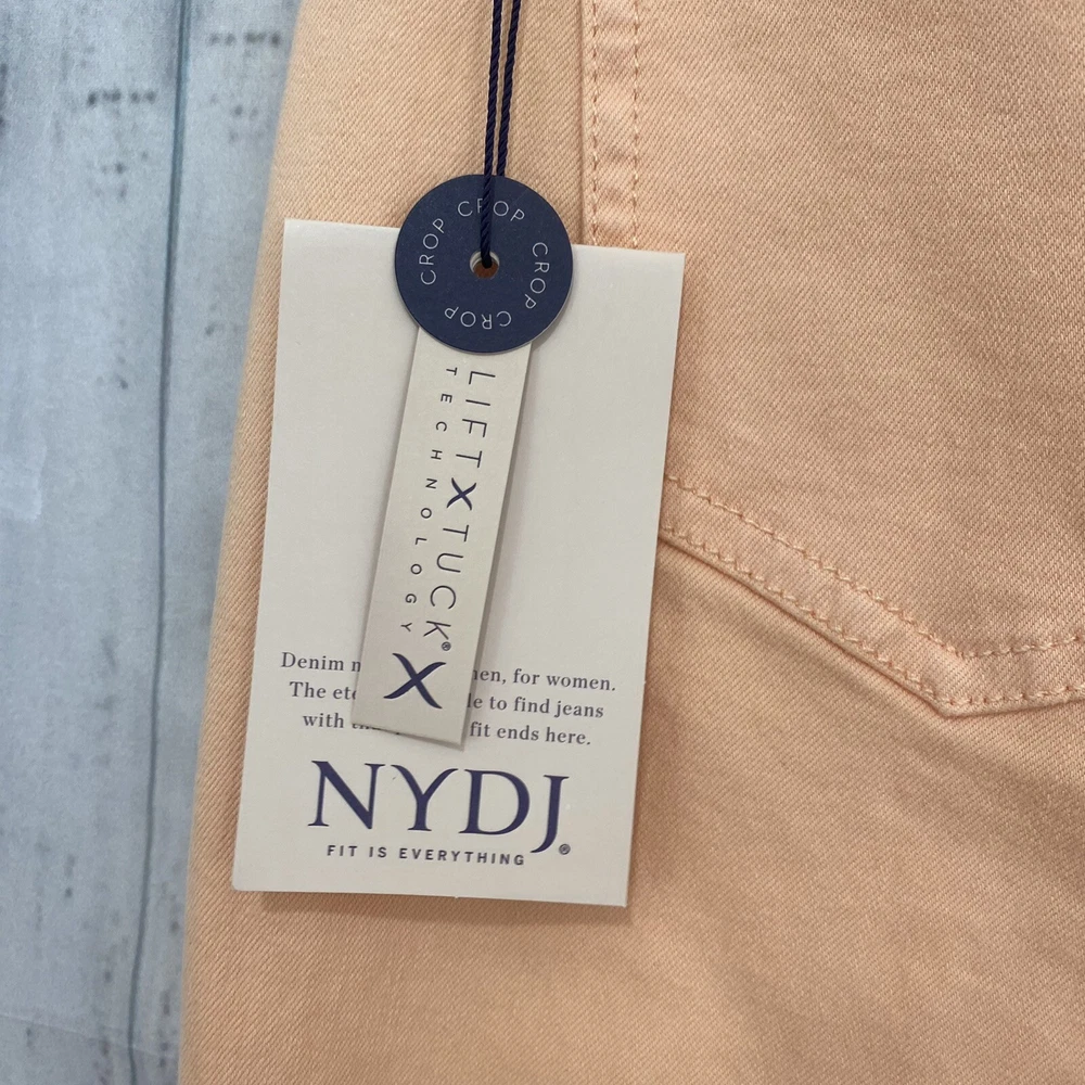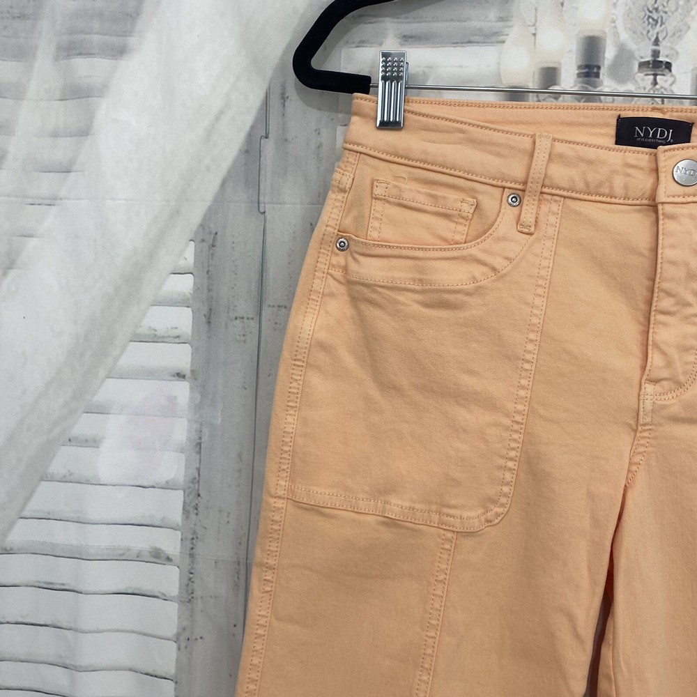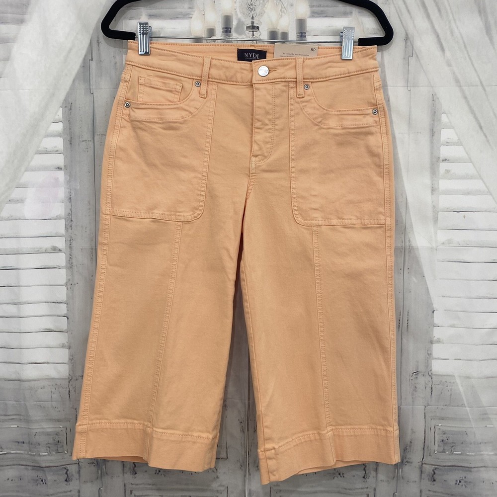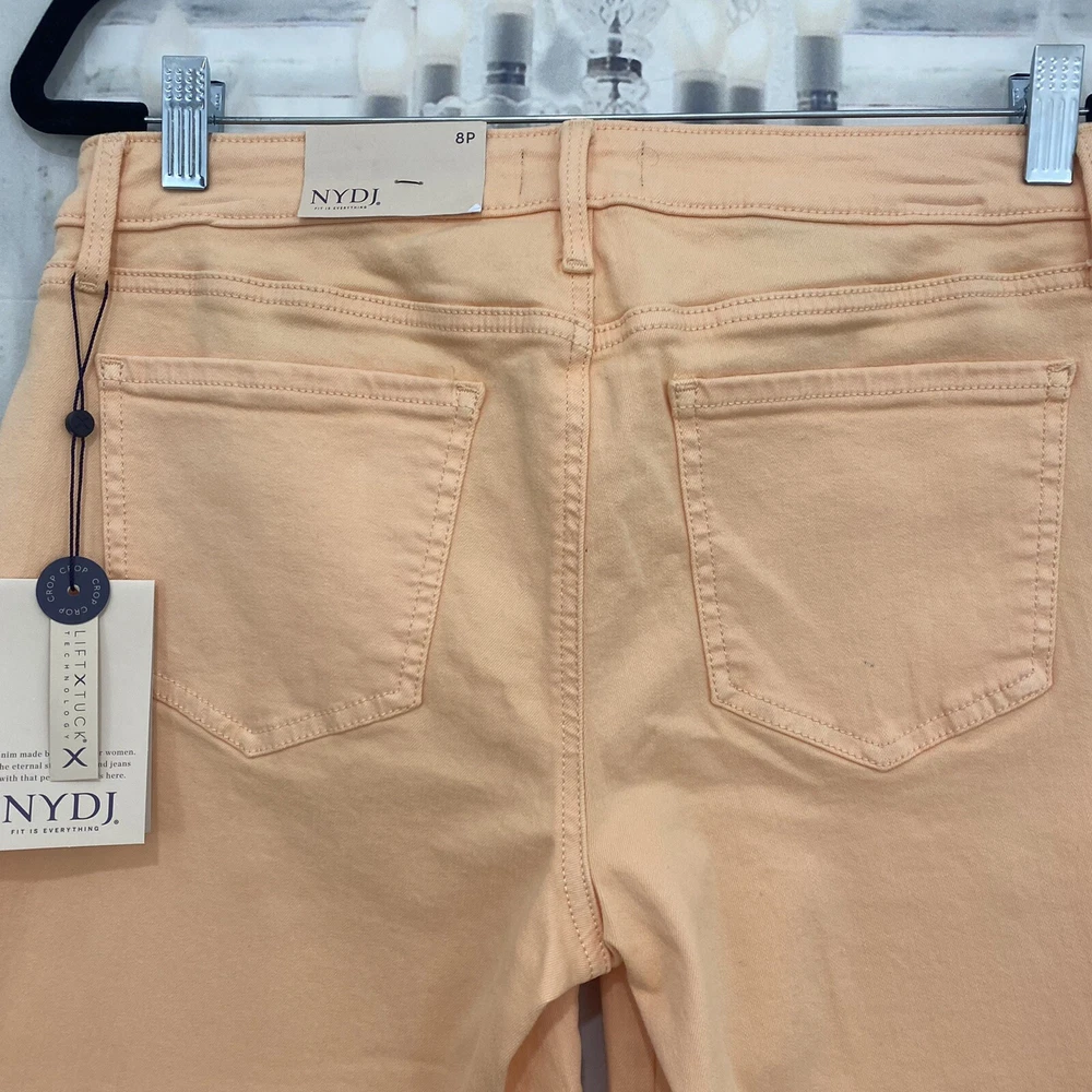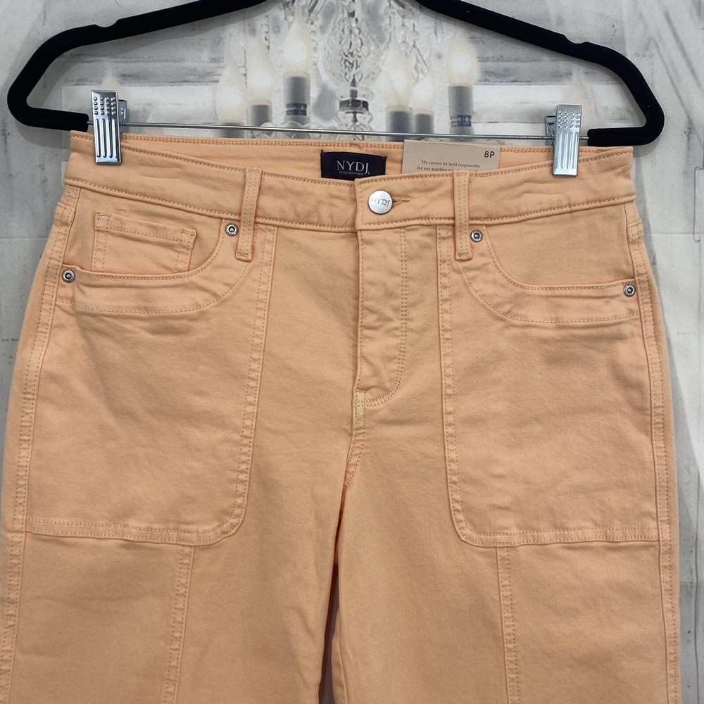 NYDJ Size 8P 8 Petite Melon Orange Crop Capri Denim Jeans Mid Rise 17.5" Inseam Size: 18 Petite New with tags. A small spot on the back pocket. Measurements were taken with garment lying flat and are approximate: Waist: 15" Rise: 9.5" Inseam: 17.5" Thank you so much for looking and please check out the other items in our store!