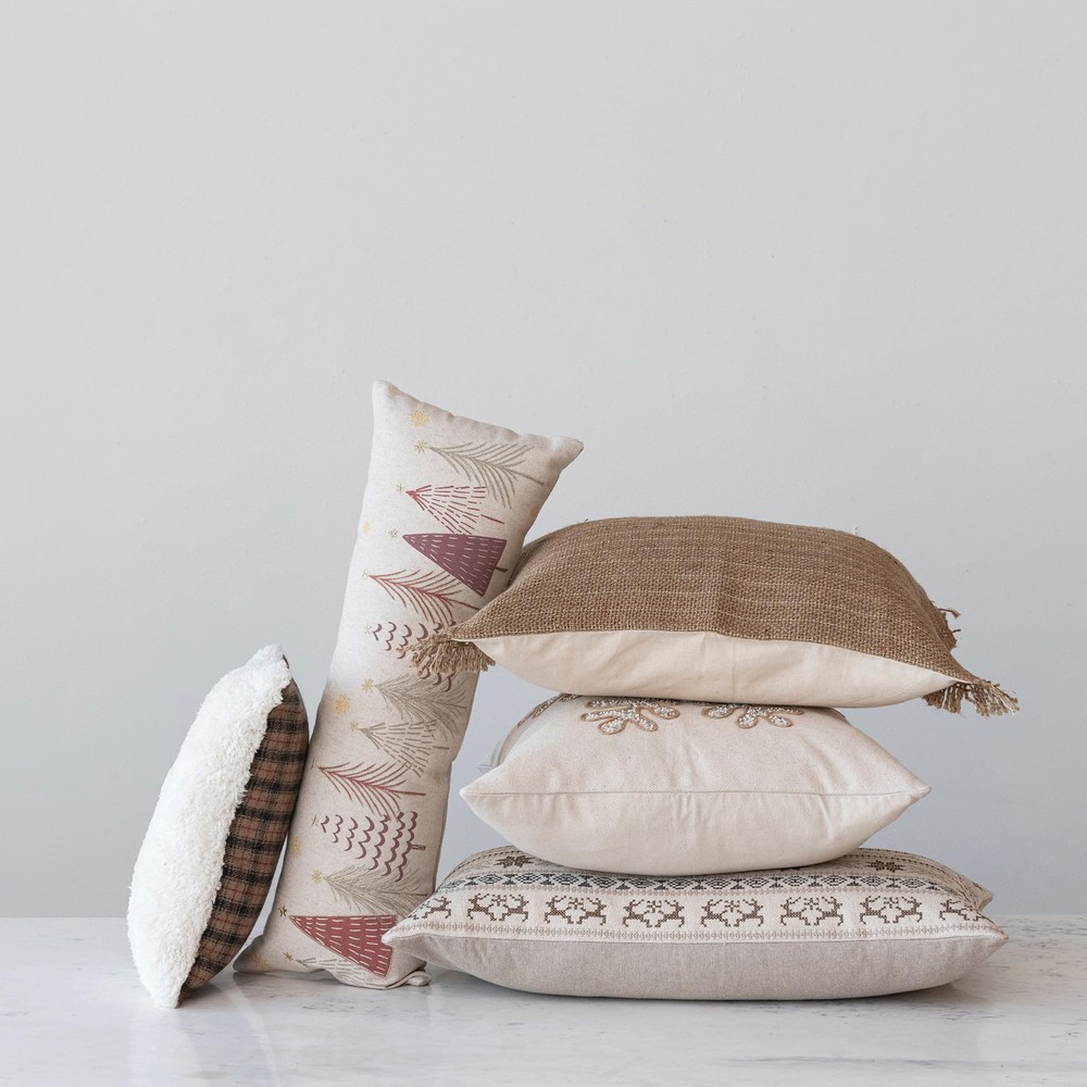This square pillow captures the serene beauty of winter with its cotton canvas cover, meticulously embroidered with a snowflake motif and accented with shimmering beads. The natural, white, and gold color scheme evokes a sense of peaceful winter nights, while the durable polyester fill ensures comfort and longevity. It measures 18.0 in length, and 18.0 in height, making it a versatile addition to any seating area. The pillow's elegant design adds a touch of sophistication to any room, making it perfect for creating a cozy and inviting atmosphere during the colder months. Its high-quality materials and craftsmanship both style and durability for seasons to come. A sophisticated square pillow crafted from cotton canvas, featuring an elegant embroidered snowflake adorned with delicate beads in natural, white, and gold hues An exquisite piece to grace any winter decor, this pillow seamlessly blends with both festive themes and chic, neutral palettes A plush polyester fill gives this pillow a full, firm shape A natural cotton canvas cover encases the soft fill, ensuring a combination of rustic charm and enduring quality 18” L x 18” W