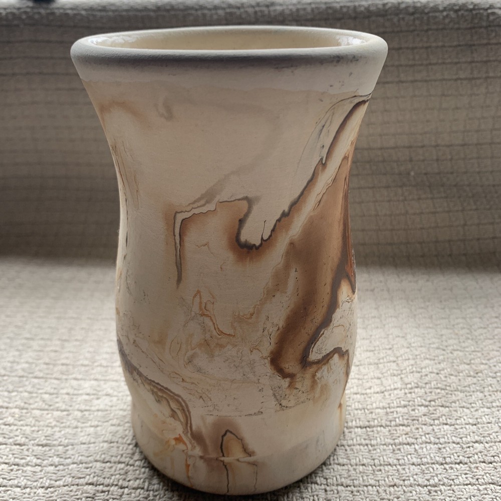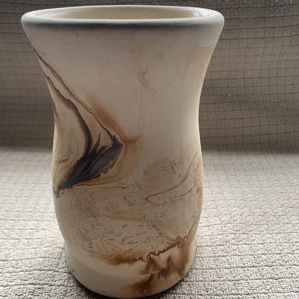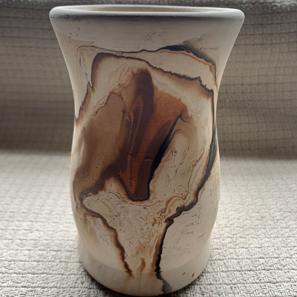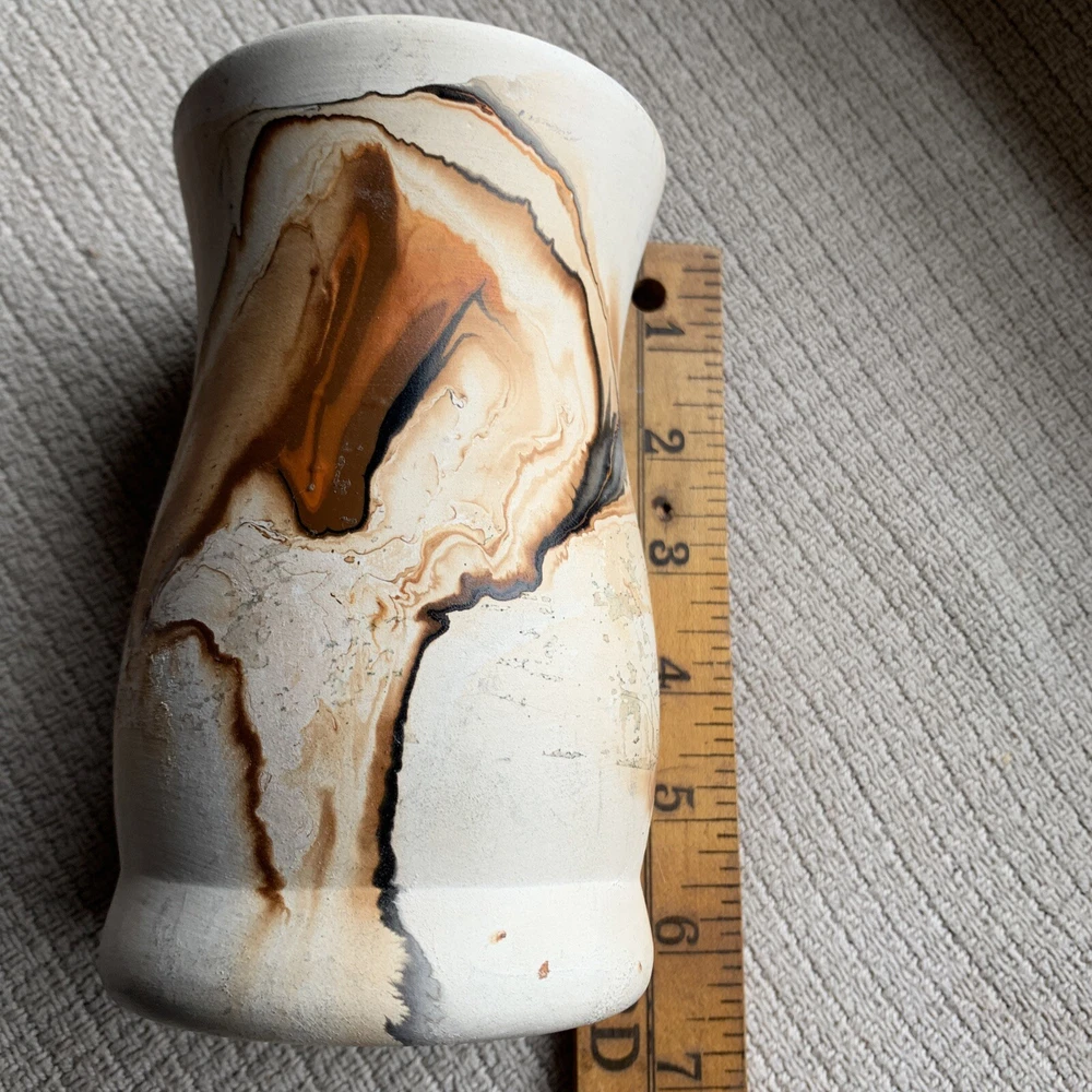 Nemadji Pottery USA 6” Vase beige browns some orange swirls Mid South Western. This is a nice piece of pottery with no cracks or chips. I love how every one of these has its own design. What a beautiful piece of pottery!!! Enjoy!