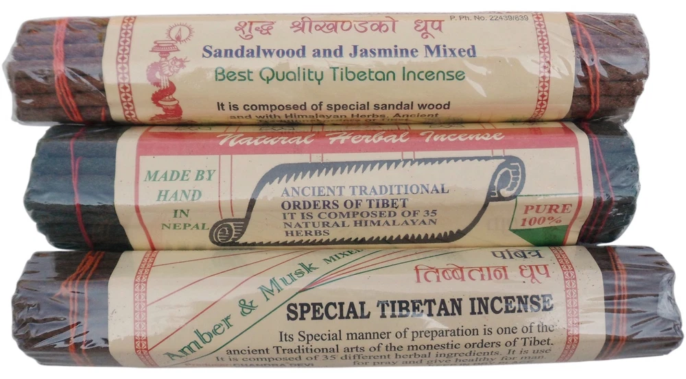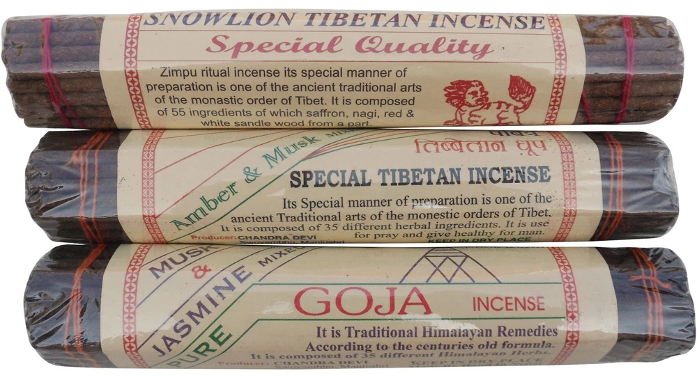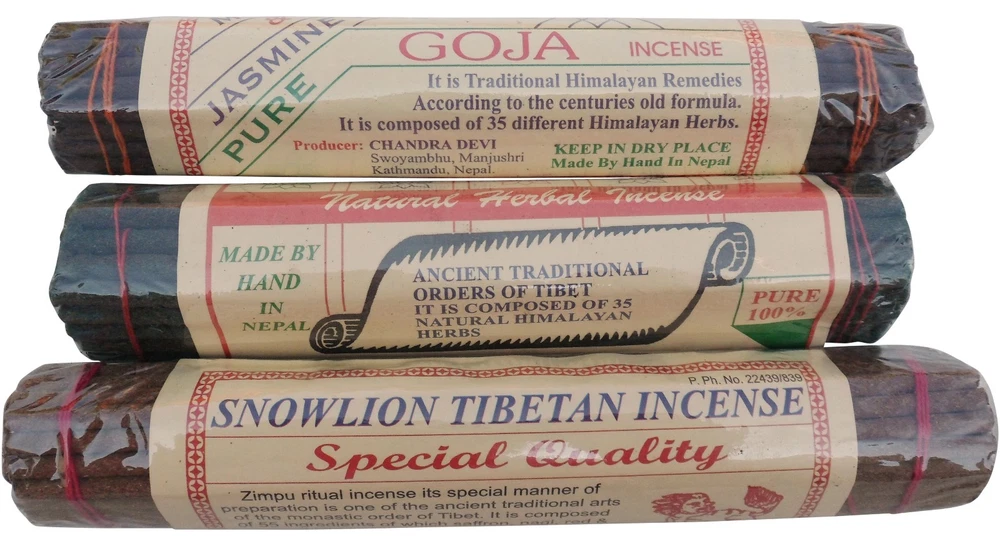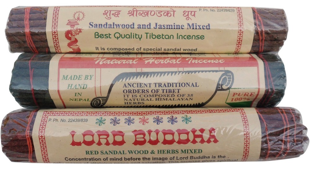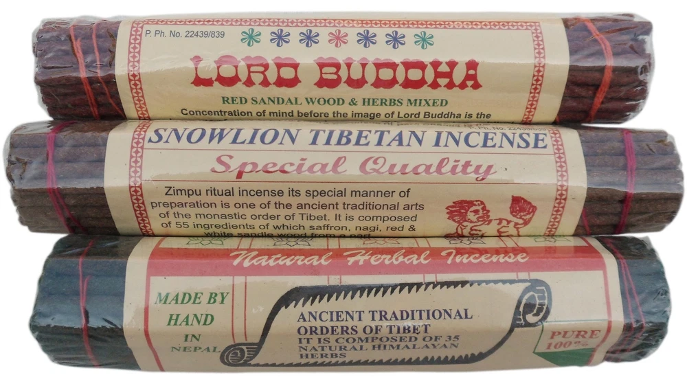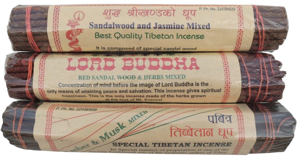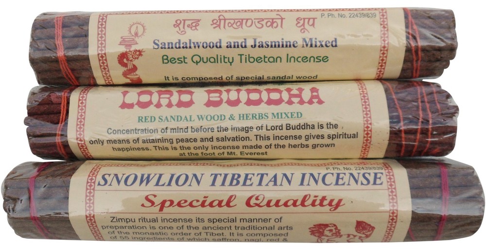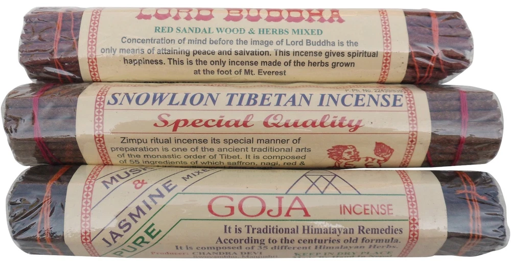 MULTI-PACK OF 3 INCENSES - CHOICE OF DIFFERENT COMBINATIONS OF THE 6 AROMAS LISTED BELOW: Nepalese 6 Aromas Incense - Made for us by Chandra Devi in Kathmandu, Nepal Unlike traditional Joss sticks this Herbal Incense contains no central wooden stick making this product suitable for people who have chest and breathing difficulties. Lord Buddha Sandalwood Incense This hand rolled Tibetan/Nepalese Incense is made from a high percentage of red sandalwood with herbs. The natural ingredients combine to produce a grounding and meditational effect. Each Packet contains approx 40-45 sticks per packet measuring 17 cm in length. Sandalwood & Jasmine - Tibetan Incense This hand rolled Traditional Tibetan Incense is made from a blend of Himalayan herbs with Sandalwood & Jasmine - Prepared with great care in accordance with traditional Monastic Tibetan Life. Contains approx 40-45 sticks per packet. Each stick measures approx 17 cm. Goja Incense This hand rolled Nepalese Incense is made from 35 different Himalayan Herbs - Major constituents include Musk & Jasmine for their uplifting effect. The natural ingredients combine to produce a traditional Himalayan remedy from a centuries old formula. Contains approx 40-45 sticks per packet measuring 17 cm in length. Natural Herbal Incense This hand made Incense is prepared from an ancient traditional recipe and is composed of 35 Himalayan Herbs. Contains approx 40-45 sticks per packet measuring 17 cm in length. Special Tibetan Incense Amber and Musk This hand rolled Tibetan Incense is made from 35 different Himalayan Herbs - Major constituents include Amber & Musk. Contains approx 40-45 sticks per packet measuring 17 cm in length. Snow Lion Incense This Zimpu ritual Incense is prepared from ancient traditional recipes from the Monastries of Tibet. Composed of 55 ingredients of which Saffron, Nagi, Red & White Sandalwood form a part. Contains approx 40-45 sticks. Each stick measures approx 17 cm Please note: International buyers may need to pay additional charges that are not included in the total price displayed at checkout such as VAT, duty and an import processing fee from the carrier. If in doubt you should check with your national tax administration. Unlike traditional Joss sticks this Herbal Incense contains no central wooden stick making this product suitable for people who have chest and breathing difficulties. This hand rolled Traditional Tibetan Incense is made from a blend of Himalayan herbs with Sandalwood & Jasmine - Prepared with great care in accordance with traditional Monastic Tibetan Life. This hand rolled Nepalese Incense is made from 35 different Himalayan Herbs - Major constituents include Musk & Jasmine for their uplifting effect. This hand rolled Tibetan Incense is made from 35 different Himalayan Herbs - Major constituents include Amber & Musk. Please note: International buyers may need to pay additional charges that are not included in the total price displayed at checkout such as VAT, duty and an import processing